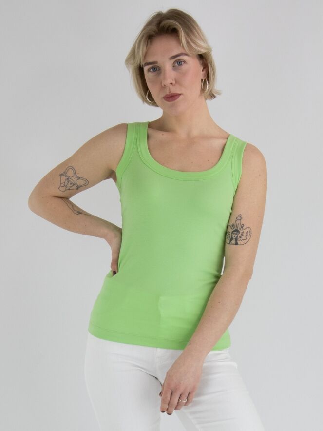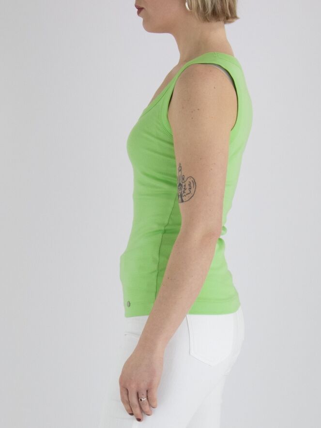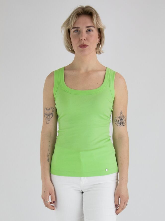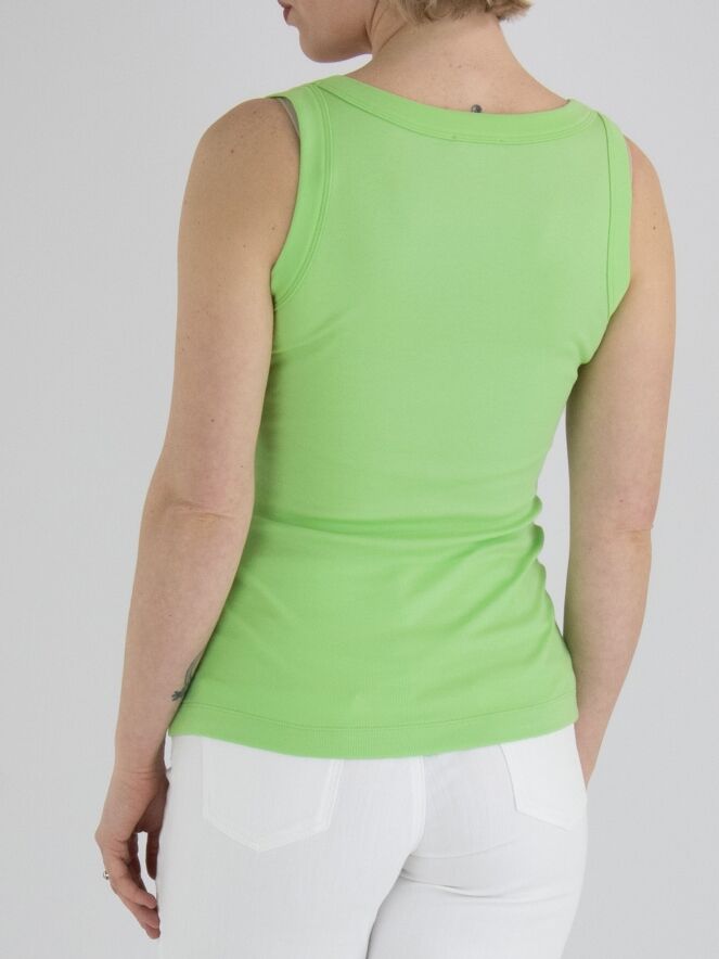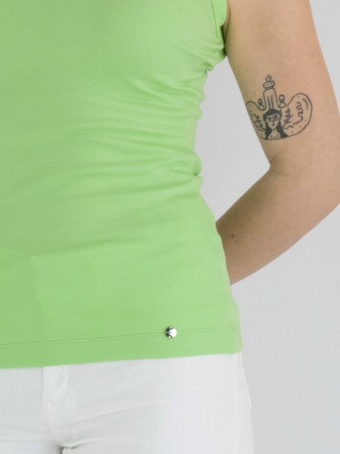 Een top van Marc Cain in de kleur pistachegroen. De top heeft een ronde hals en de stof is fijn geribbeld. Deze top mag op 30 graden worden gewassen.