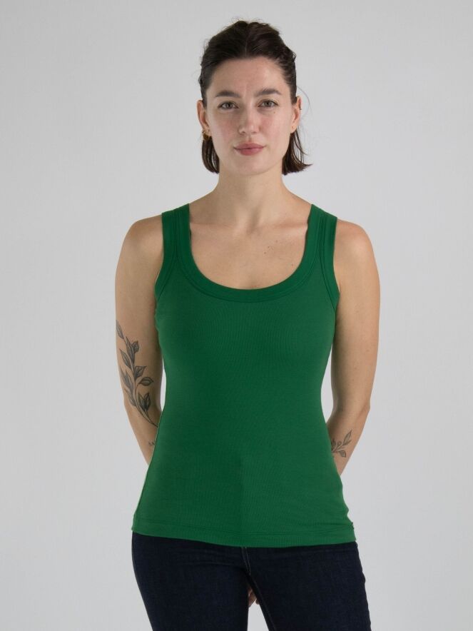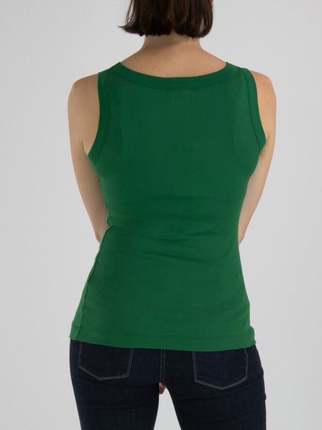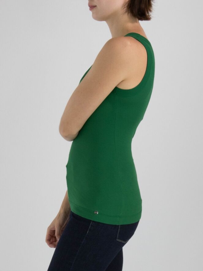 Een top van Marc Cain in de kleur donkergroen. De top heeft een ronde hals en de stof is fijn geribbeld. Deze top mag op 30 graden worden gewassen.