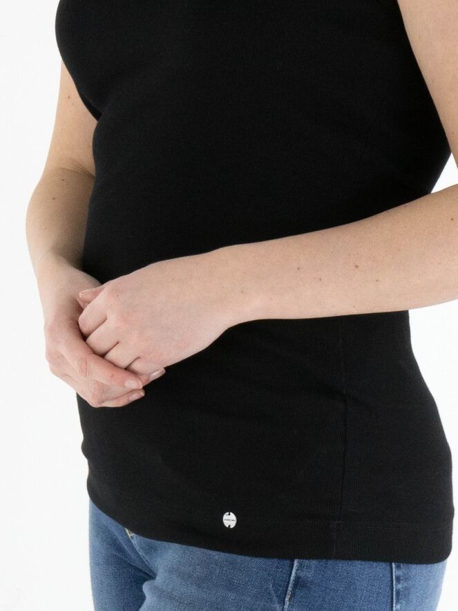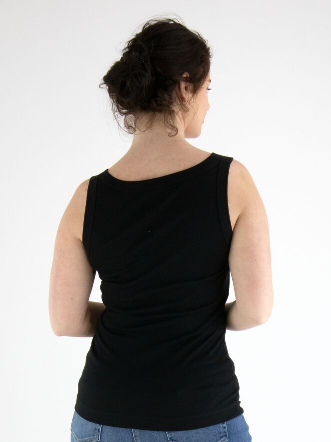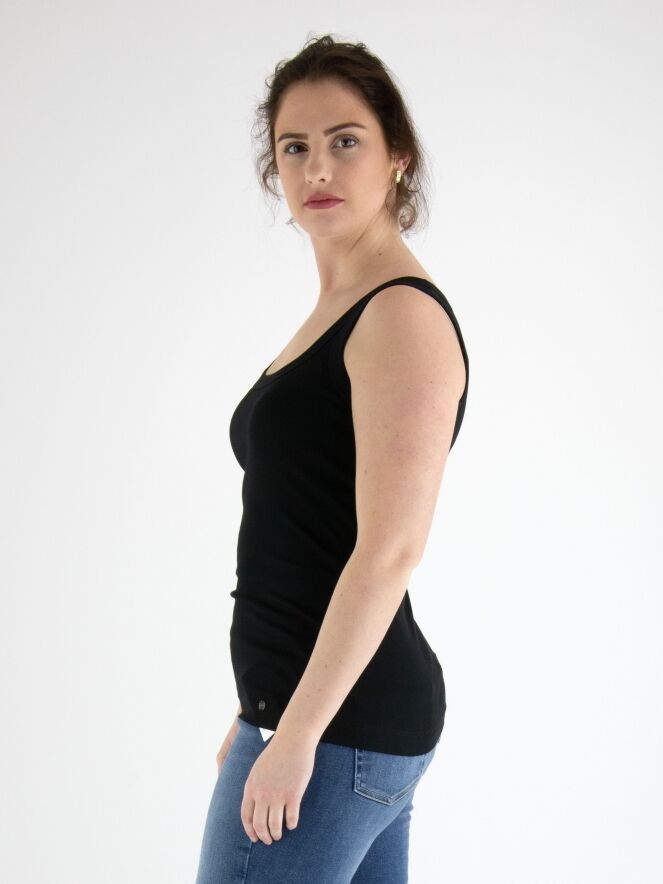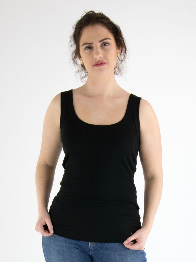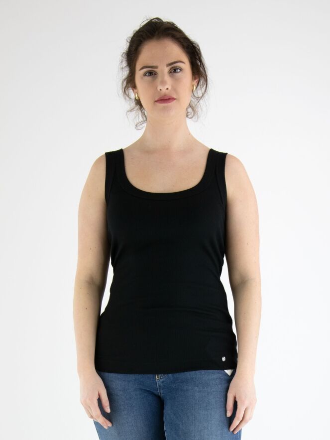 Een basis top van het merk Marc Cain essentiels in de kleur zwart. De top heeft een ronde hals en is licht getailleerd. De schouderbandjes zijn 3 cm breed. Deze top mag op 30 graden worden gewassen.