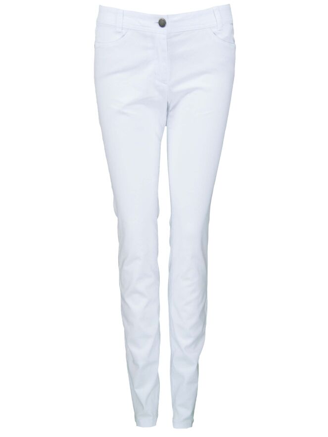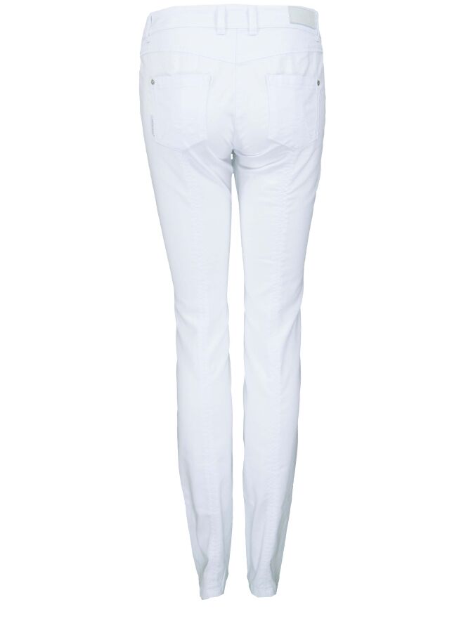 Een broek van het merk Marc Cain in de kleur wit. De broek heeft slank gesneden pijpen en mag op 30 graden worden gewassen.
