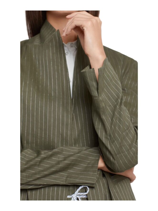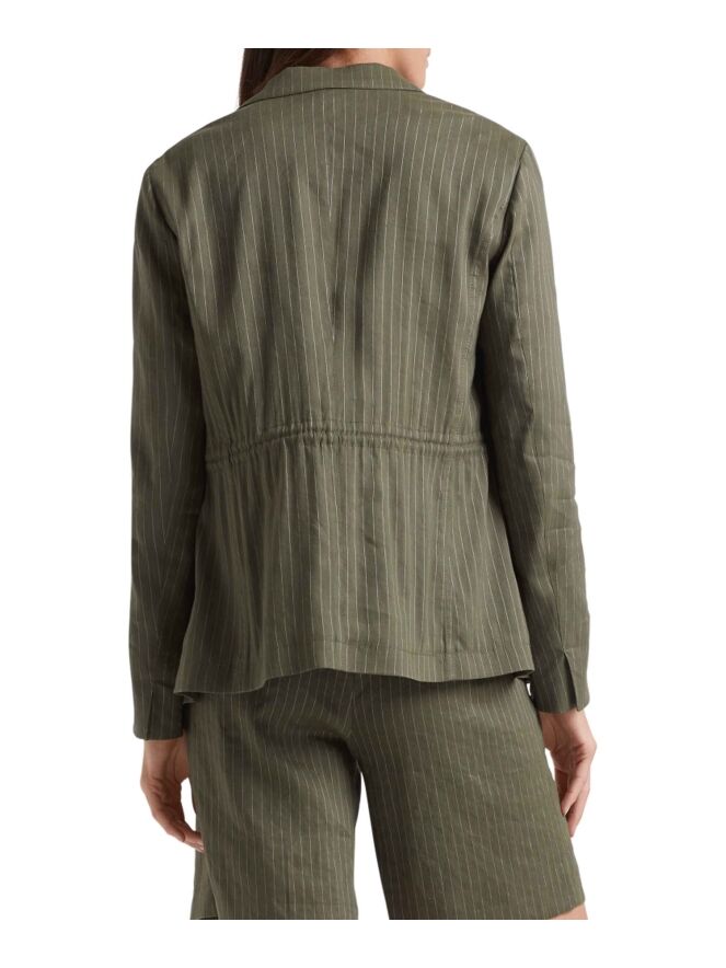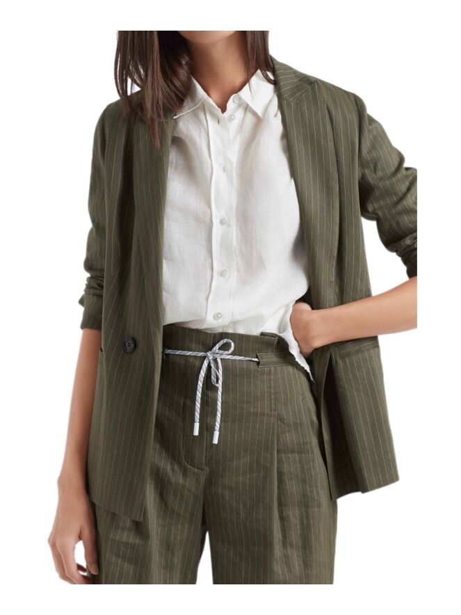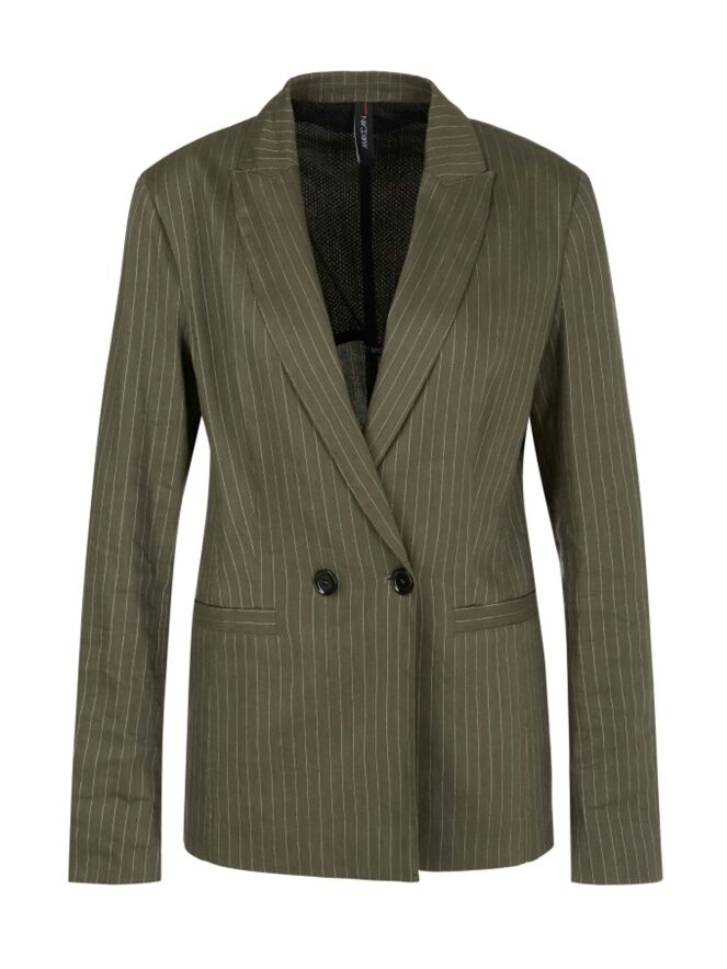 Een double brazzed blazer van Marc Cain in een krijtstreep met de kleuren olijfgroen en wit. De blazer is half gevoerd en mag op 30 graden worden gewassen.