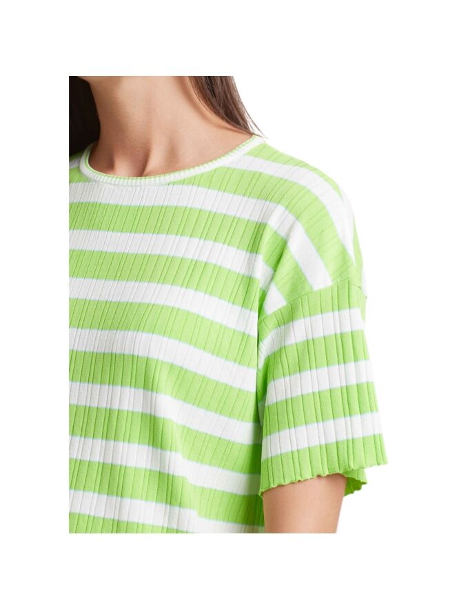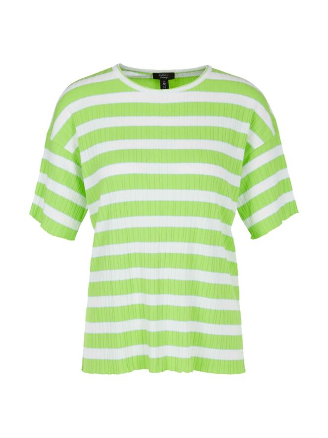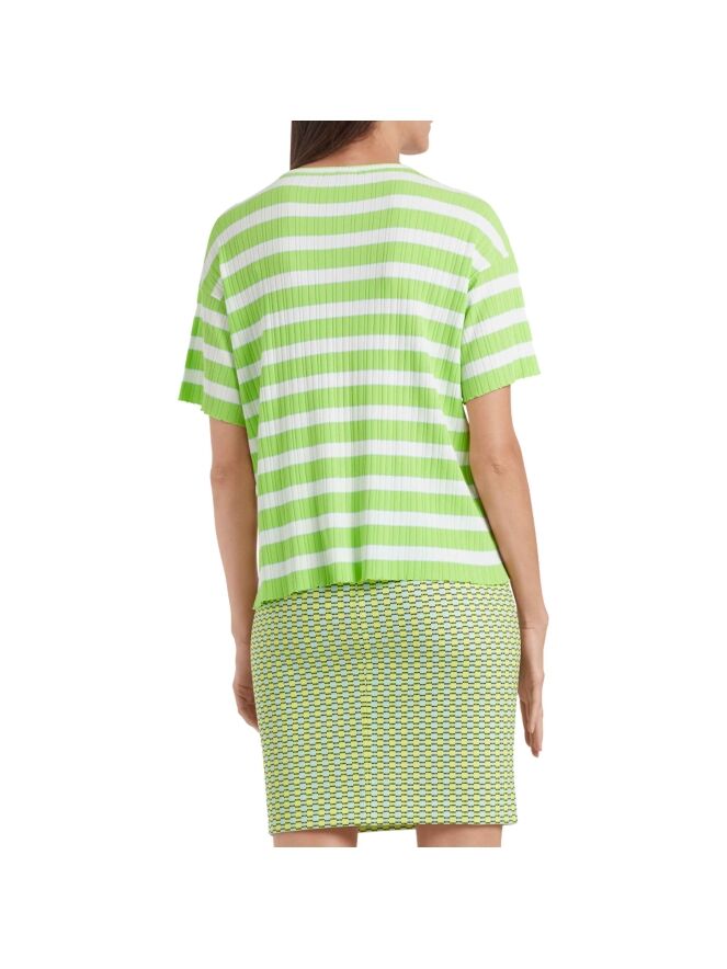 Een pullover van Marc Cain in een strepen patroon met de kleuren limegroen, ijsblauw en wit. In de stof is een verticaal strepen patroon geweven. Langs de rand van de ronde hals is een bies in de kleur wit met limegroen. Deze pullover mag op 30 graden worden gewassen.