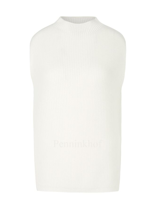 Een gebreide top van Marc Cain in de kleur roomwit. De top heeft een turtle hals en aan de onderkant zijn korte splitten aan de zijkanten. Aan de linker onderkant is een kort decoratief lint. Deze top mag op 30 graden worden gewassen.