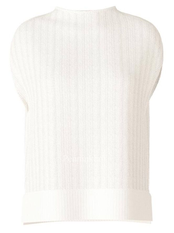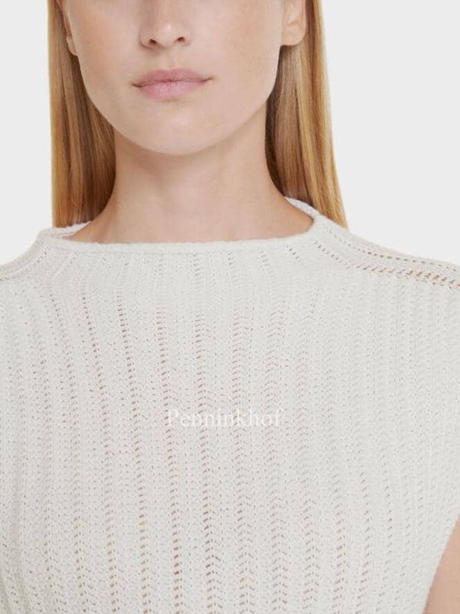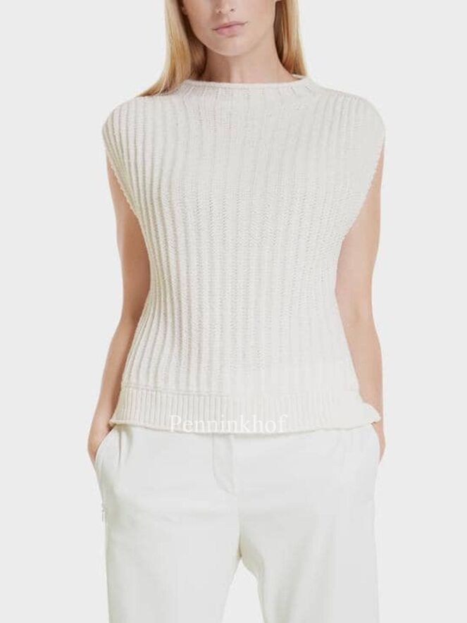 Een grof gebreide spencer van Marc Cain in de kleur roomwit. De spencer heeft een hoge hals. Aan de onderkant is een brede boord en aan de zijkanten is een kort splitje. Deze spencer mag op de hand worden gewassen.