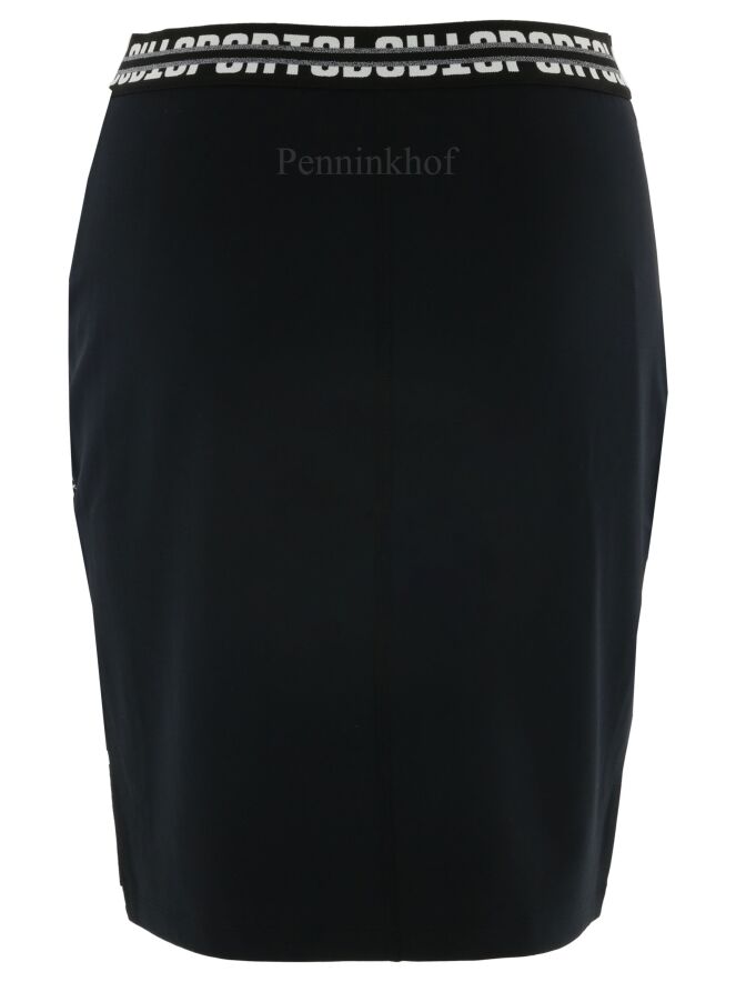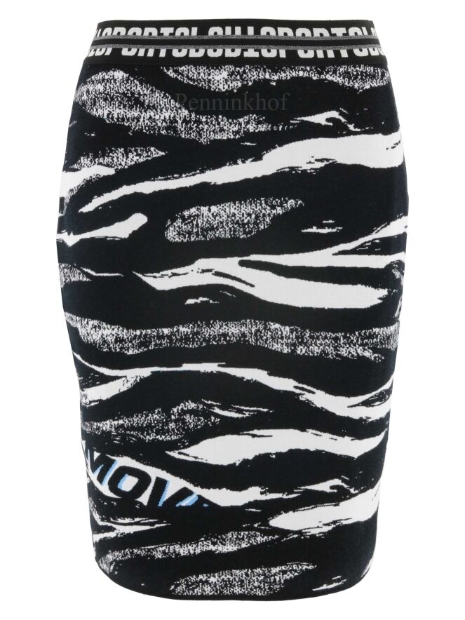 Een rok van Marc Cain in een zebra print met de kleuren zwart, wit en lichtblauw. de achterkant is in een uni zwarte kleur. In de taille is een elastieken band. De rok is gevoerd en mag op de hand owrden gewassen.