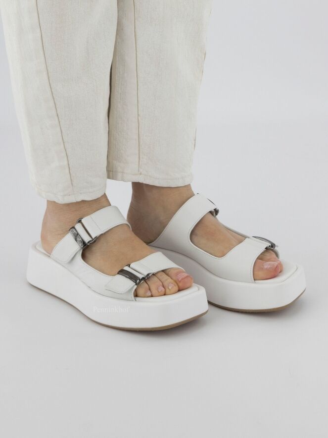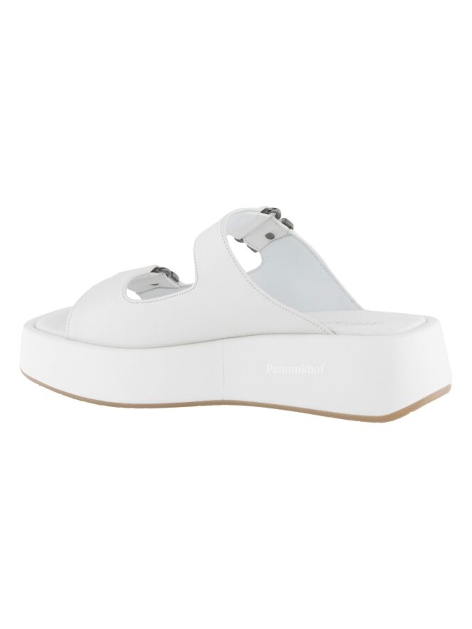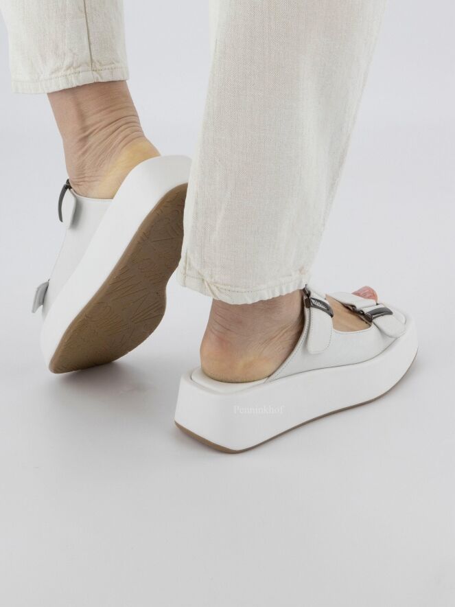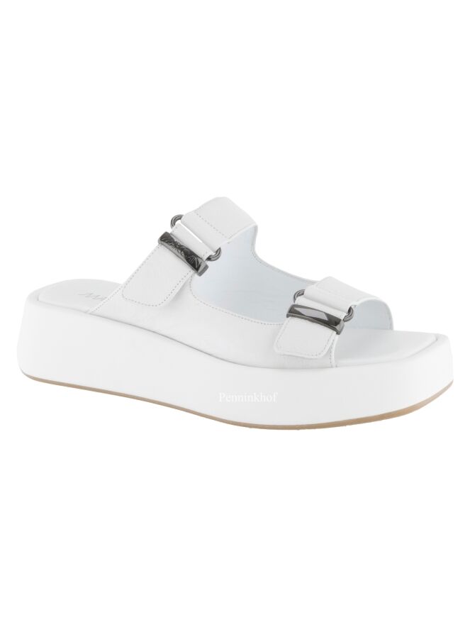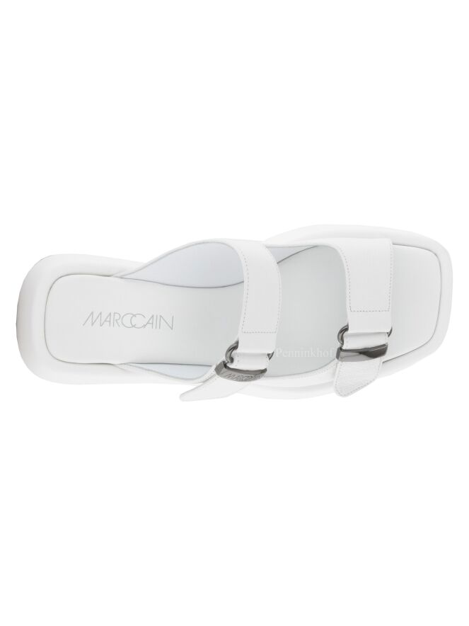 Een sandaal van Marc Cain in de kleur wit. De sandaal heeft nikkel kleurige 2 gespen. De plateauzool met een vierkante neus is met leder bekleed.