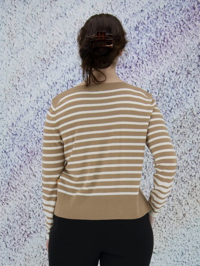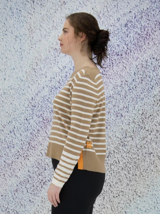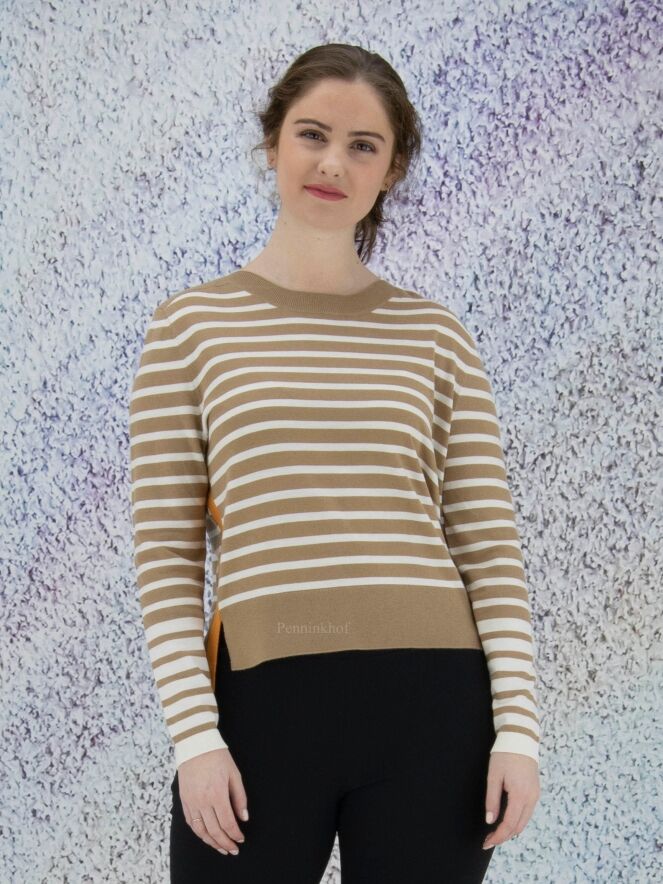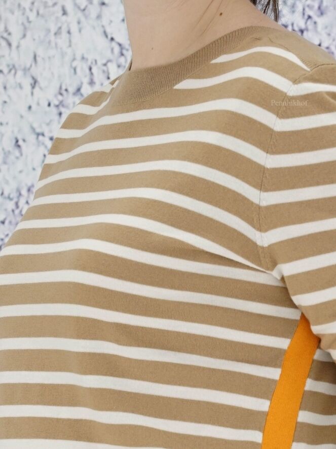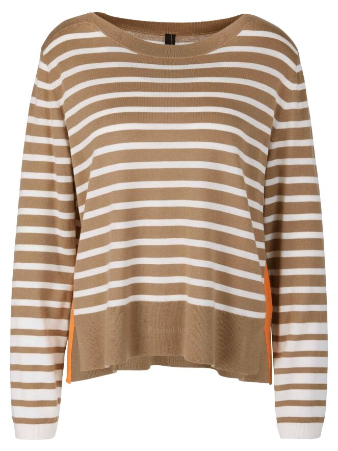 Een pullover van Marc Cain in een strepen patroon met de kleuren taupe en roomwit. Langs de zijkanten is een oranje bies. Deze pullover mag op de hand worden gewassen.