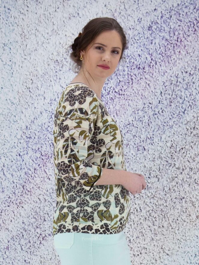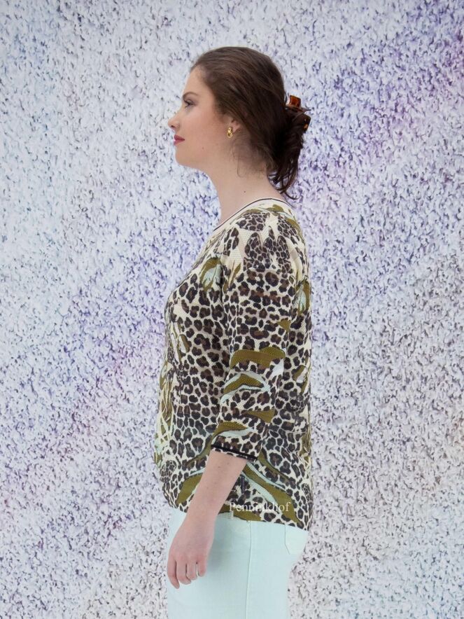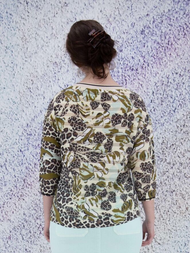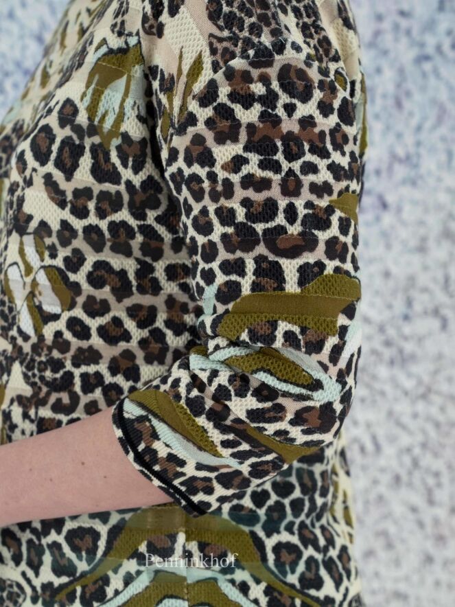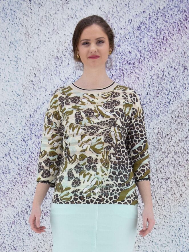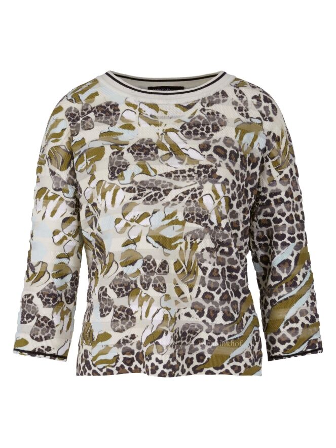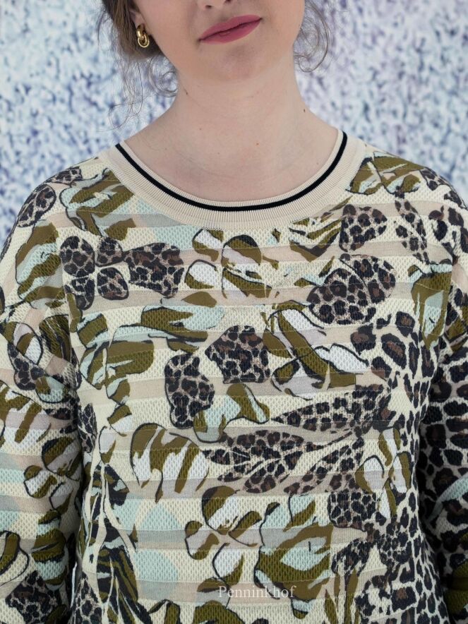 Een pullover van Marc Cain in een print van deels een panterprint en deels een jungle print met de kleuren taupe, olijfgroen, zwart en mintgroen op een roomwitte achtergrond. In de pullover is een deels transparante strepen structuur geweven. De pullover heeft een ronde hals en halflange mouwen. deze pullover mag op 30 graden worden gewassen.