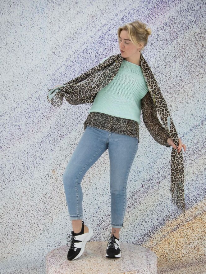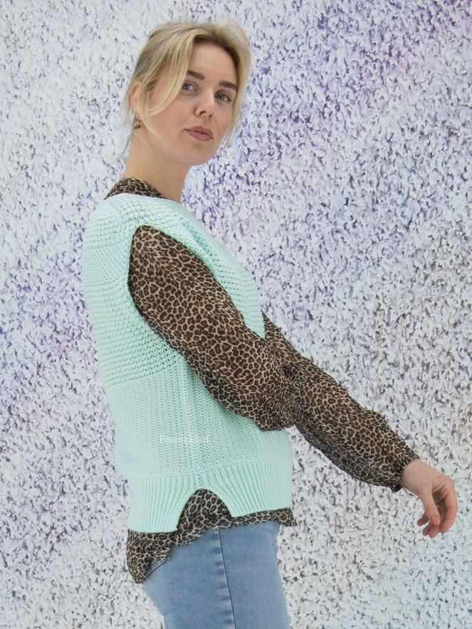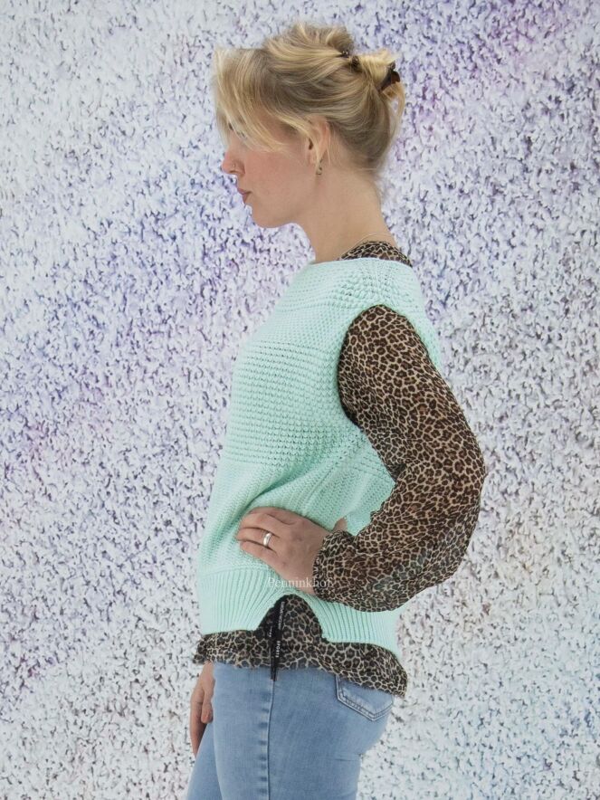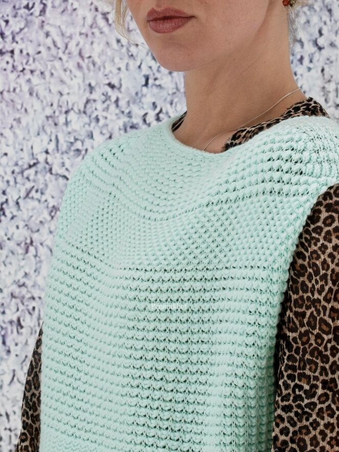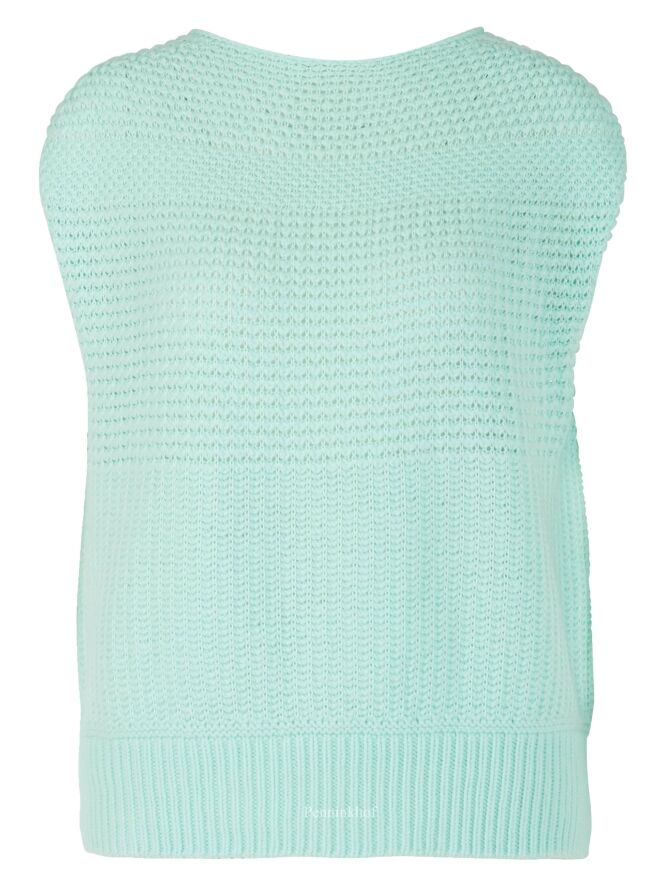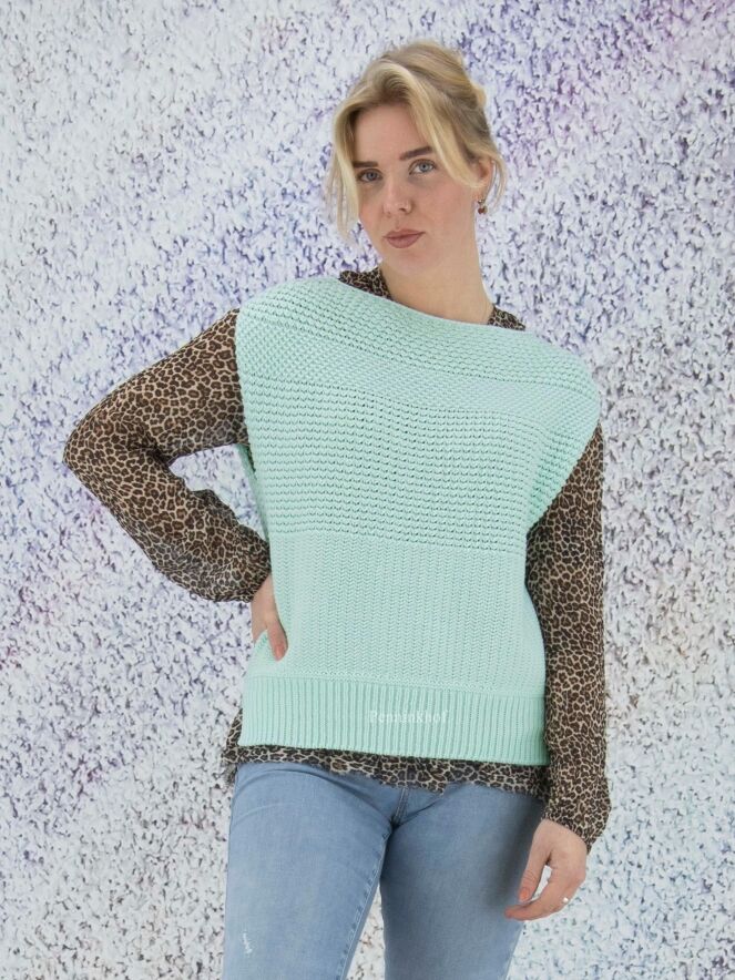 Een gebreid hes van Marc Cain in de kleur mintgroen. Door de open gebreide structuur is het hes licht transparant. Dit hes mag op de hand worden gewassen.
