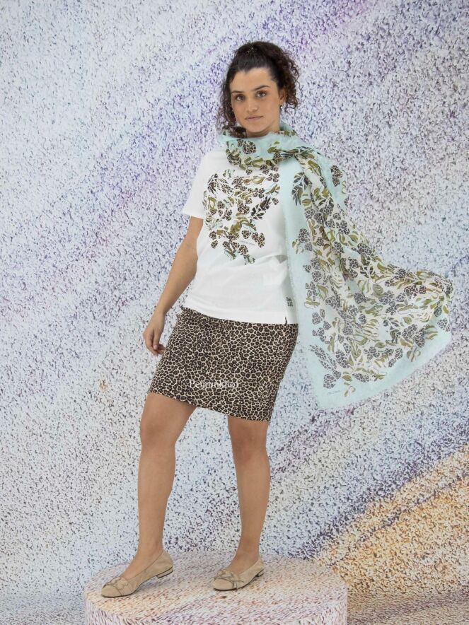 Een rok van Marc Cain in een panterprint met meerdere tinten bruin, zwart en roomwit. In de taille is een elastieken band. De rok is gevoerd en mag op 30 graden worden gewassen.