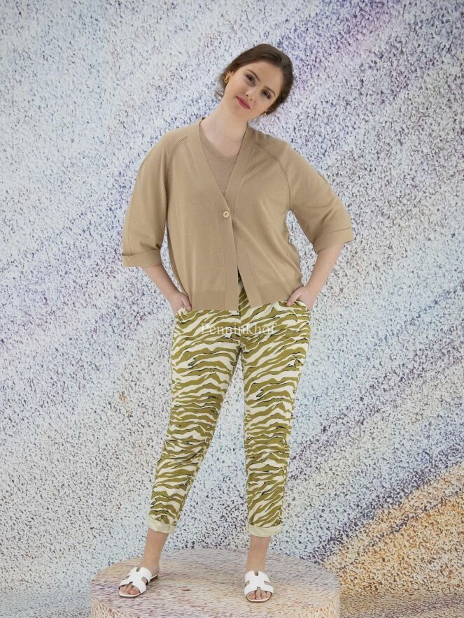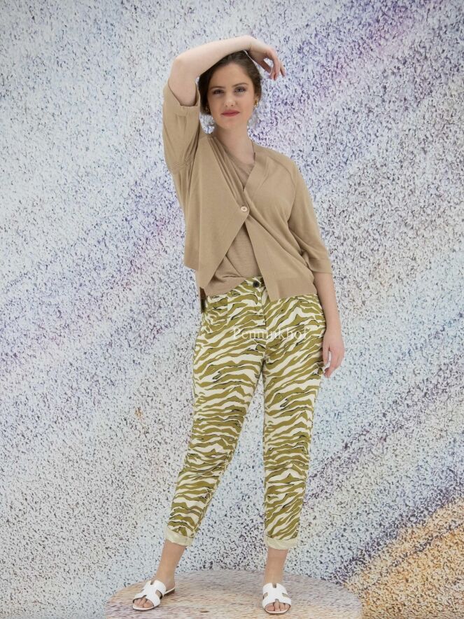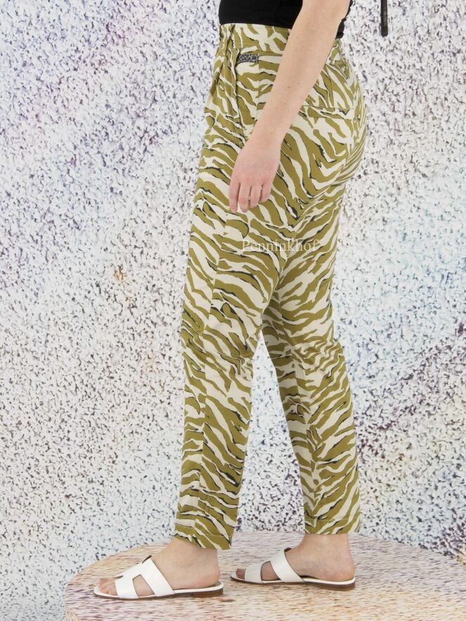 Een broek van Marc Cain in een zebraprint met de kleuren pistachegroen, zwart en roomwit. De broek heeft steekzakken en aan de onderkant van de pijpen is een korte omslag. Deze broek mag op 30 graden worden gewassen.