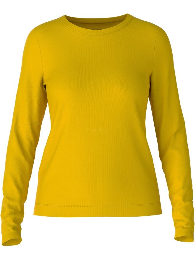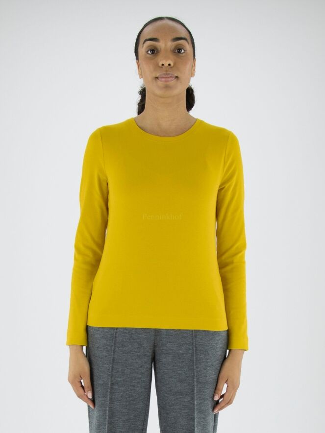 Een fijn geribbeld shirt van Marc Cain in de kleur geel. Het shirt heeft een ronde hals en lange mouwen. Dit shirt mag op 30 graden worden gewassen.