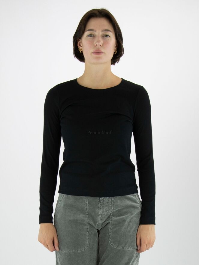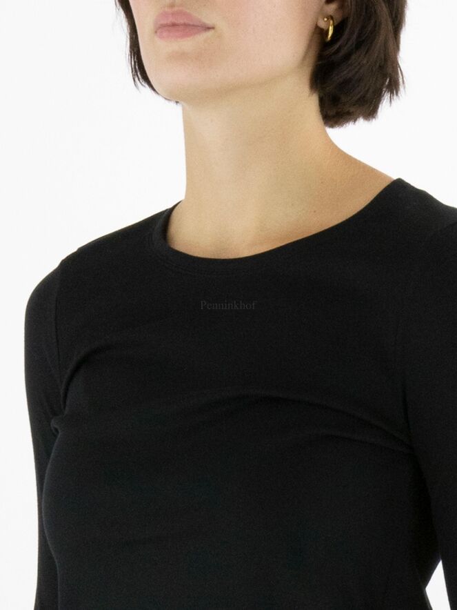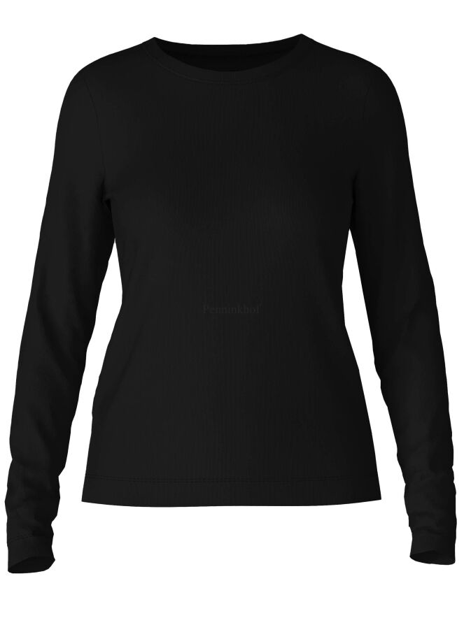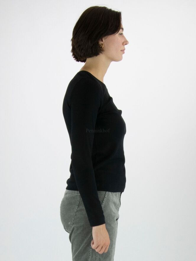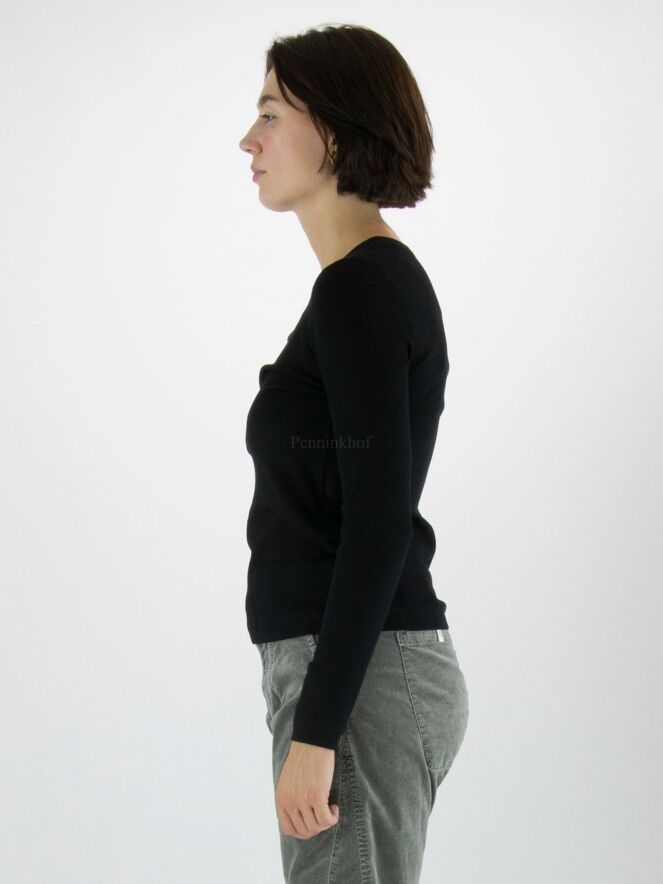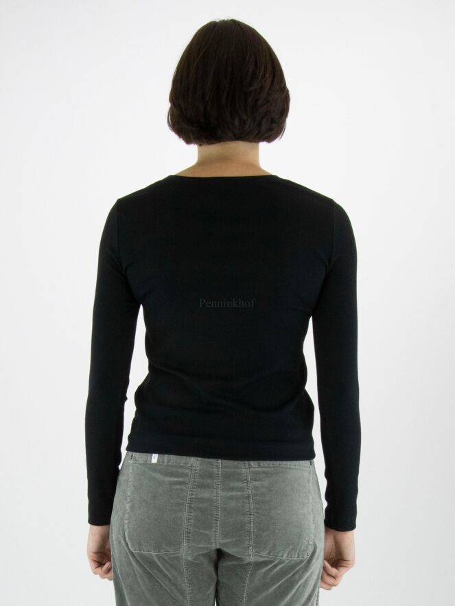 Een fijn geribbeld shirt van Marc Cain in de kleur zwart. Het shirt heeft een ronde hals en lange mouwen. Dit shirt mag op 30 graden worden gewassen.