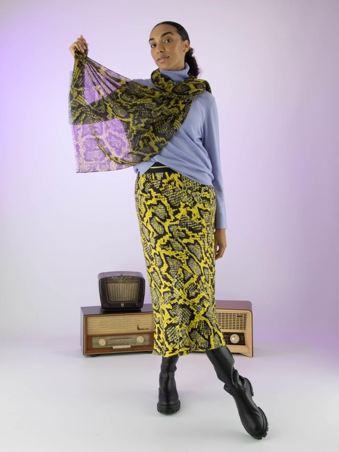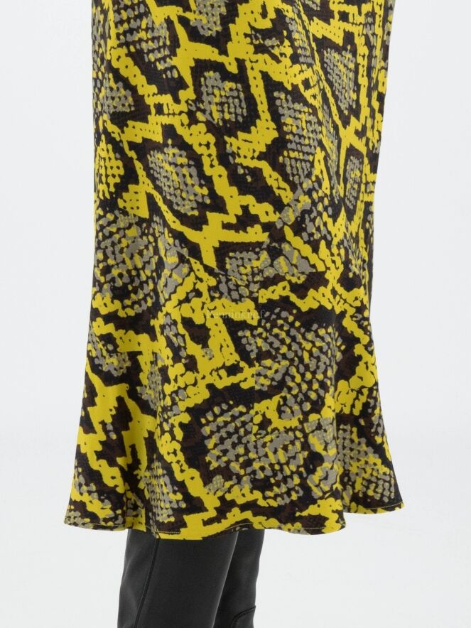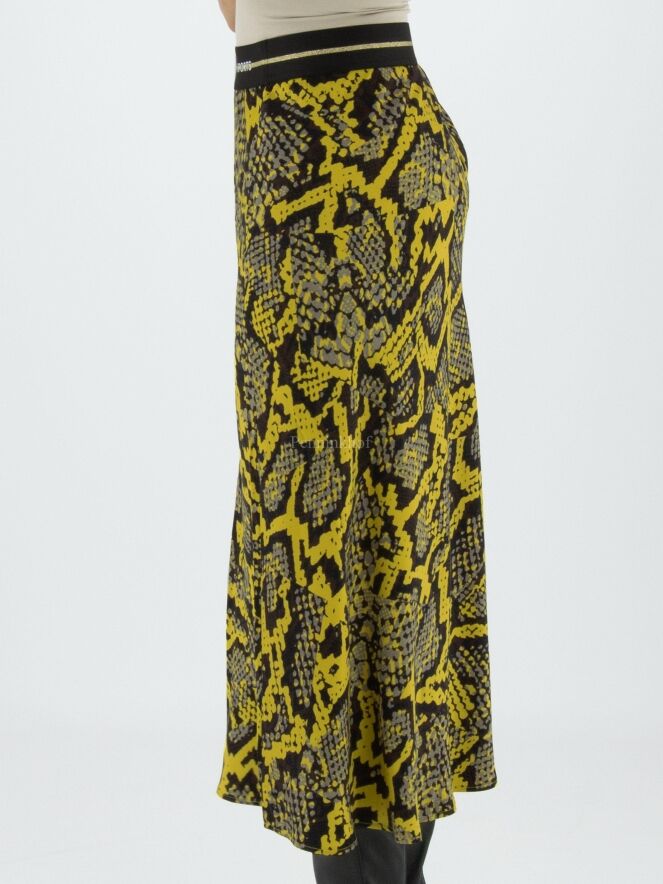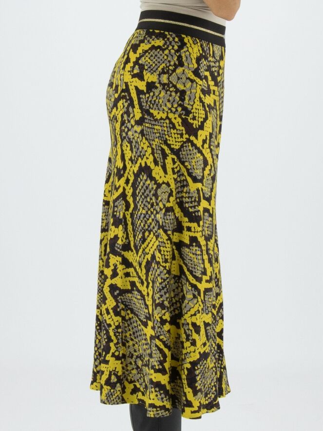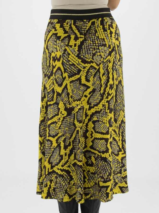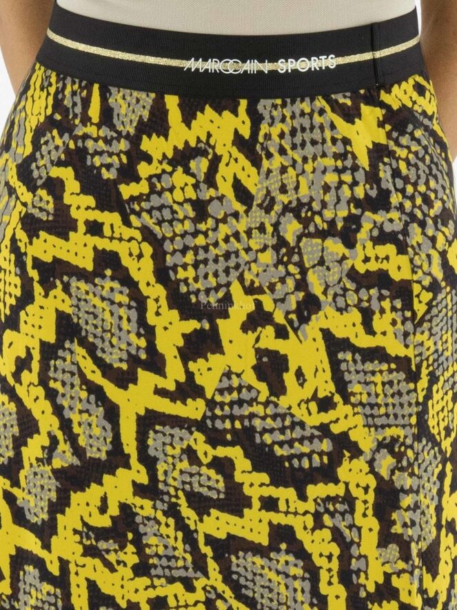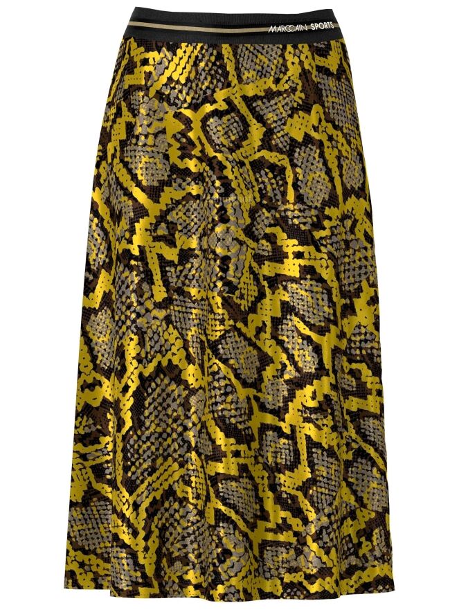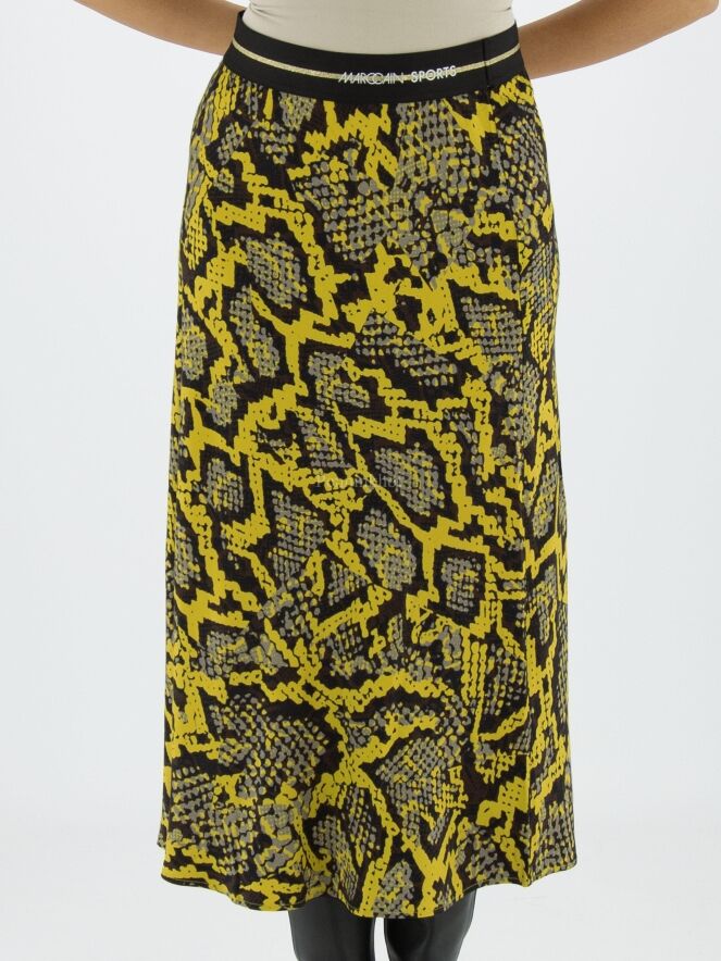 Een rok van Marc Cain in een reptielprint met de kleuren geel, zwart en grijs. In de taille is een zwarte elastieken band. De rok heeft een licht A - Lijn en is ongevoerd. Deze rok mag op 30 graden worden gewassen.
