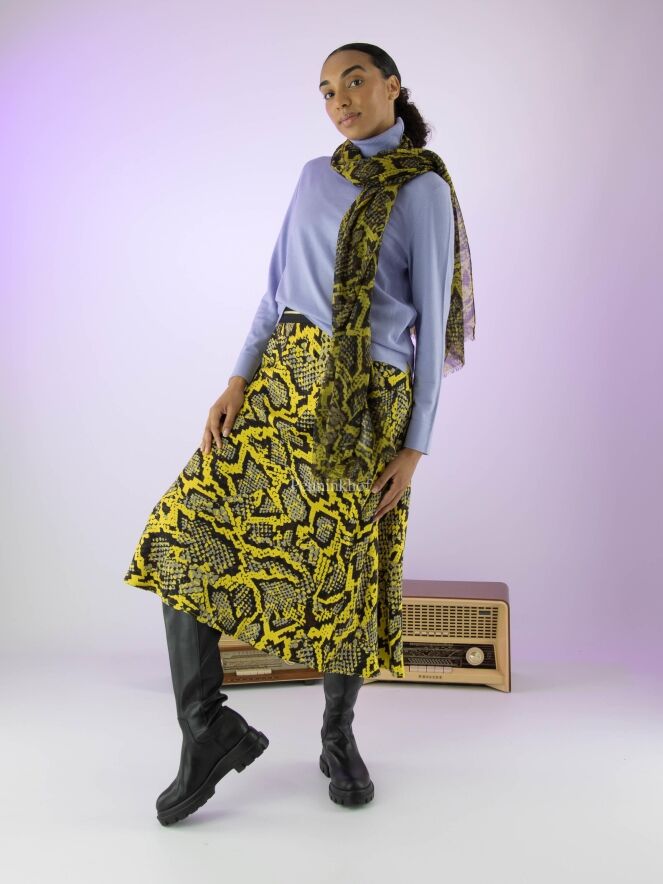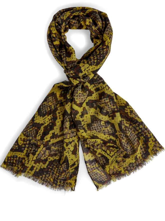 Een licht transparante shawl van Marc Cain in een reptielprint met de kleuren geel, bruin, grijs en zwart. De uitenden van de shawl zijn fijn gerafeld. Deze shawl mag op de hand worden gewassen.
