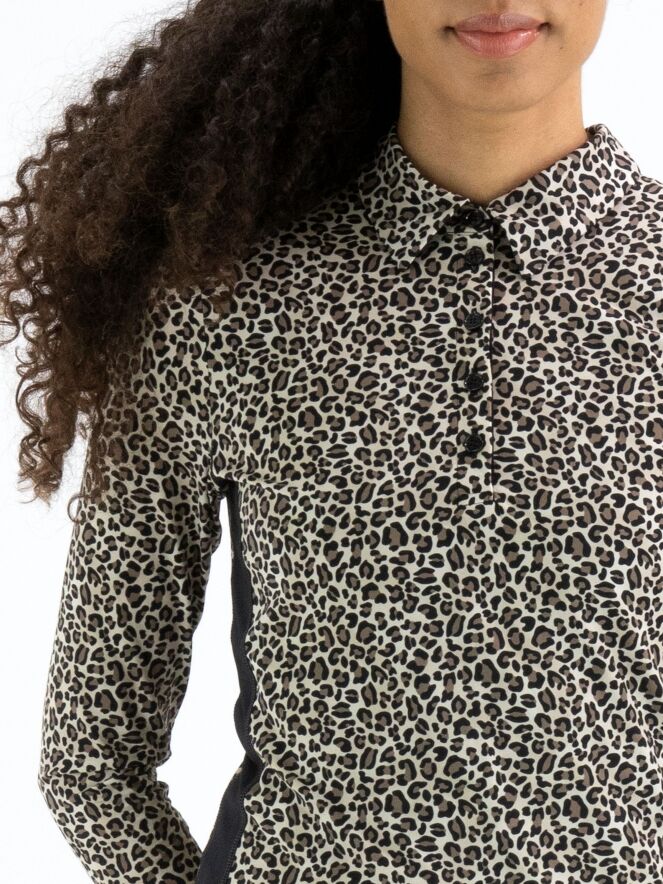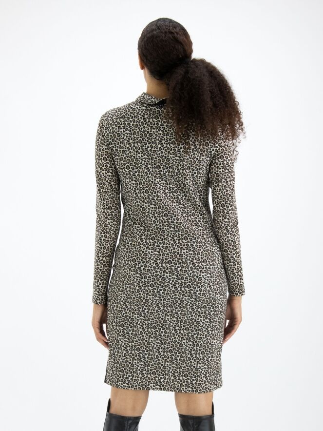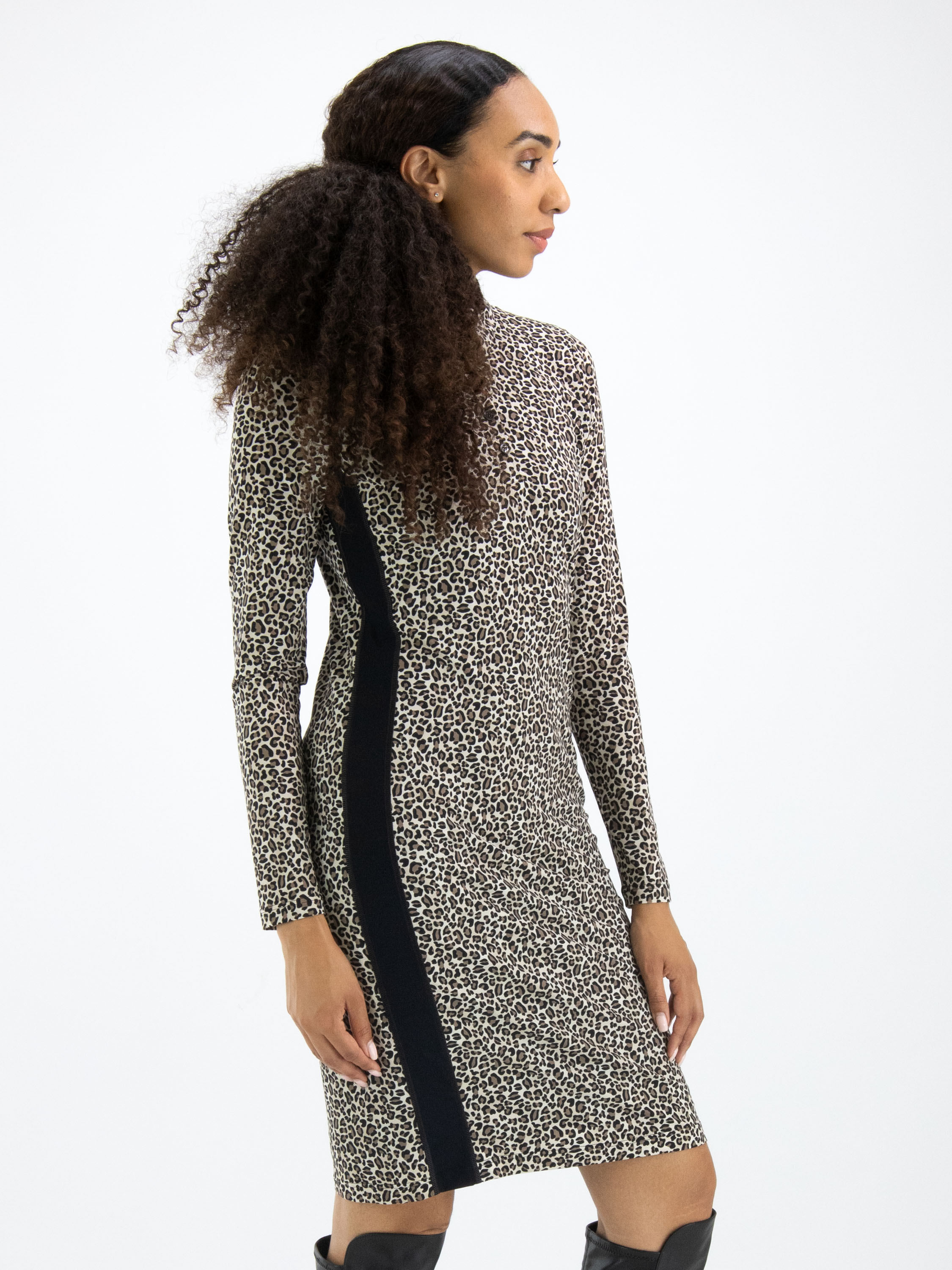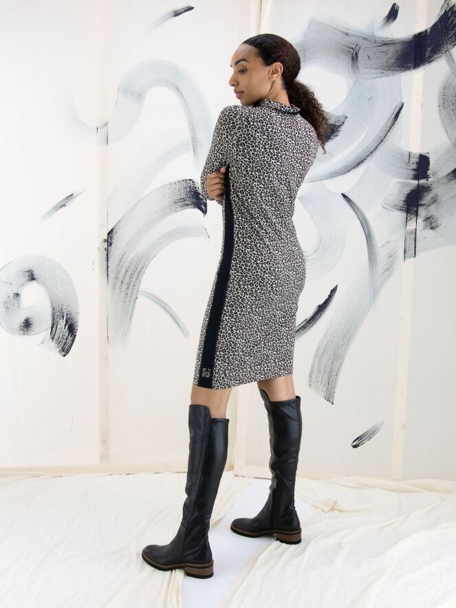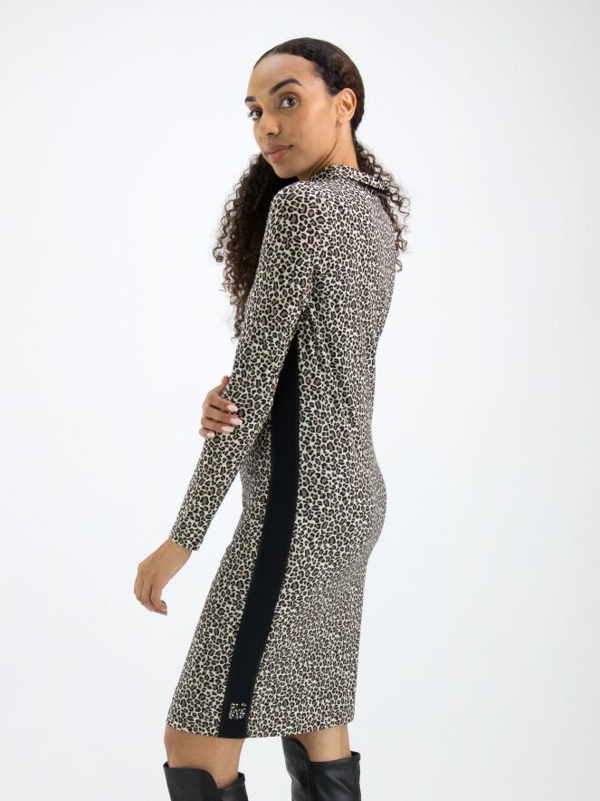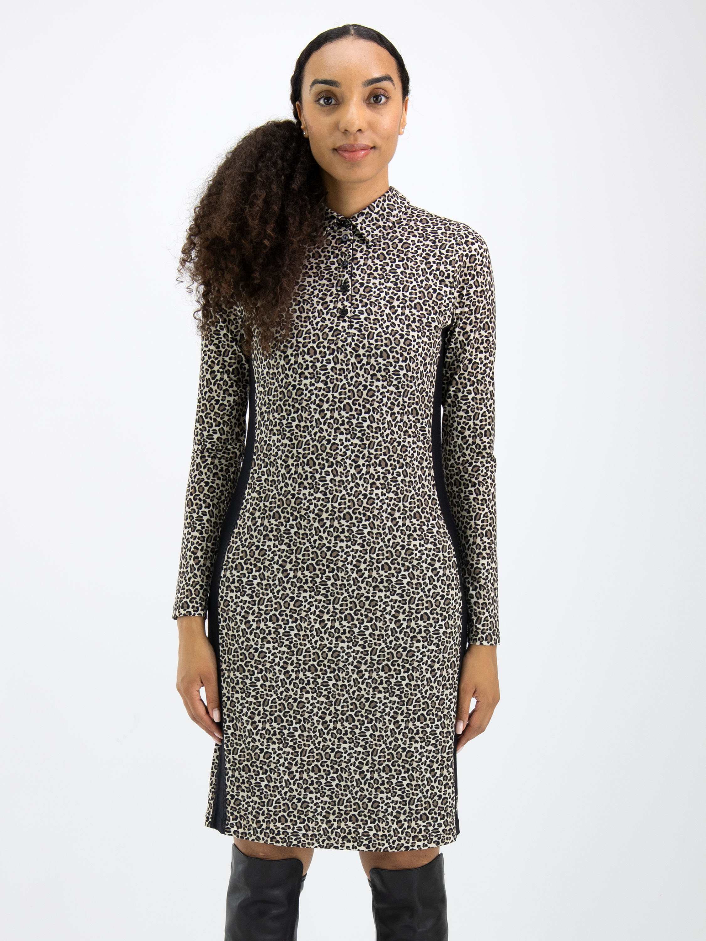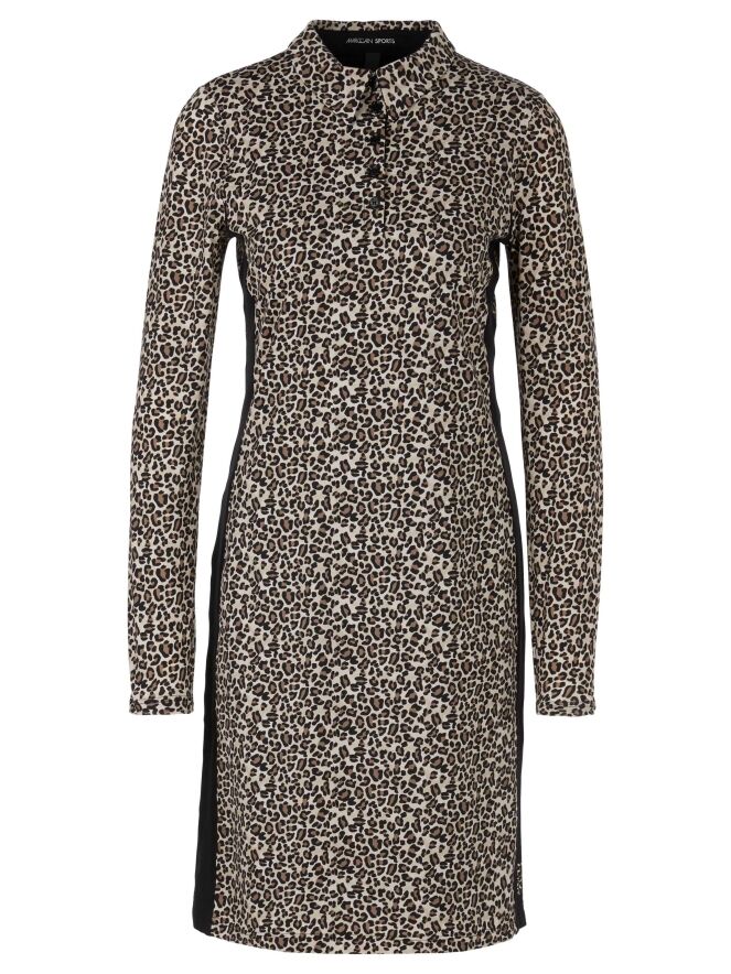 Een jurk van Marc Cain in een panterprint met de kleuren zwart en taupe op een zandkleurige achtergrond. Langs de zijkanten is een brede zwarte bies. De jurk heeft een polo sluiting met een kraag. De jurk heeft lange mouwen en is gevoerd. deze jurk mag op 30 graden worden gewassen.
