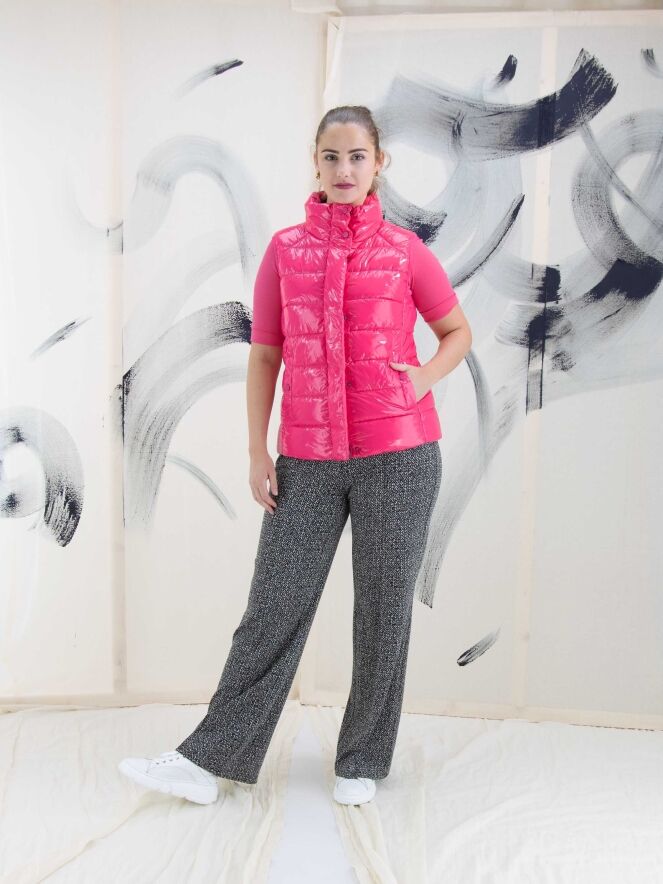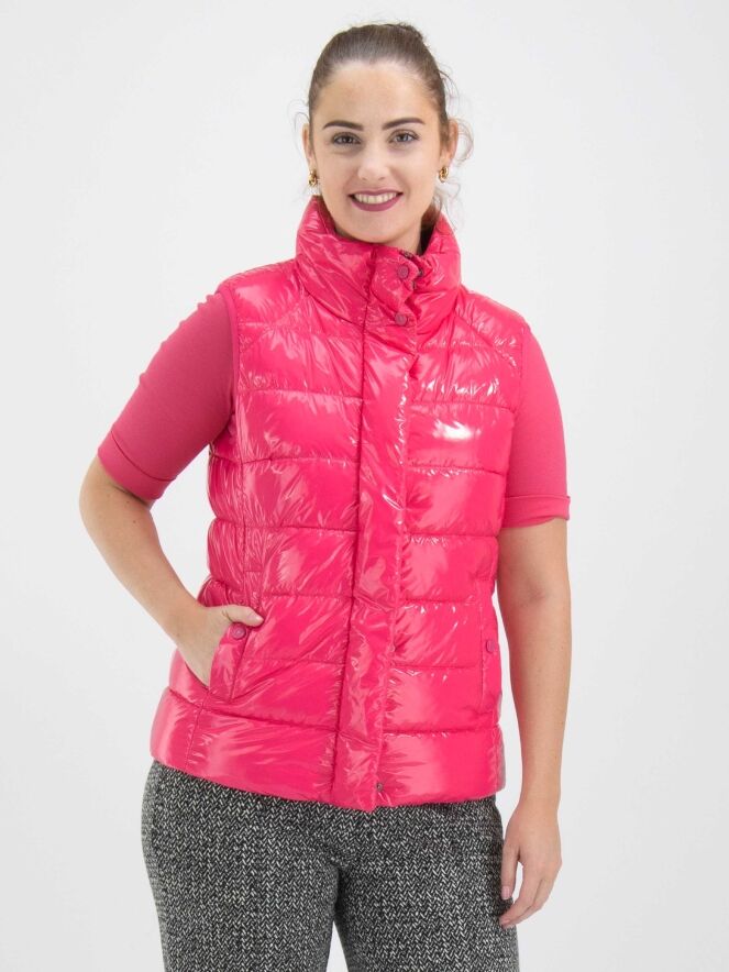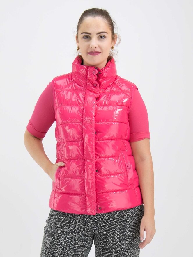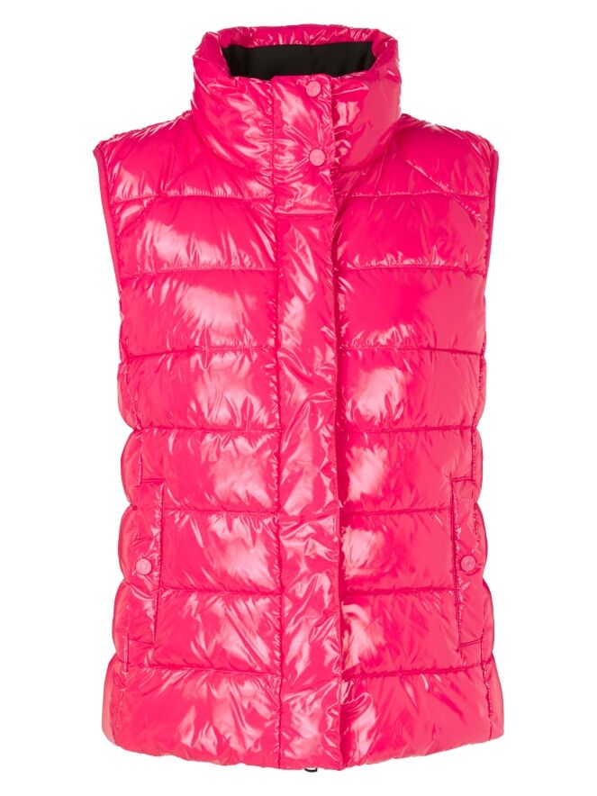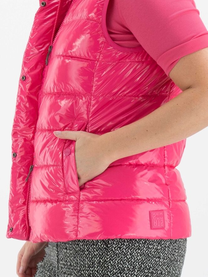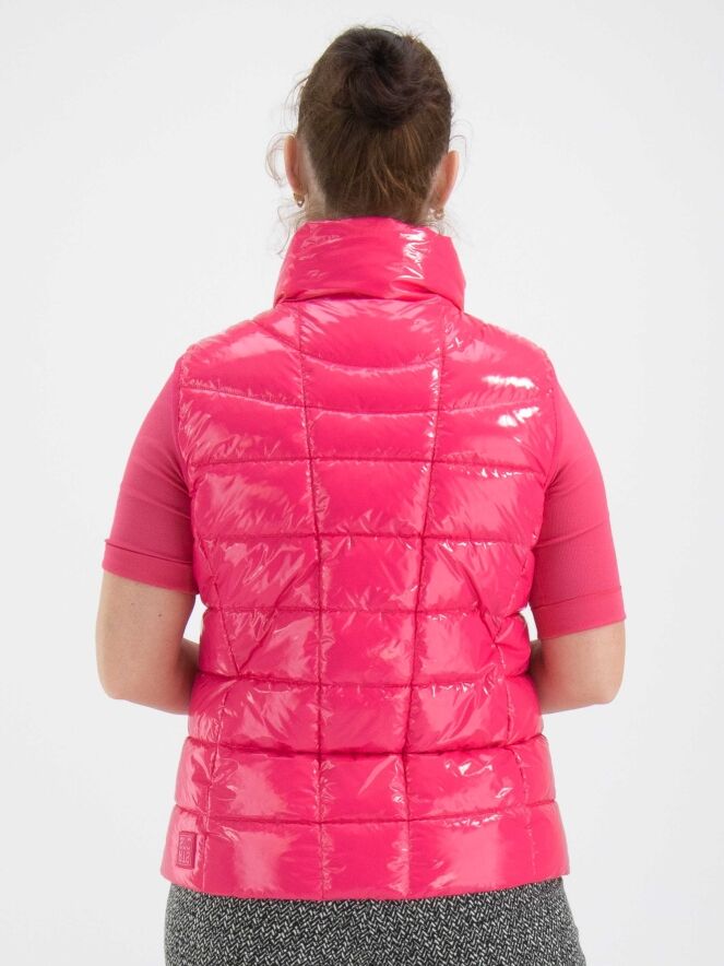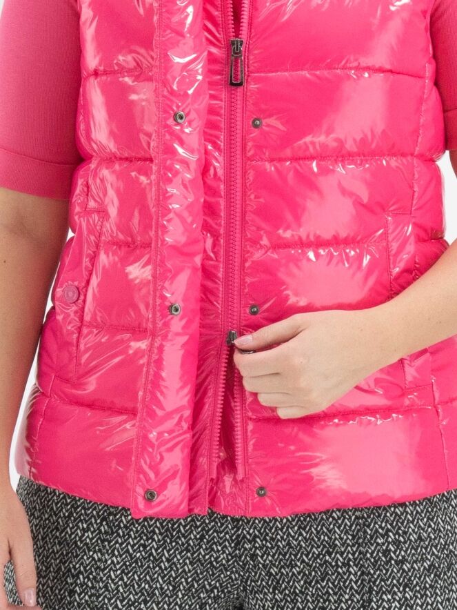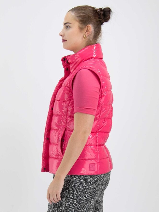 Een gestepte korte bodywarmer van Marc Cain in een frisse pink kleur in lak. De bodywarmer heeft een ritssluiting met verborgen drukknopen als 2e sluiting. Deze bodywarmer mag op 30 graden worden gewassen.