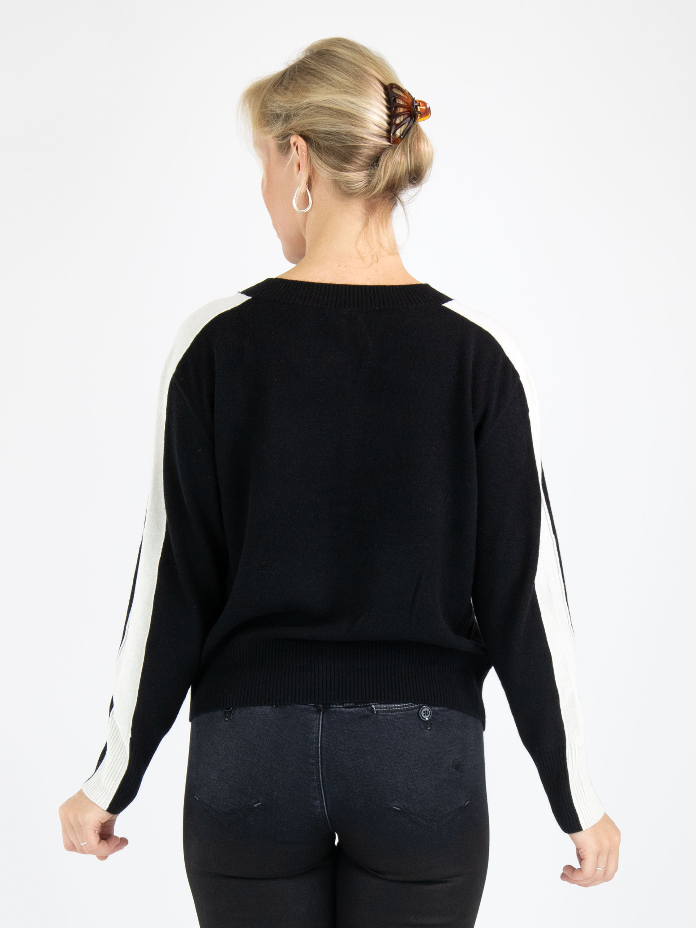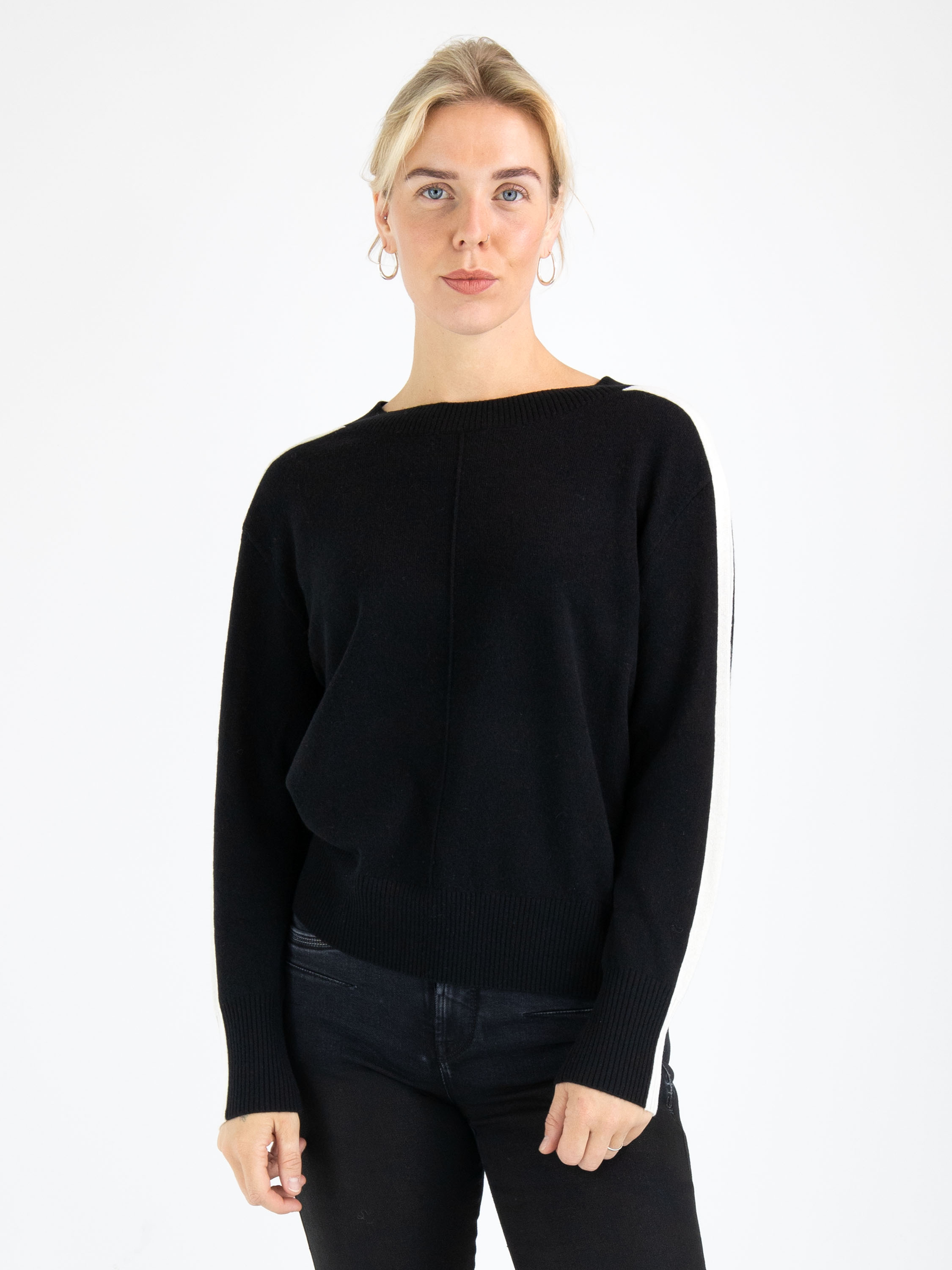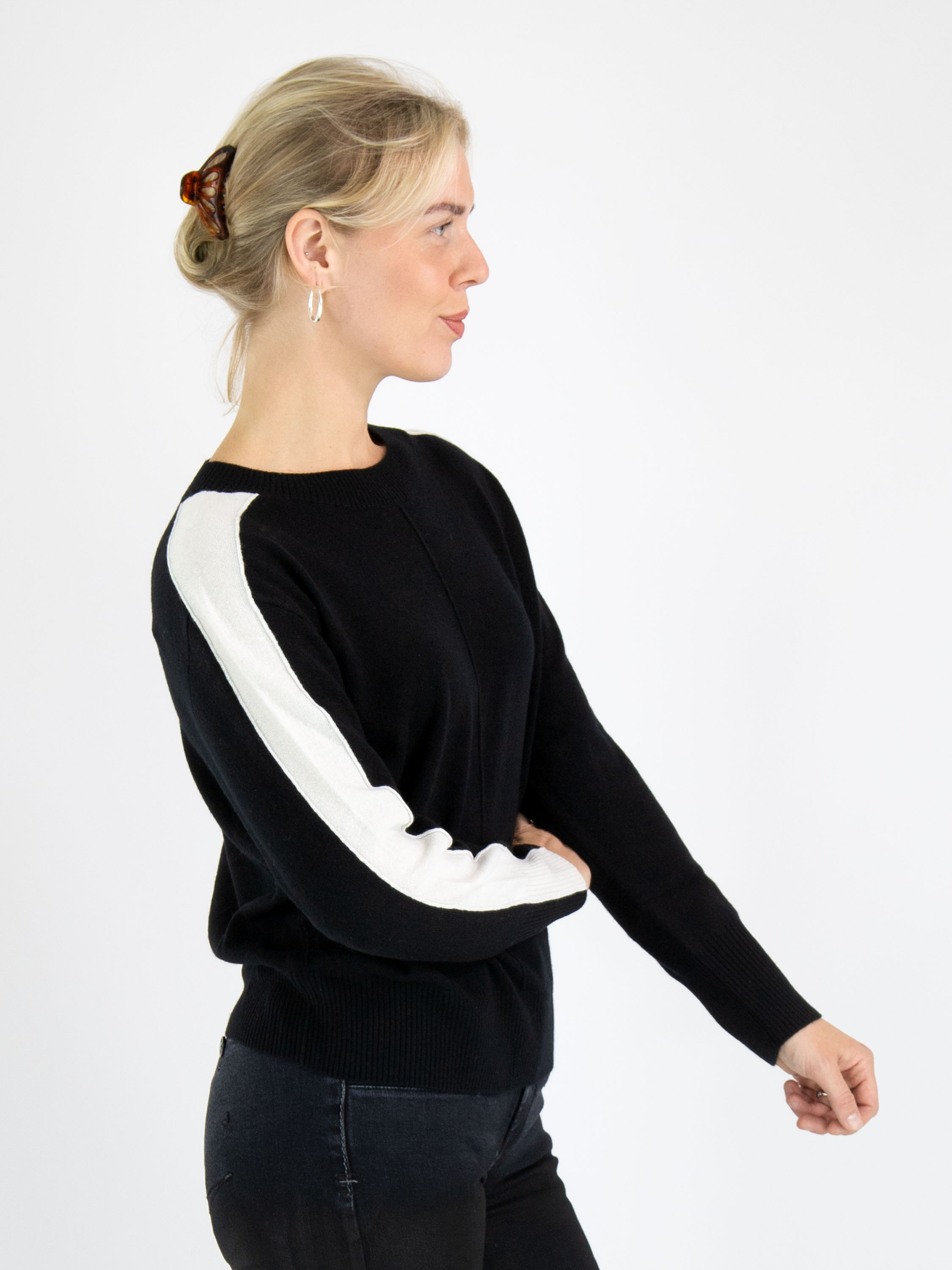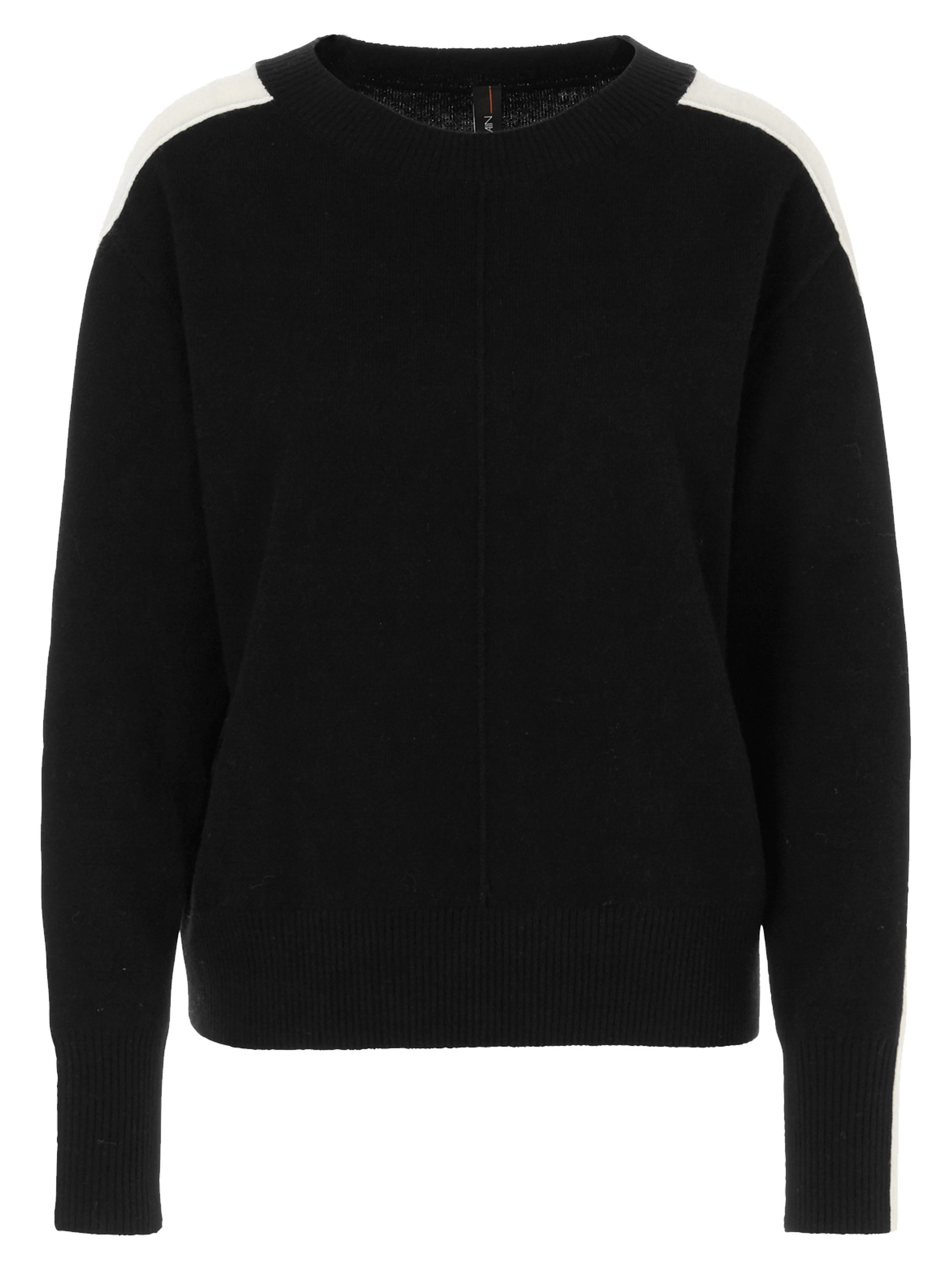 Een pullover van Marc Cain in de kleur zwart. Vanuit de schouders over de gehele lengte van de lange mouwen loopt een brede roomwitte bies. Langs de rand van de ronde hals, de uiteinden van de mouwen en de onderkant van de pullover is een fijn geribbelde tricotbies. Aan de voorzijde is in het midden een omgekeerde stiknaad. Deze pullover mag met de hand worden gewassen.