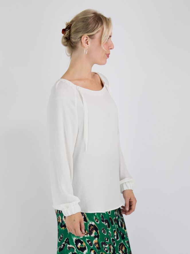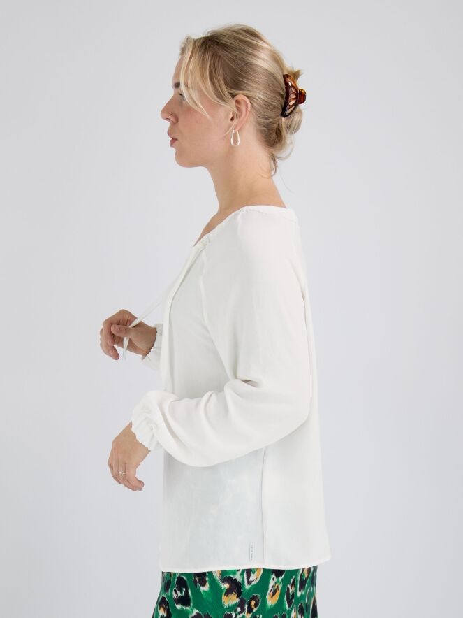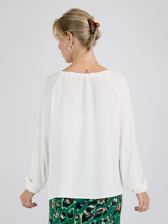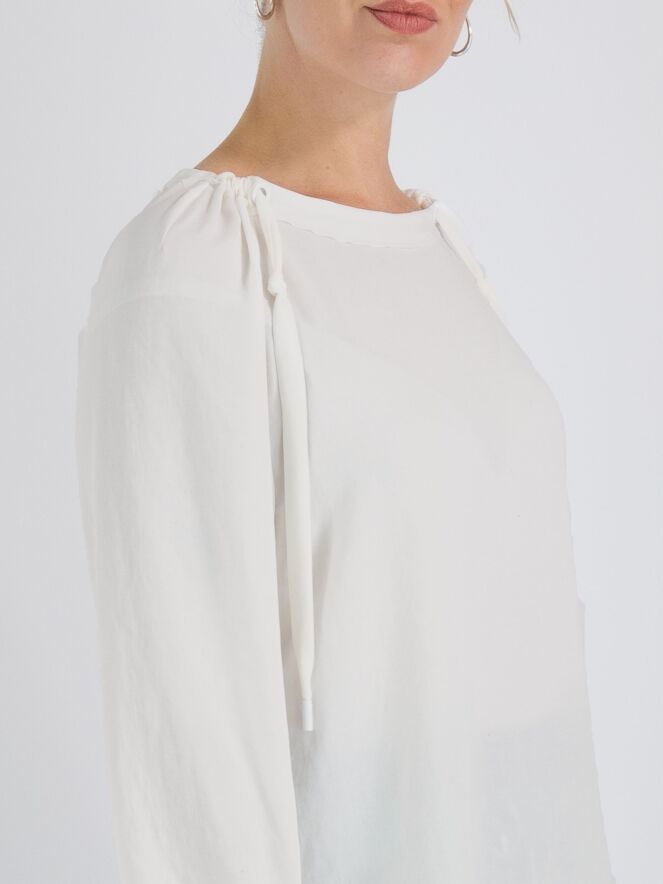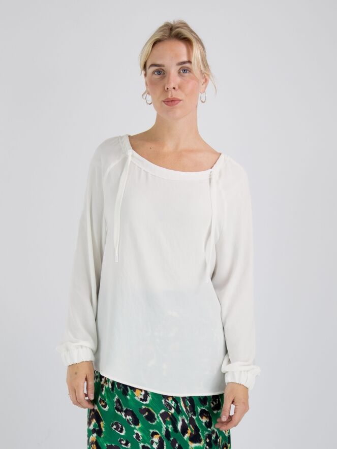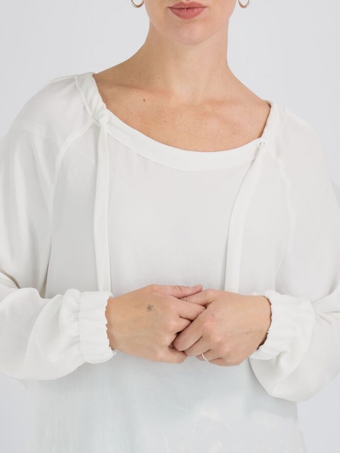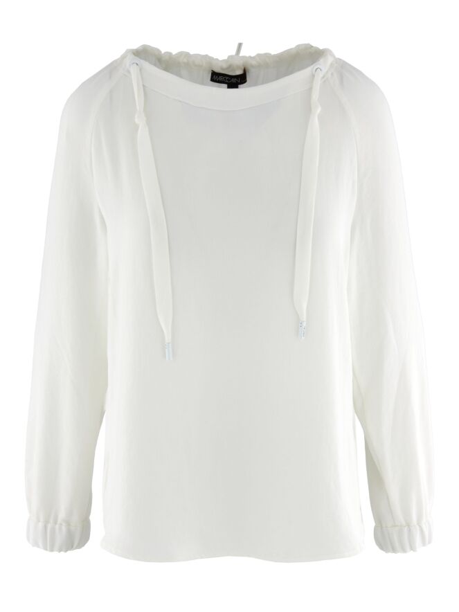 Een shirt van Marc Cain in de kleur roomwit. In de rand van de ruime ronde hals is een lint waarmee een plooi-effect kan worden gecreëerd. Aan het uiteinde van de lange mouwen is een geplooide bies met elastiek. Dit shirt mag op 30 graden worden gewassen.