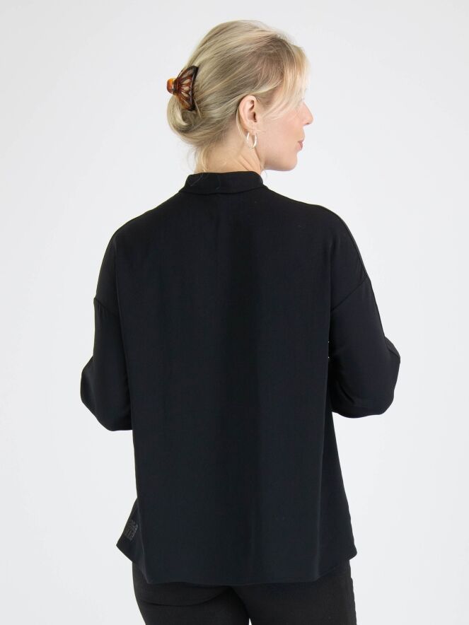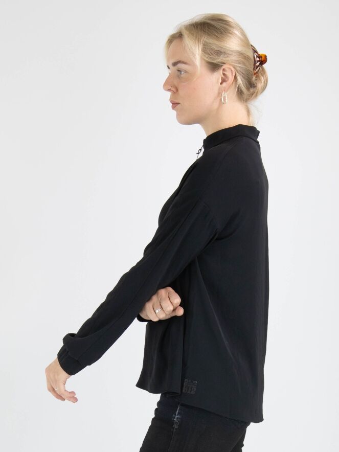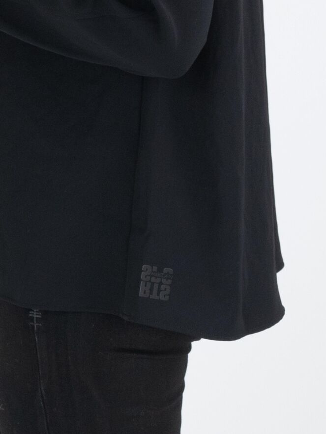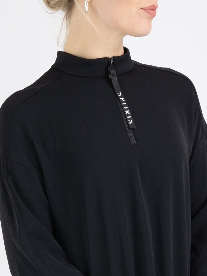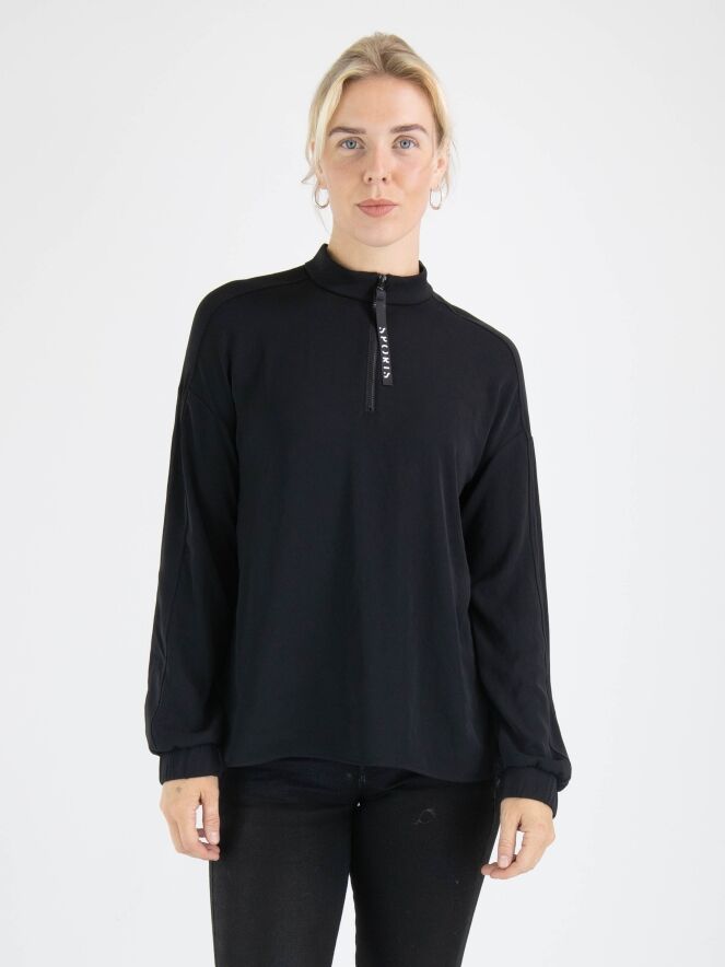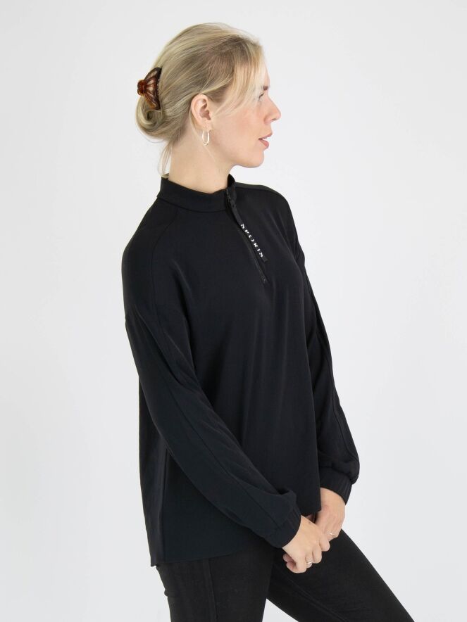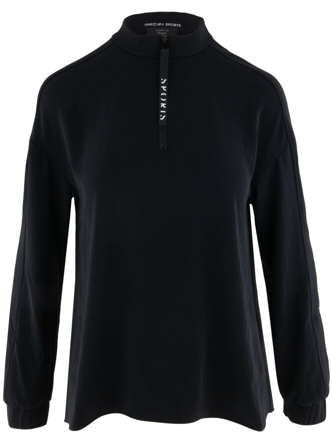 Een blouse van Marc Cain in de kleur zwart. Vanuit het midden van de hoge ronde hals loopt een zwarte rits tot aan de buste. Aan het uiteinde van de lange mouwen is een geplooide bies met elastiek. Deze blouse mag op 30 graden worden gewassen.