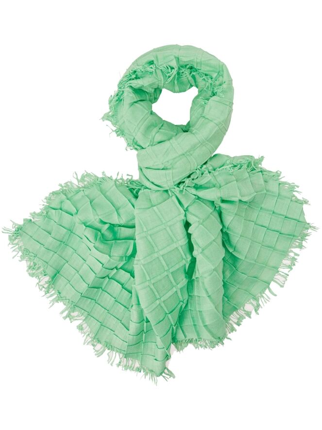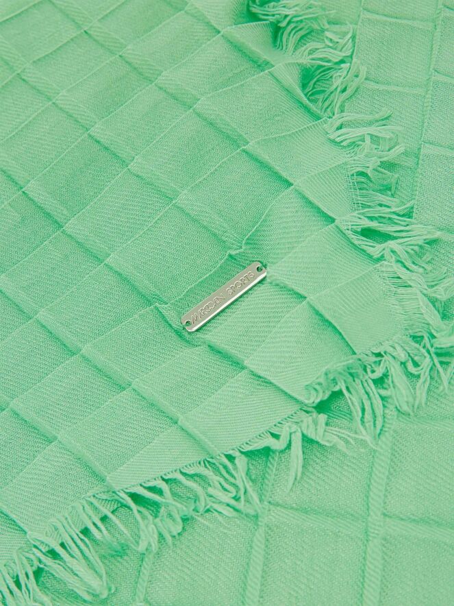 Een shawl van Marc Cain in een heldere kleur groen. De shawl is geweven in een wafel structuur. De randen zijn fijn gerafeld. Deze shawl mag op de hand worden gewassen.