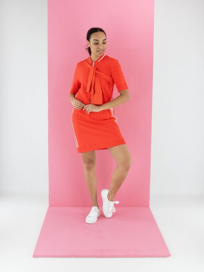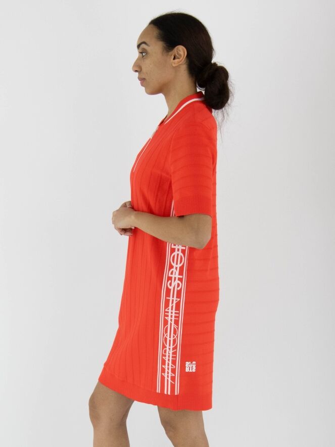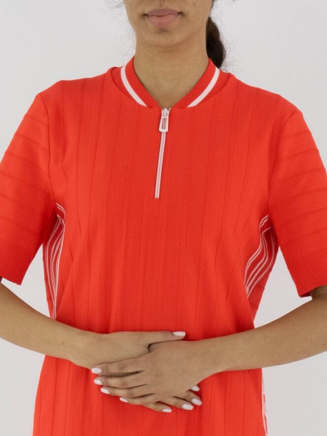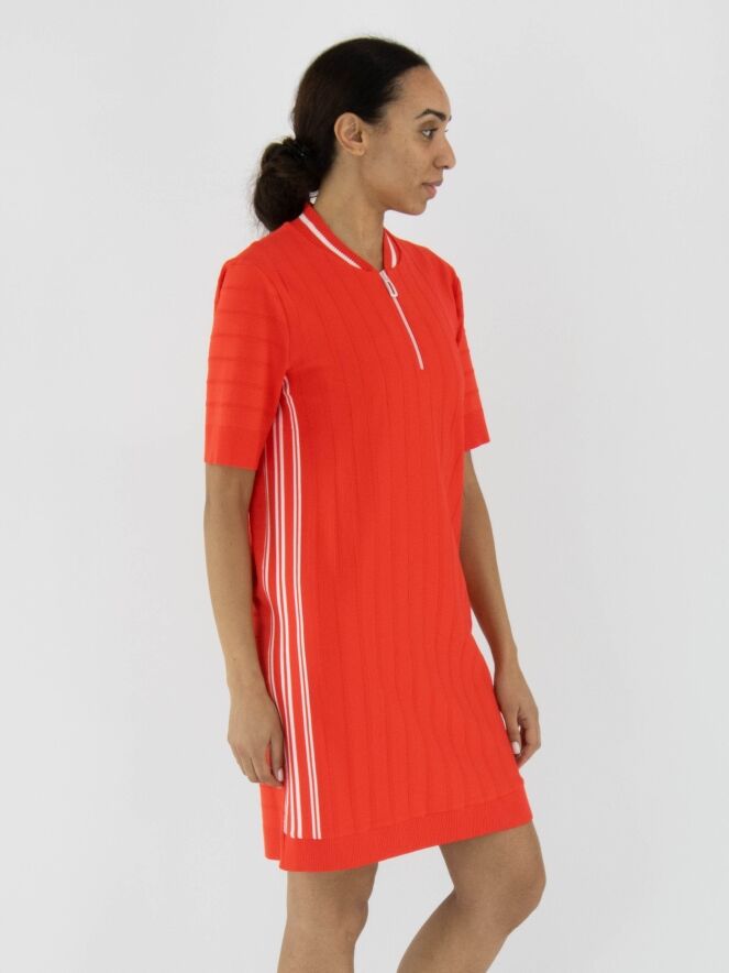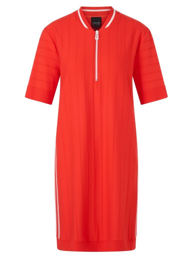 Een jurk van Marc Cain in de kleur koraalrood met een ton-sur-ton streeppatroon, waarbij de strepen fijn geribbeld zijn. Langs de rand van de ronde hals zit een fijn geribbelde bies met een witte streep. Langs de zijkanten bevindt zich een brede bies met witte strepen en de tekst "Marc Cain". Vanuit het midden van de hals loopt een witte rits tot aan de buste. De uiteinden van de korte mouwen en de onderkant van de jurk zijn afgewerkt met een brede, uni, fijn geribbelde boord. Deze jurk kan op 30 graden worden gewassen.