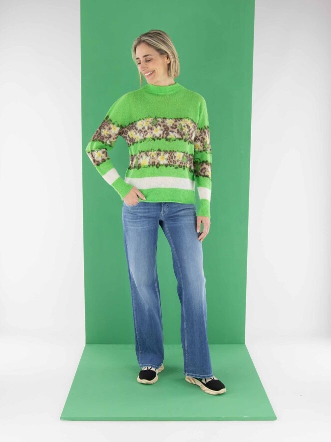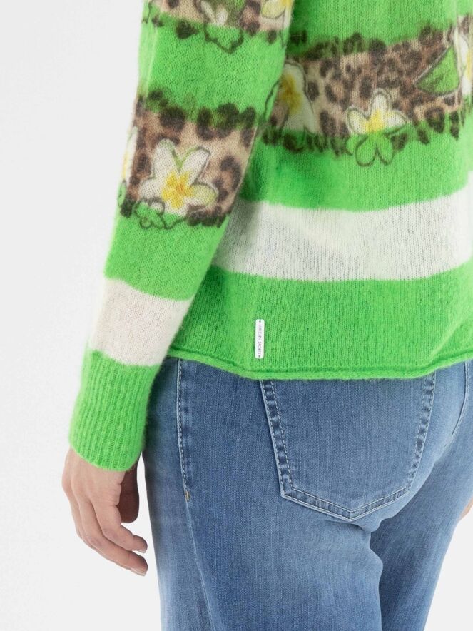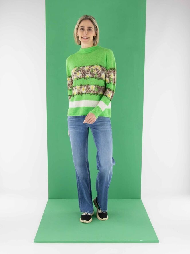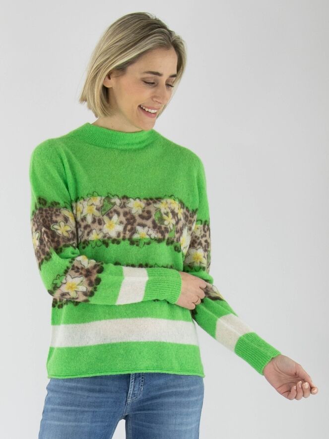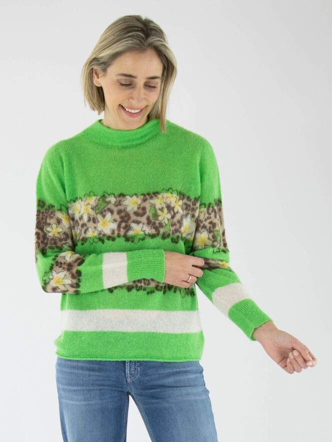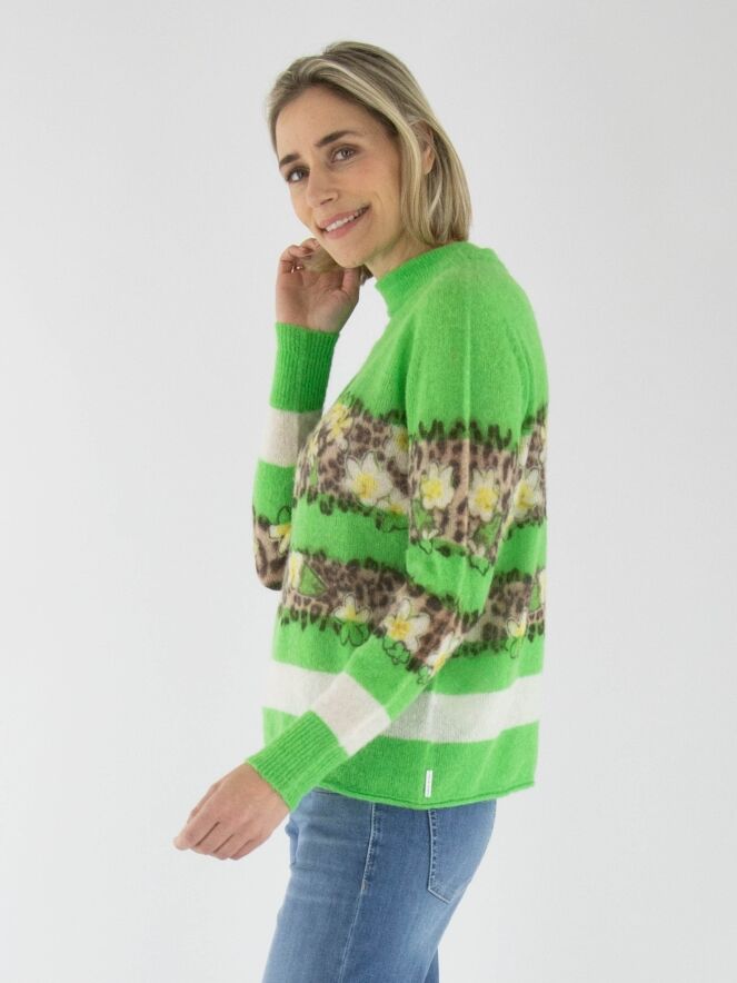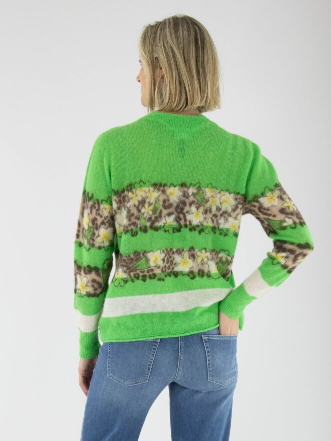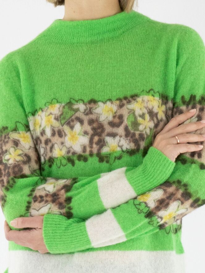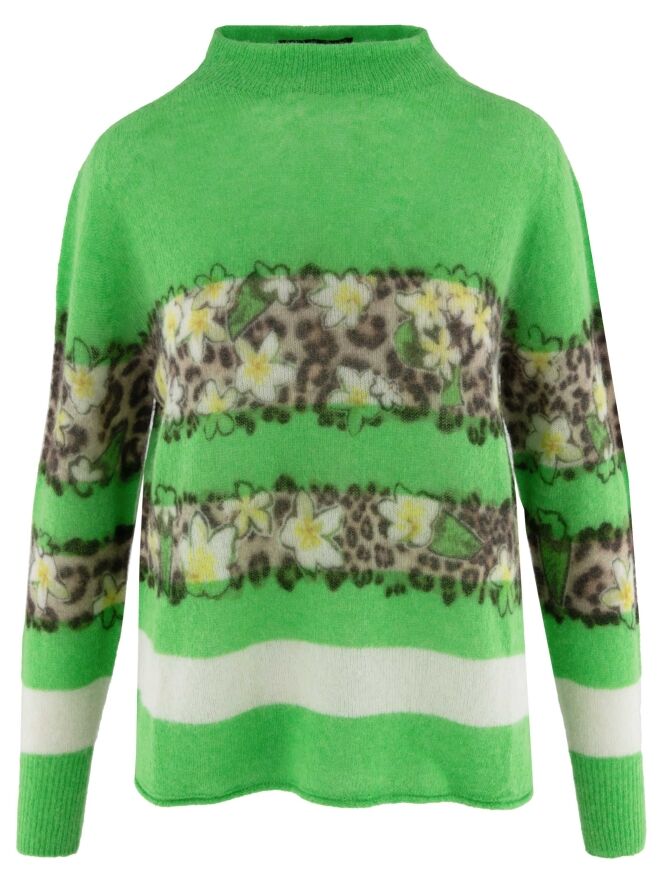 Een zachte pullover van Marc Cain in de kleur heldergroen. In de pullover zitten twee brede banen met een bloemenprint in de kleuren roomwit en geel, op een achtergrond met panterprint. De pullover heeft een hoge ronde hals en dient met de hand te worden gewassen.
