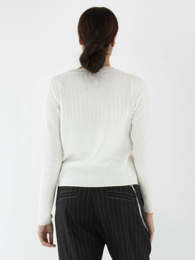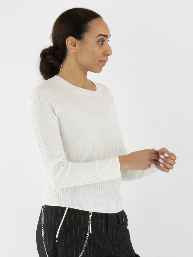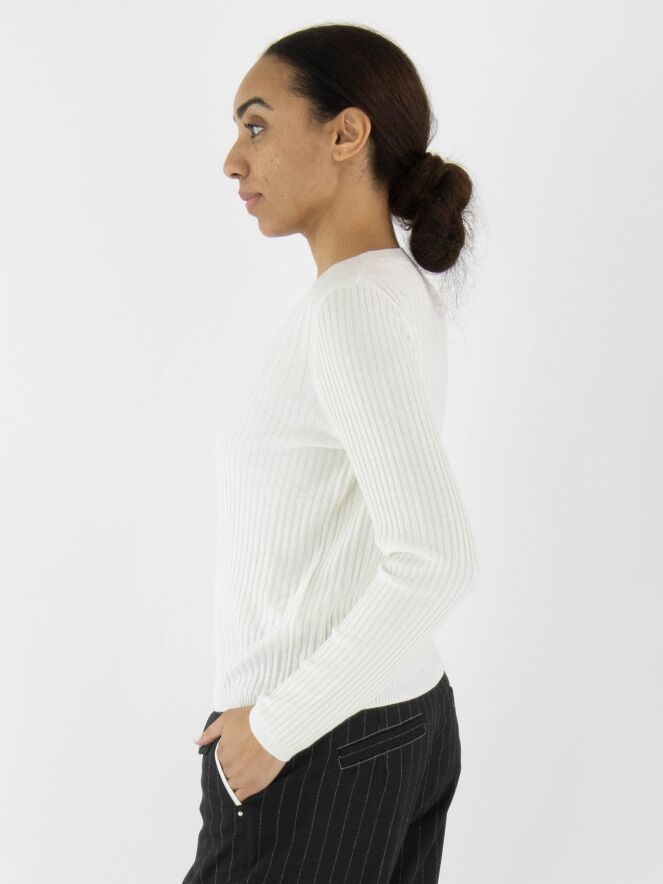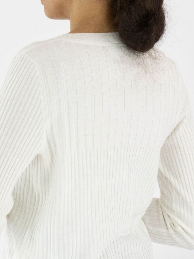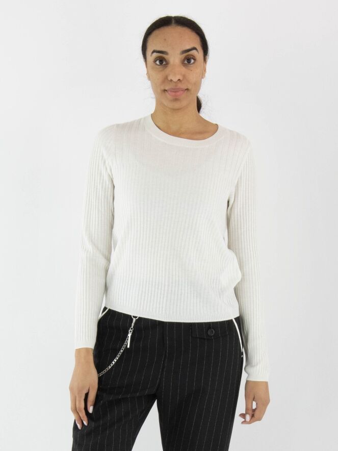 Een shirt van Marc Cain in de kleur roomwit. De stof is breed geribbeld, en boven de buste is de breedte van de ribbels nog iets ruimer. Het shirt heeft een ronde hals en lange mouwen en mag met de hand worden gewassen.