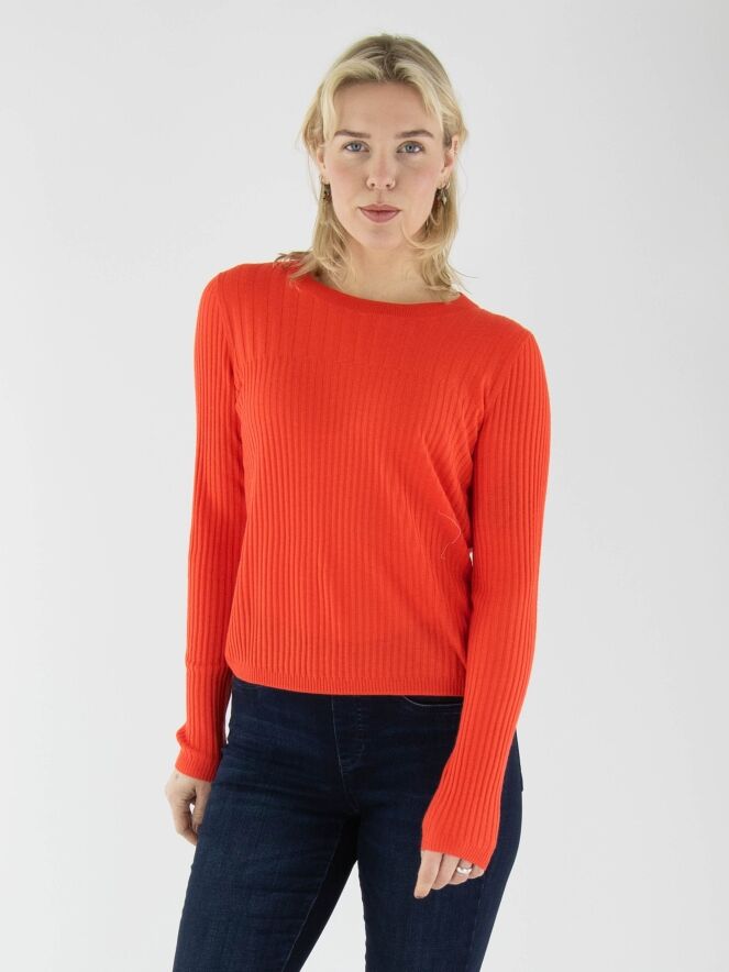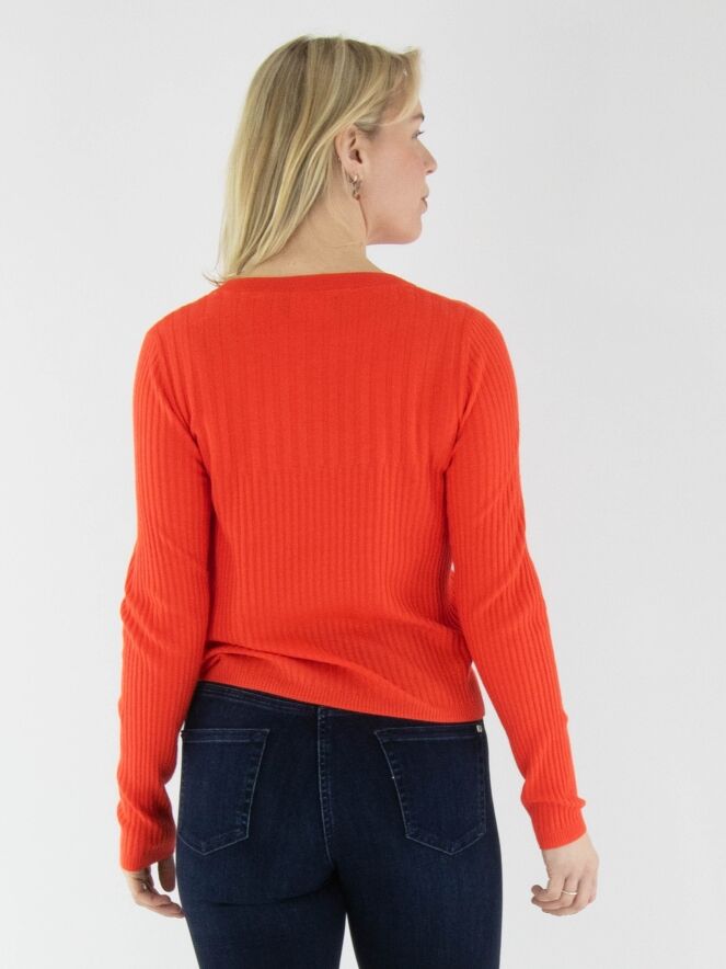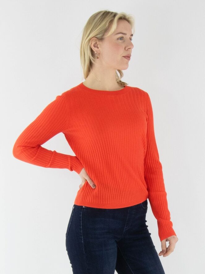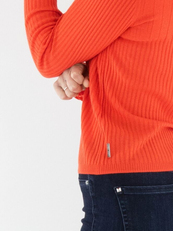 Een shirt van Marc Cain in de kleur koraalrood. De stof is breed geribbeld en boven de buste is de breedte van de ribbel iets ruimer. Het shirt heeft een ronde hals en lange mouwen en mag met de hand worden gewassen.