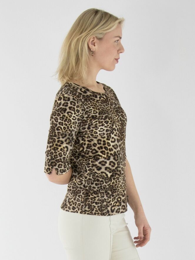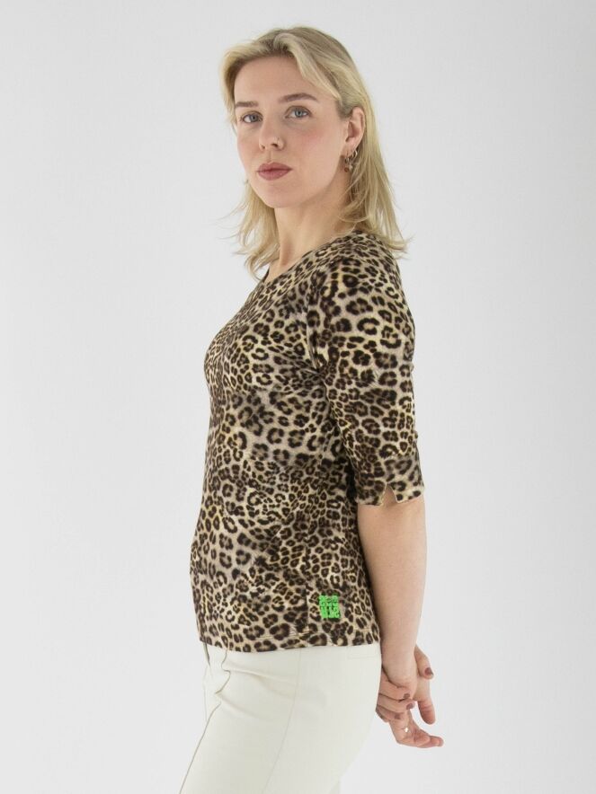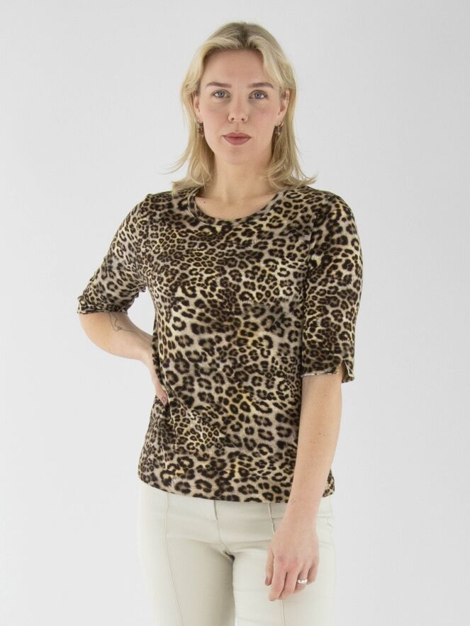Een shirt van Marc Cain in een panterprint met meerdere tinten bruin en zwart. De stof is fijn geribbeld. In de omslag van de korte mouwen zit een print van bloemetjes in de kleuren wit en zachtgeel. Het shirt heeft een ronde hals en kan op 30 graden worden gewassen.
