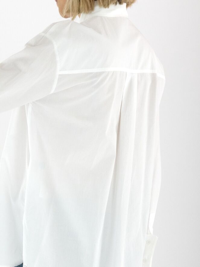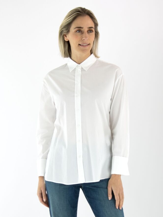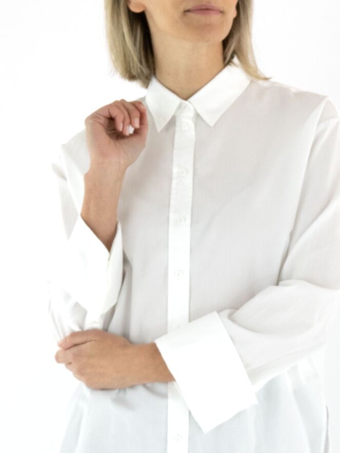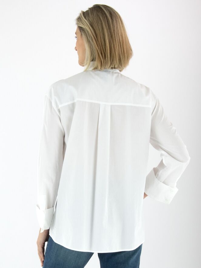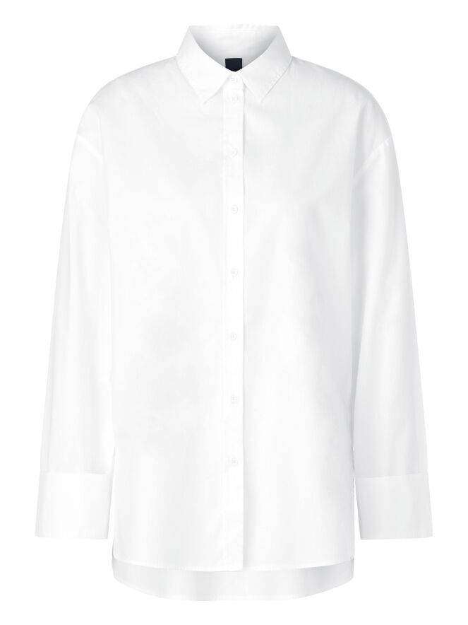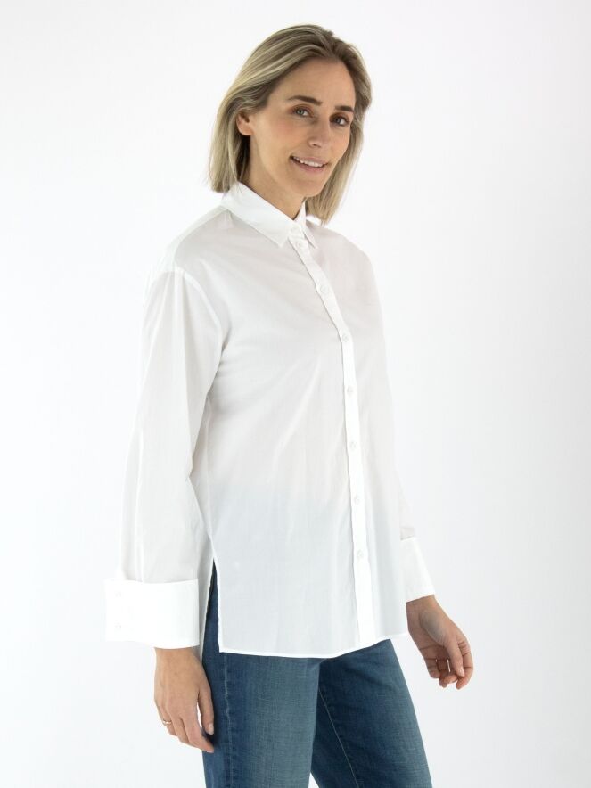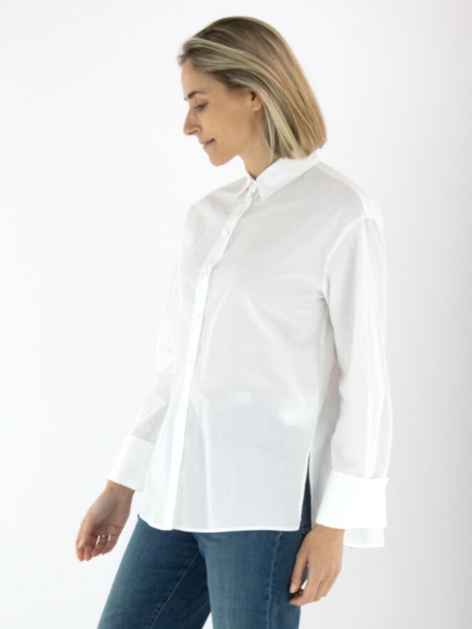 Een blouse van Marc Cain in de kleur wit. Aan de onderkant zijn aan beide zijkanten korte splitjes. Aan het uiteinde van de lange mouwen zitten brede manchetten. Deze blouse kan op 30 graden worden gewassen.