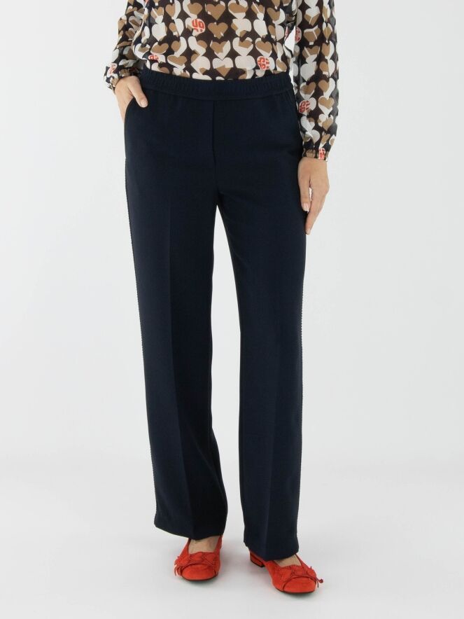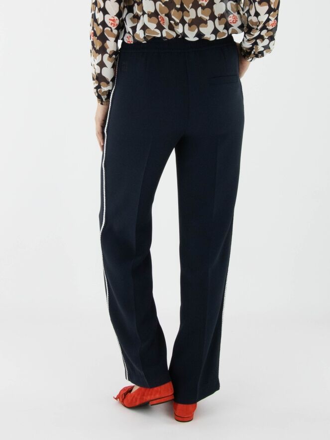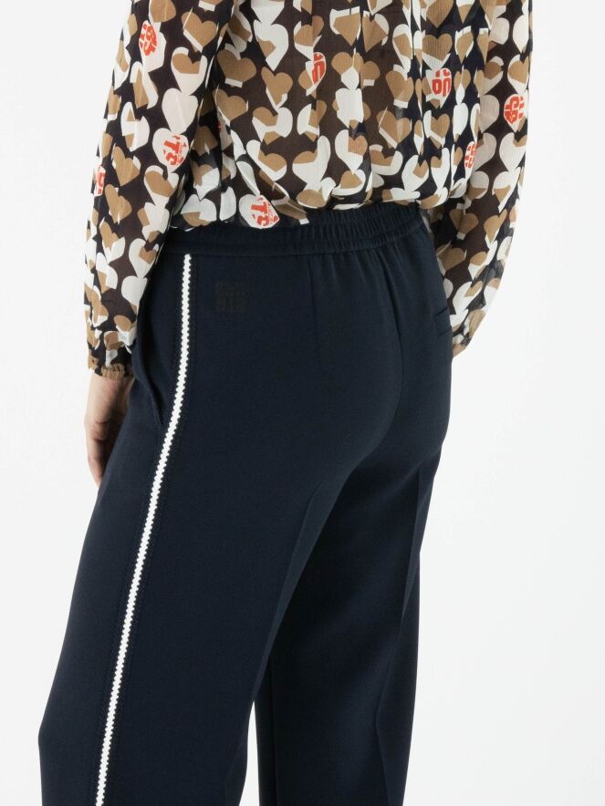 Een joggingbroek van Marc Cain in de kleur marineblauw. In de taille zit een fijn geplooide elastische band. Langs de zijkanten loopt een gebreide bies met een gestreept patroon in de kleuren wit en marineblauw. De broek heeft steekzakken en kan op 30 graden worden gewassen.
