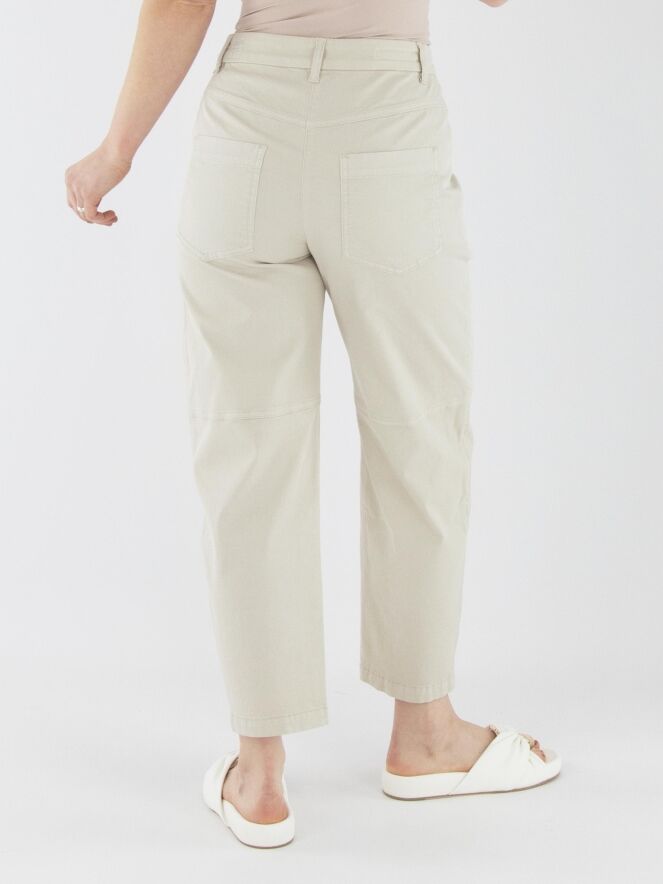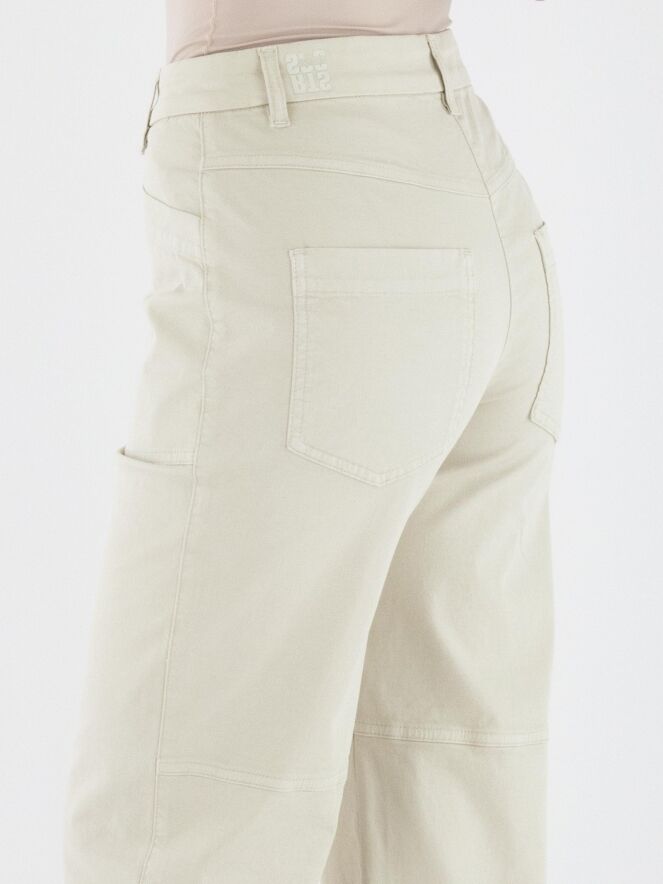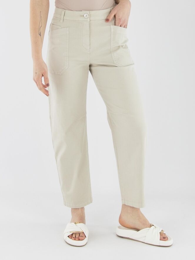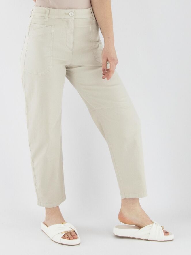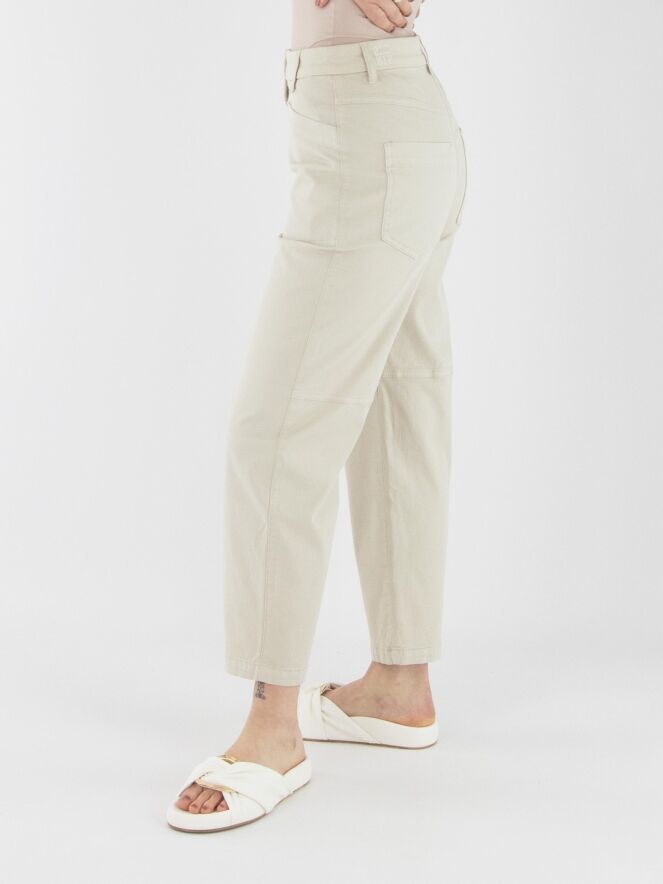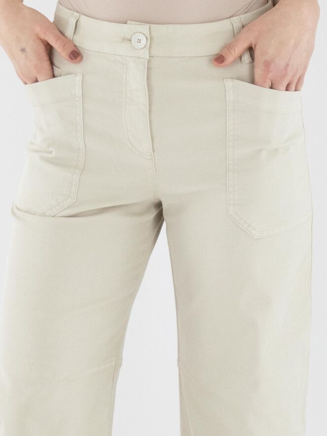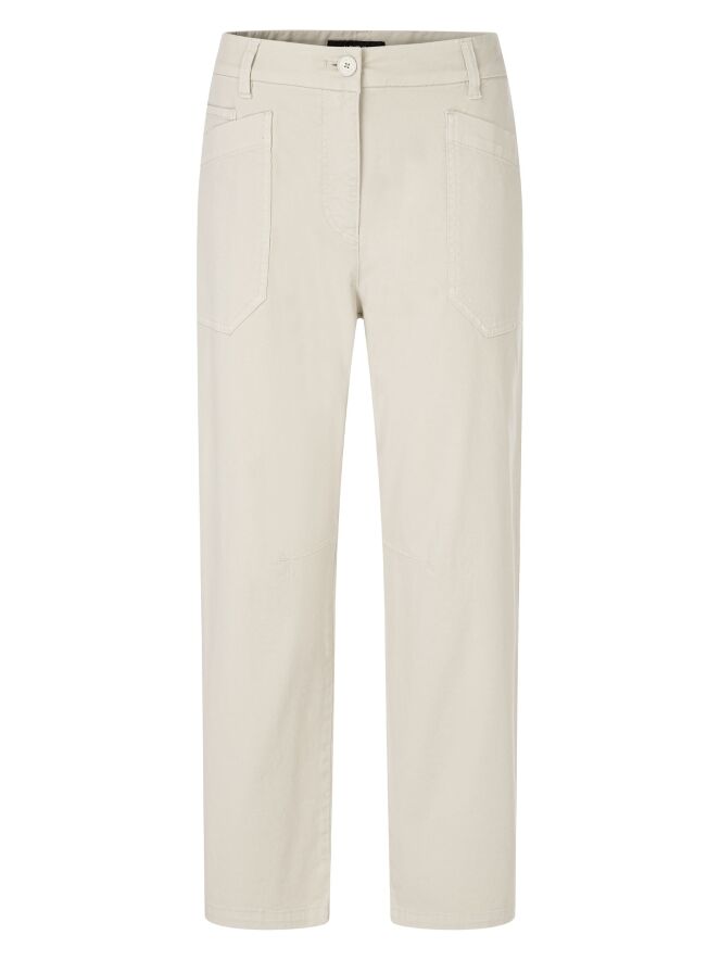 Een broek van Marc Cain in de kleur beige. De broek heeft een 5-pocketmodel met diepe zakken aan de voorzijde. Ter hoogte van de knieën is aan de binnenzijde een coupenaad aangebracht. Deze broek kan op 30 graden worden gewassen.