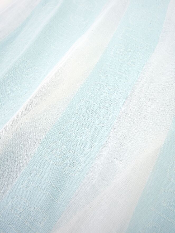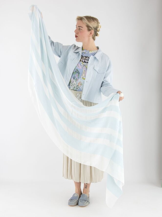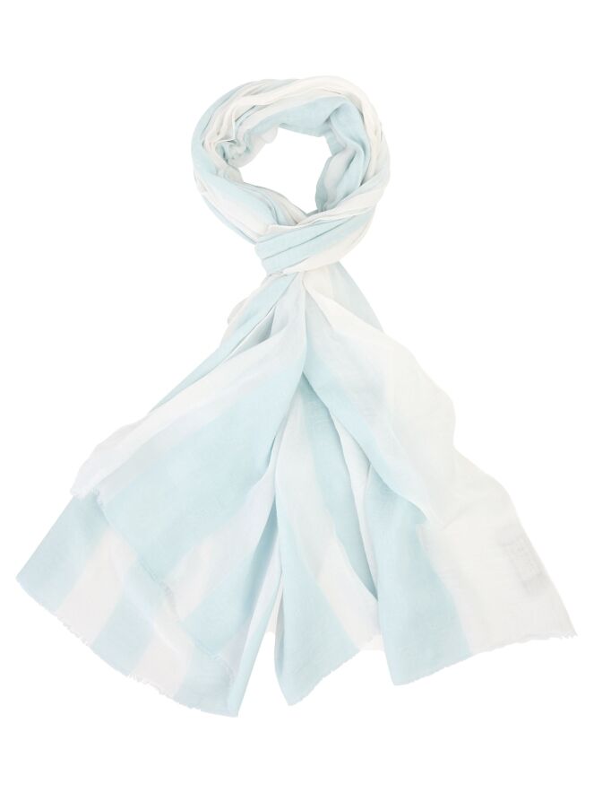 Een licht transparante shawl van Marc Cain met een streeppatroon in pastelblauw en wit. De uiteinden van de shawl zijn subtiel gerafeld. Deze shawl mag met de hand worden gewassen.