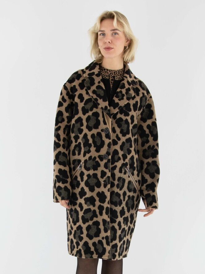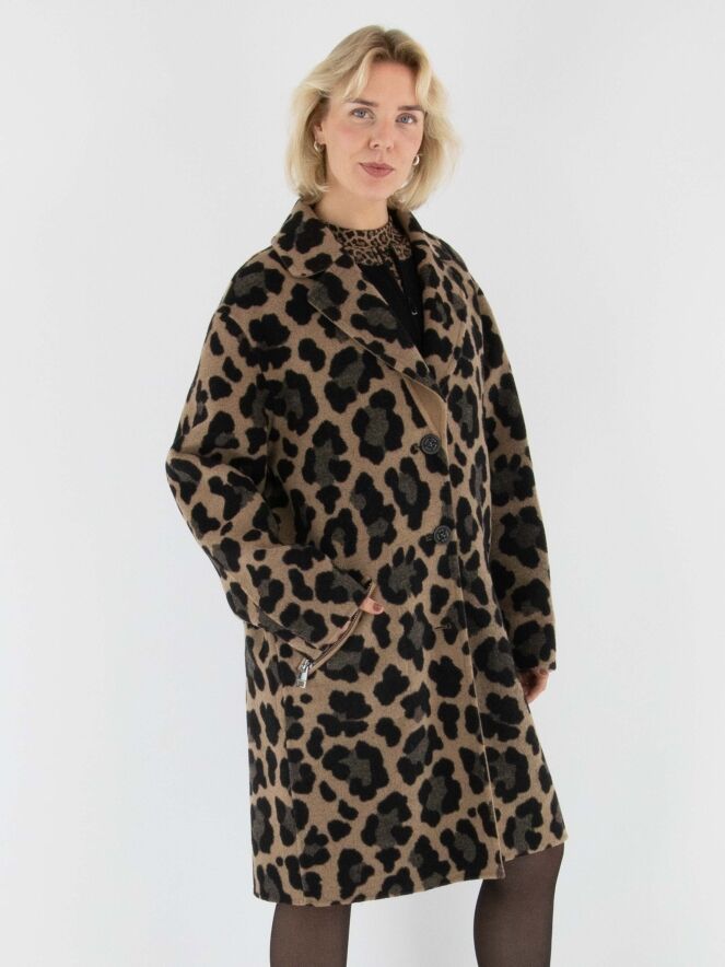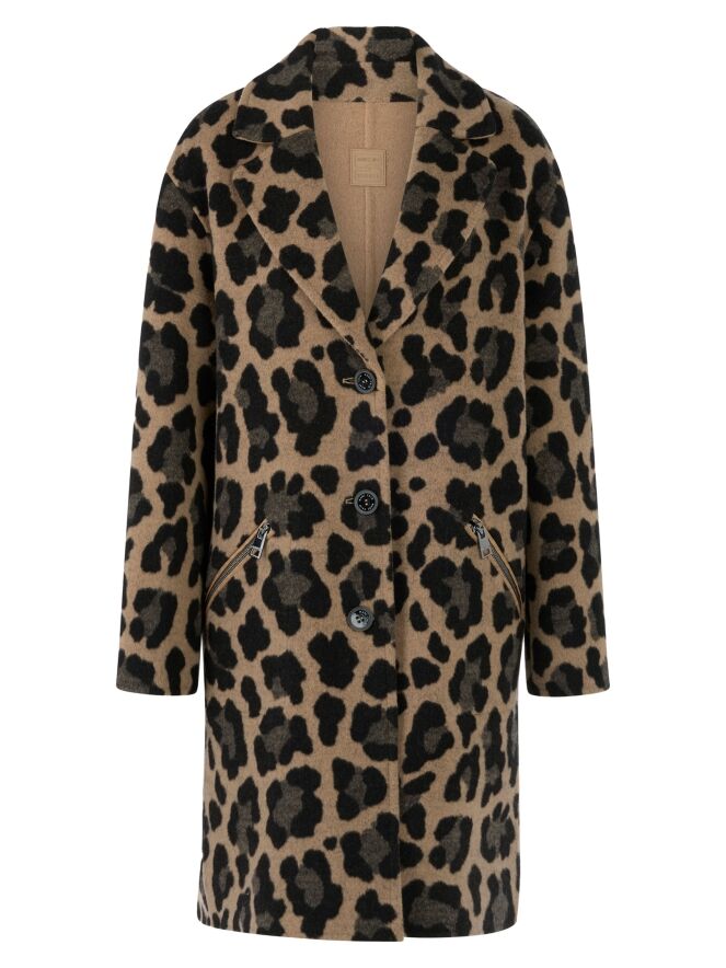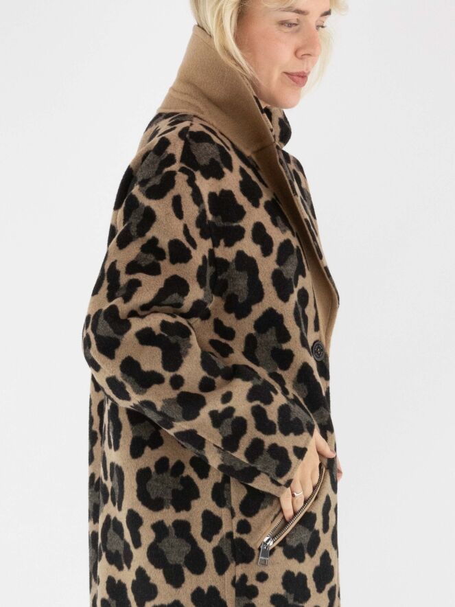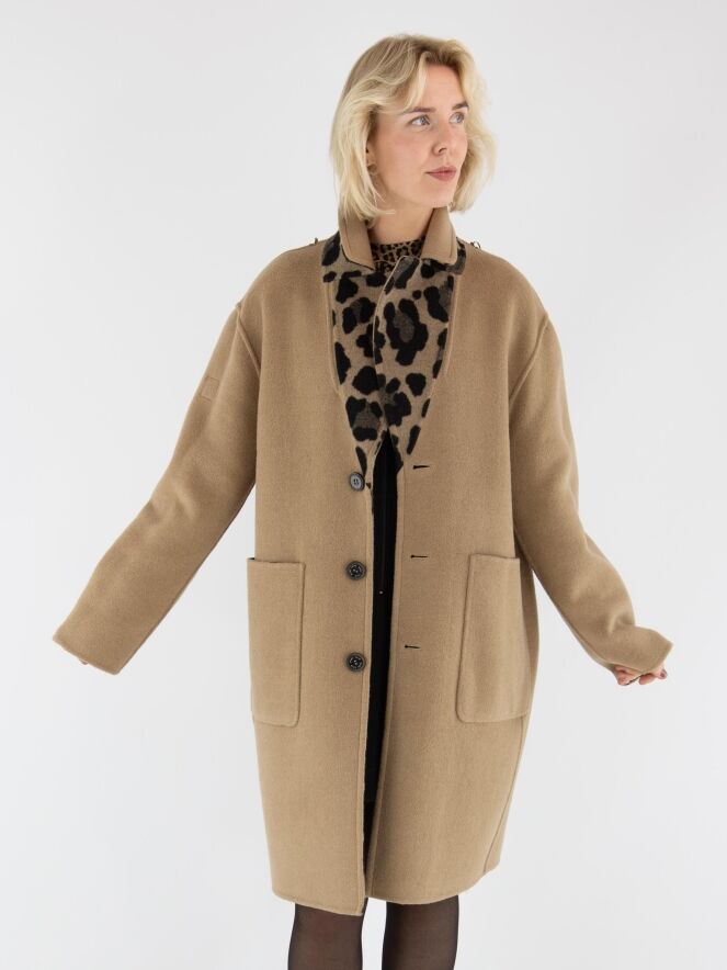 Een reversible mantel van Marc Cain met aan één zijde een uni camelkleur en aan de andere zijde een panterprint in verschillende bruintinten met zwart. De mantel heeft een sluiting met twee knopen en de zakken zijn voorzien van een diagonale ritssluiting. Deze mantel mag niet worden gewassen.