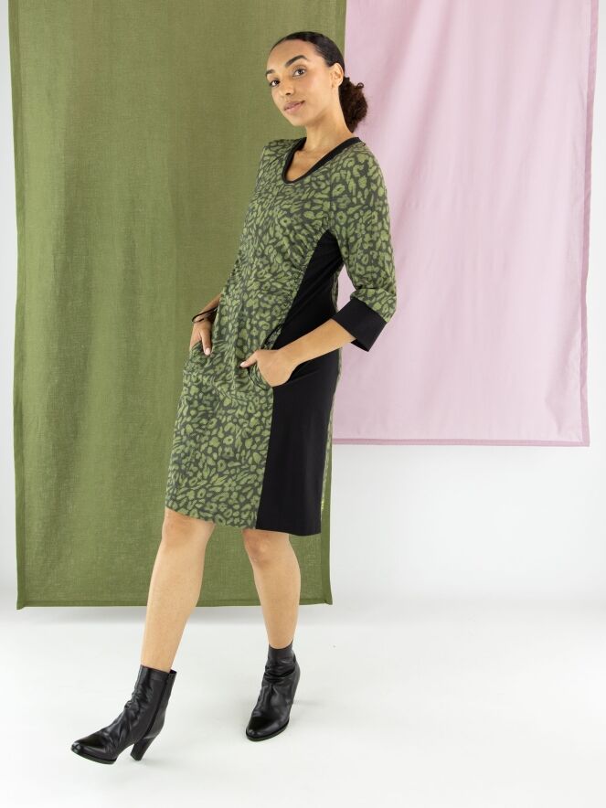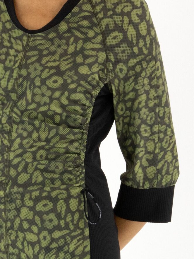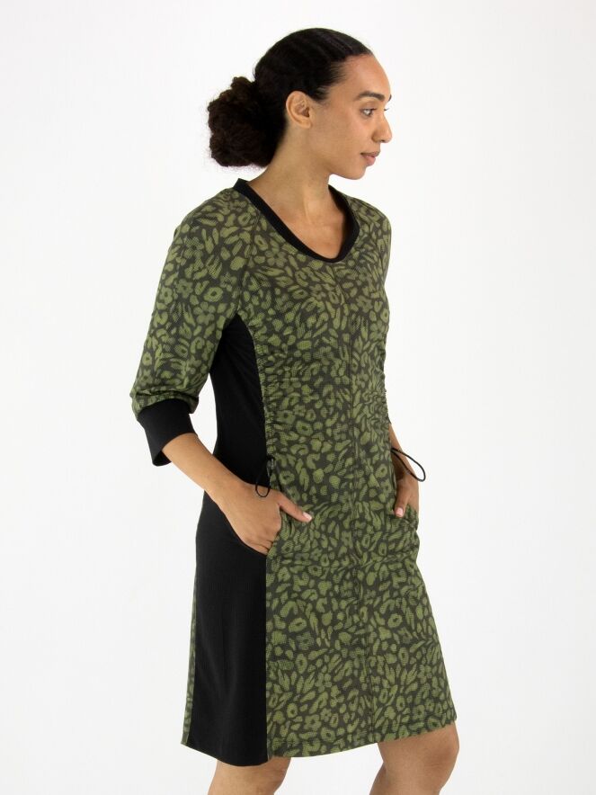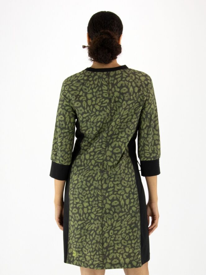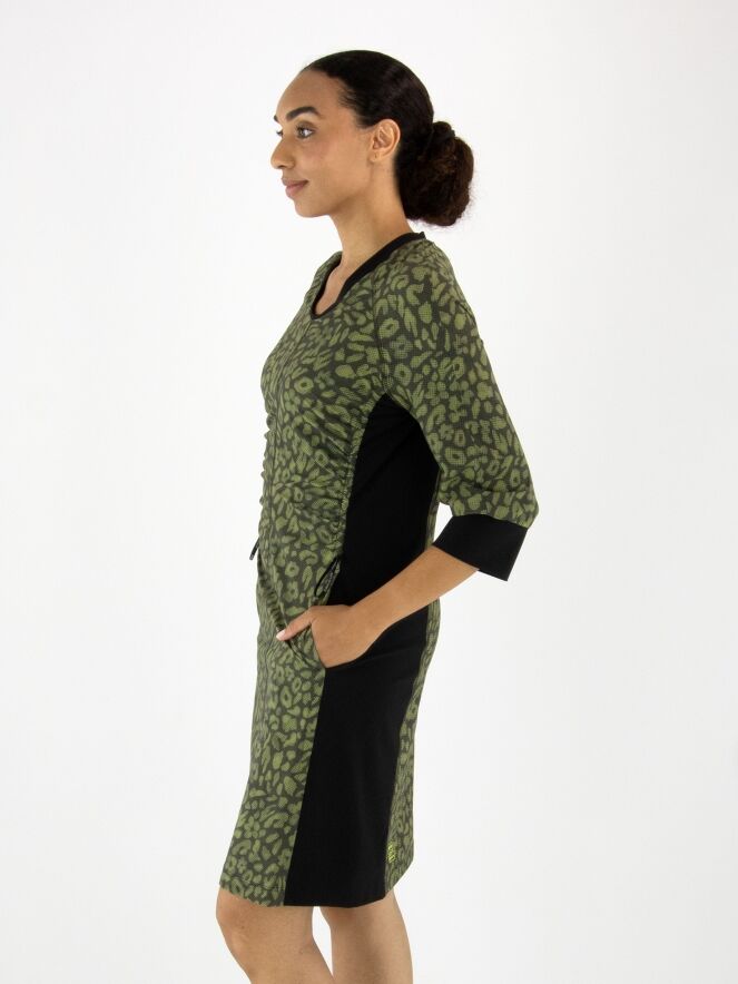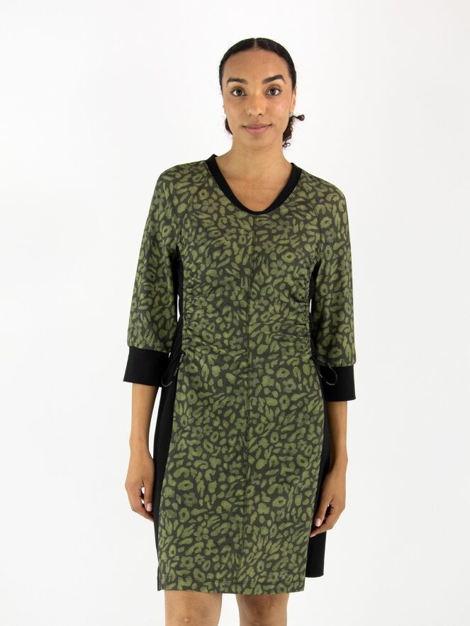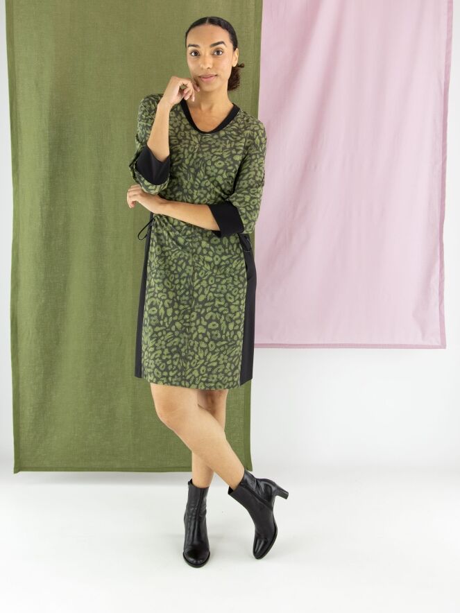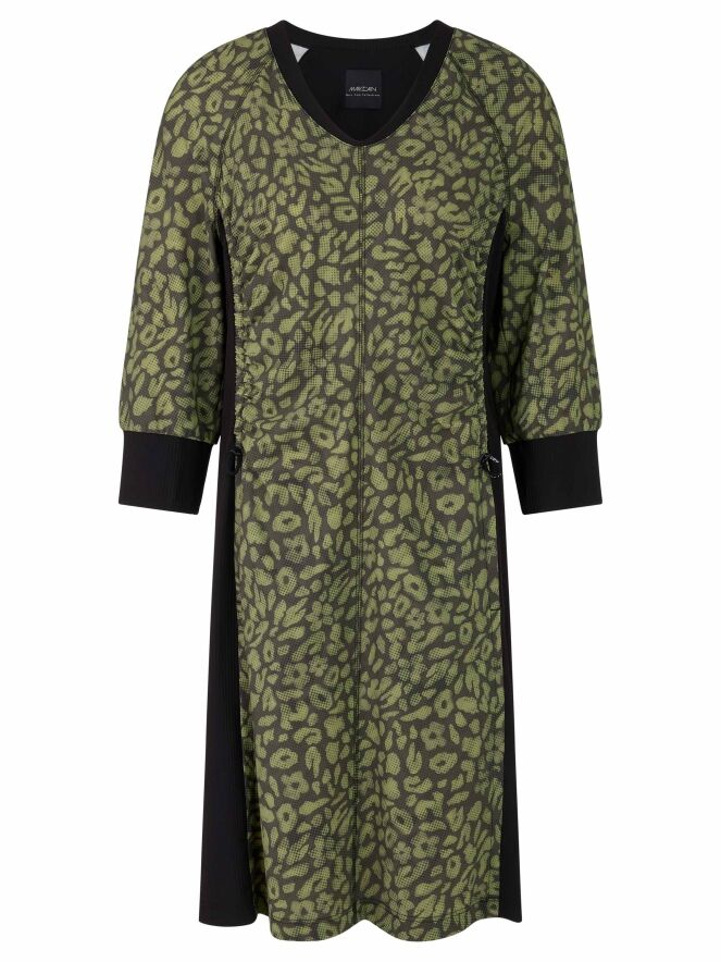 Een jurk van Marc Cain in een print met meerdere tinten olijfgroen en pistachegroen gecombineerd met zwart. Langs de rand van de hoge hals zit een fijn geribbelde boord. Dit detail komt terug aan de uiteinden van de halflange mouwen. Vanuit de hals loopt een rits tot net boven de taille. Vanaf de onderkant van de mouwinzet loopt er in de naad een koord in een tunnelverwerking tot aan de taille, waarmee een plooi-effect kan worden gecreëerd. Langs de zijkanten is de stof fijn geribbeld. Deze jurk mag op 30 graden worden gewassen.