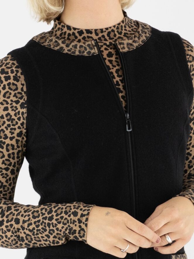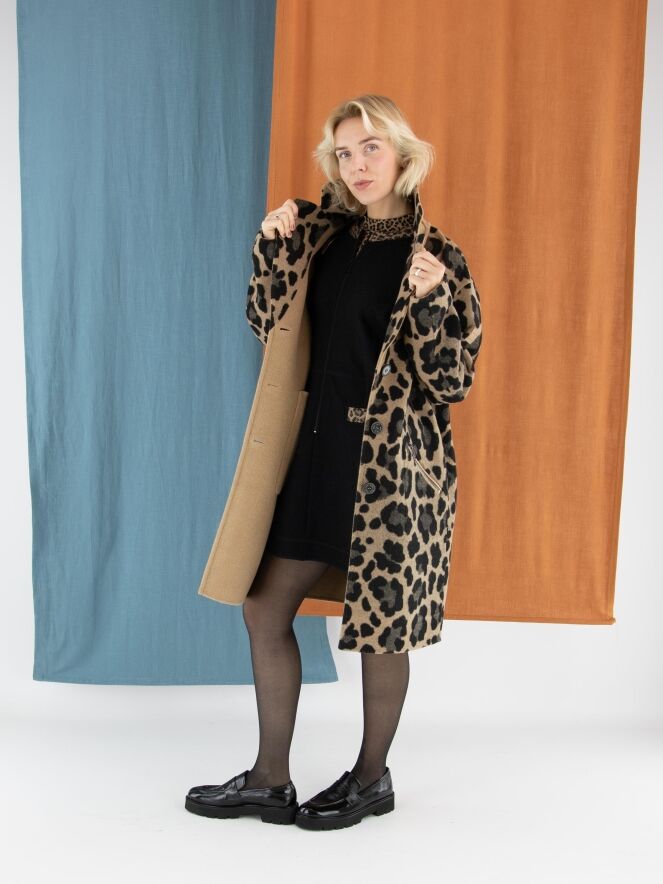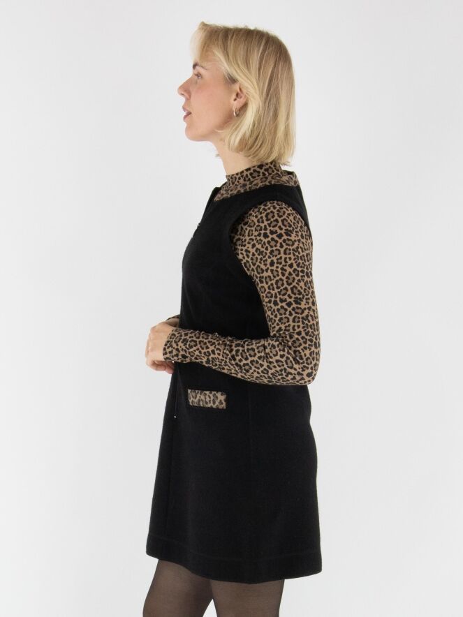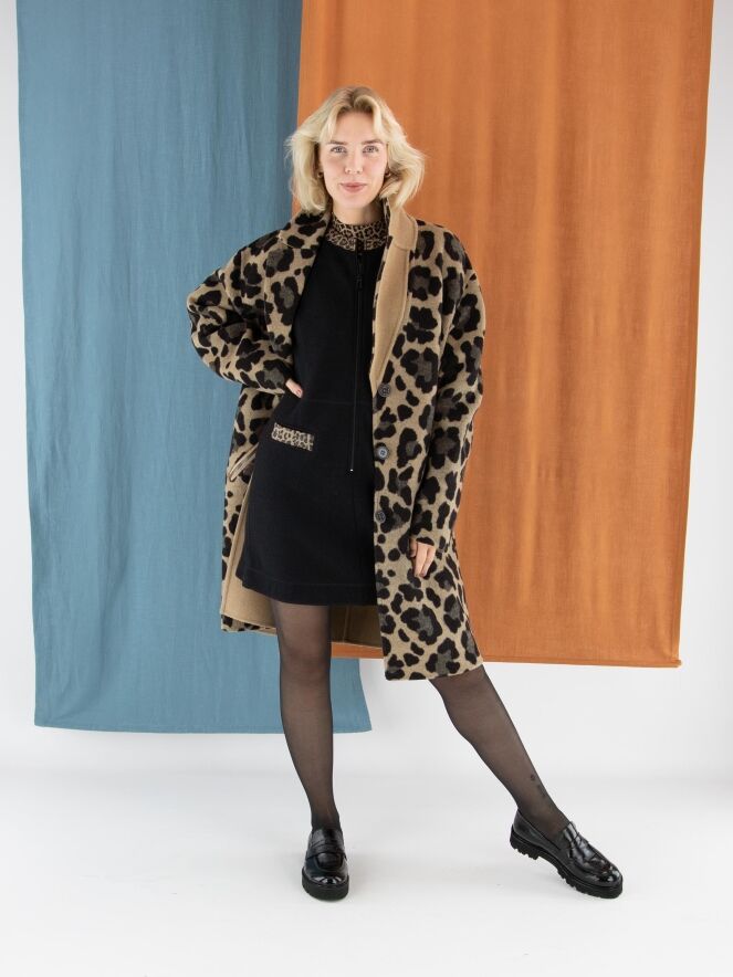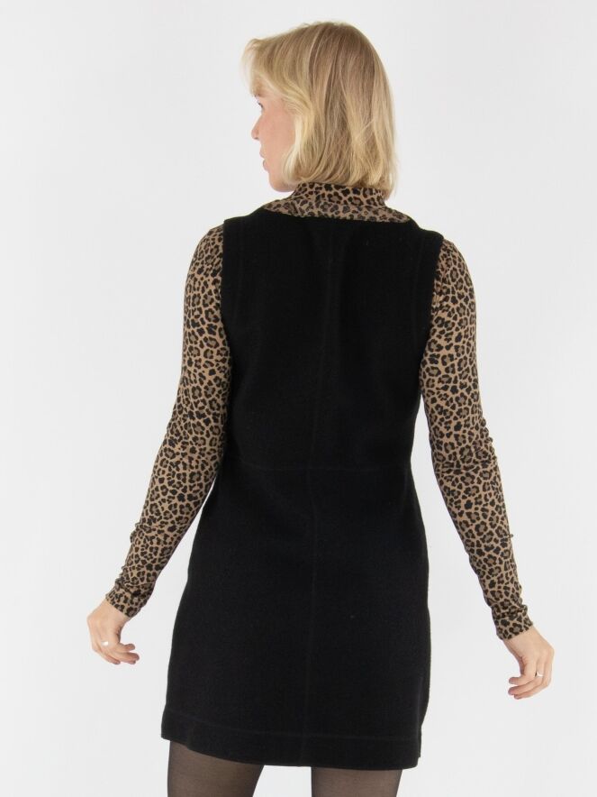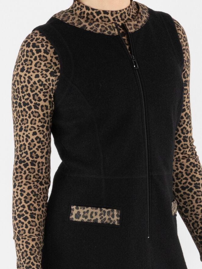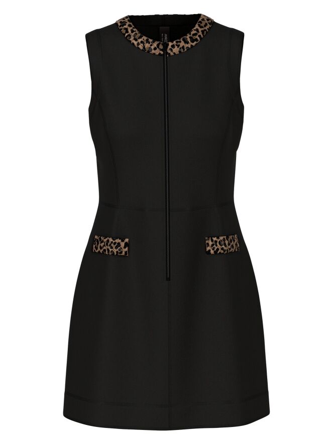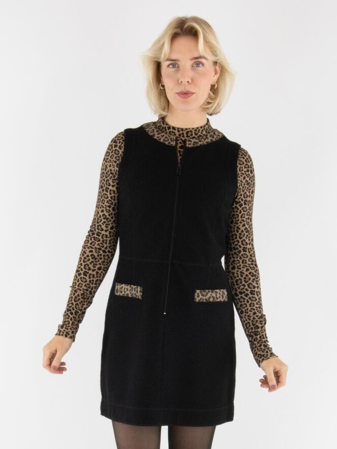 Een elegante jurk van Marc Cain in een gekookte wolkwaliteit in de kleur zwart. Langs de rand van de ronde hals loopt een gewatteerde bies in panterprint met bruin- en zwarttinten. Dit detail komt ook terug in de randen van de zakken aan de voorzijde, wat zorgt voor een stijlvol geheel. Vanuit het midden van de hals loopt een rits tot onder de taille. Deze jurk mag niet worden gewassen.