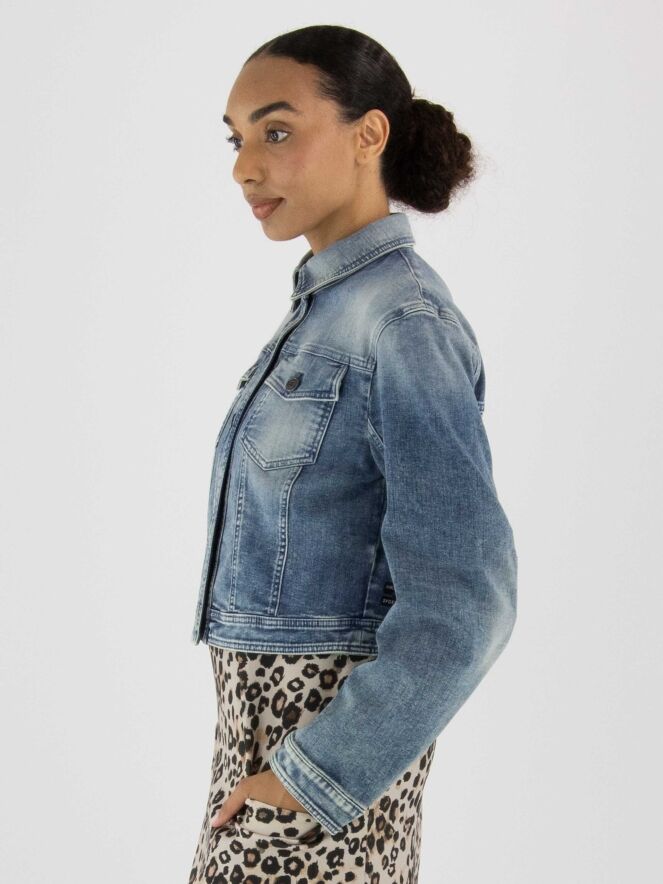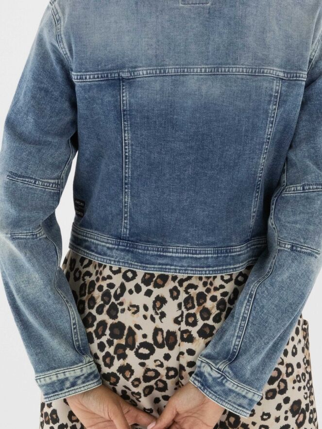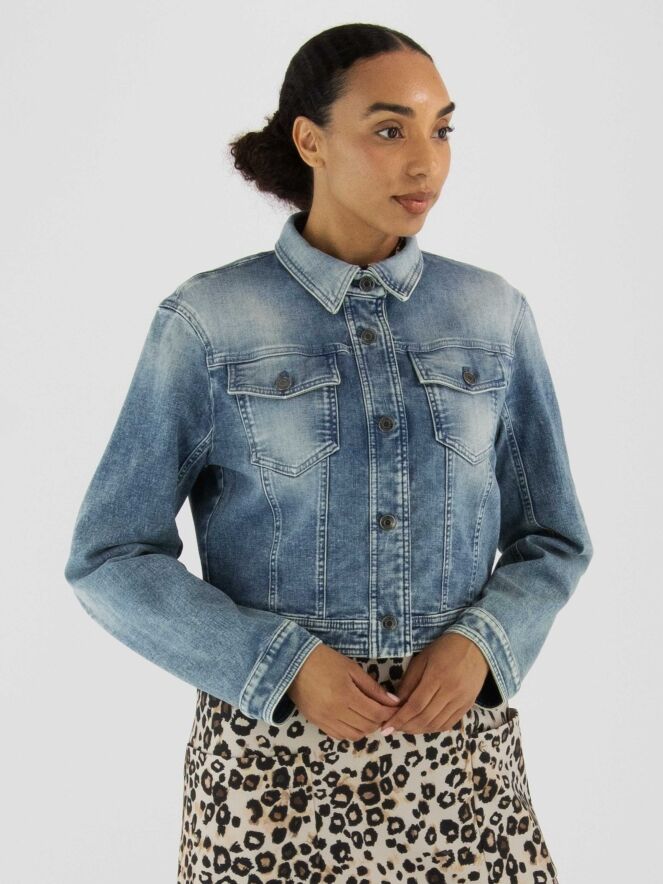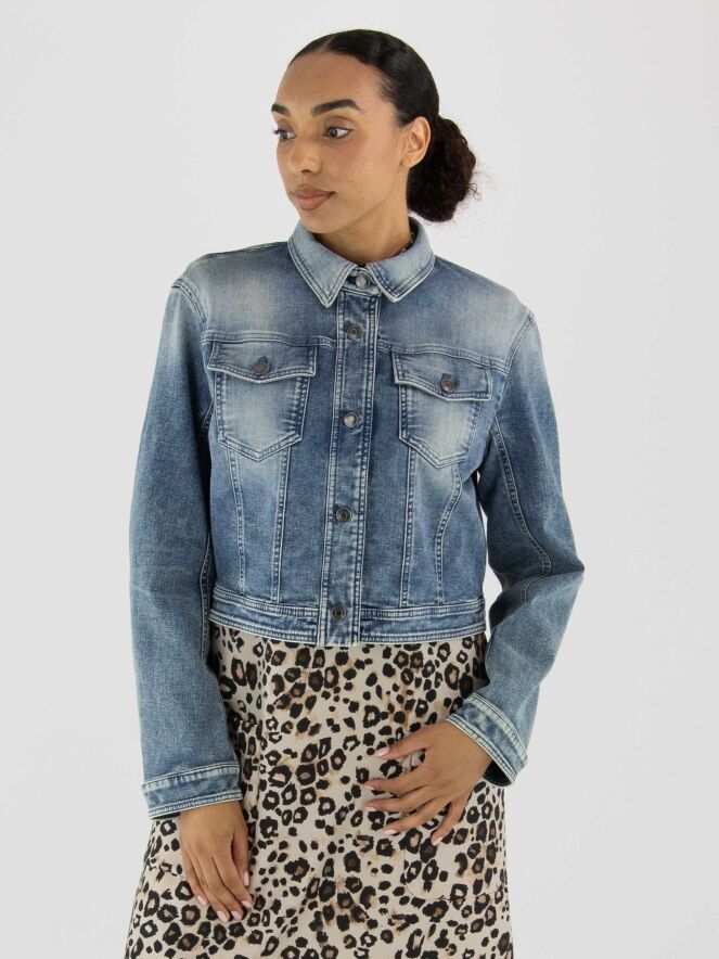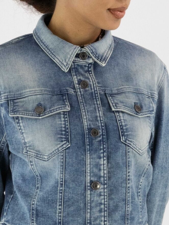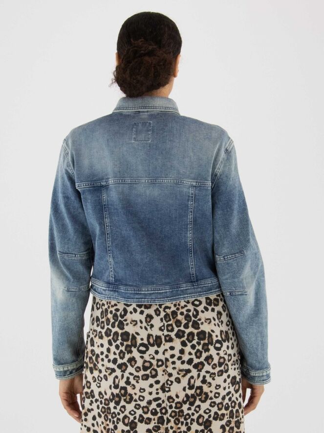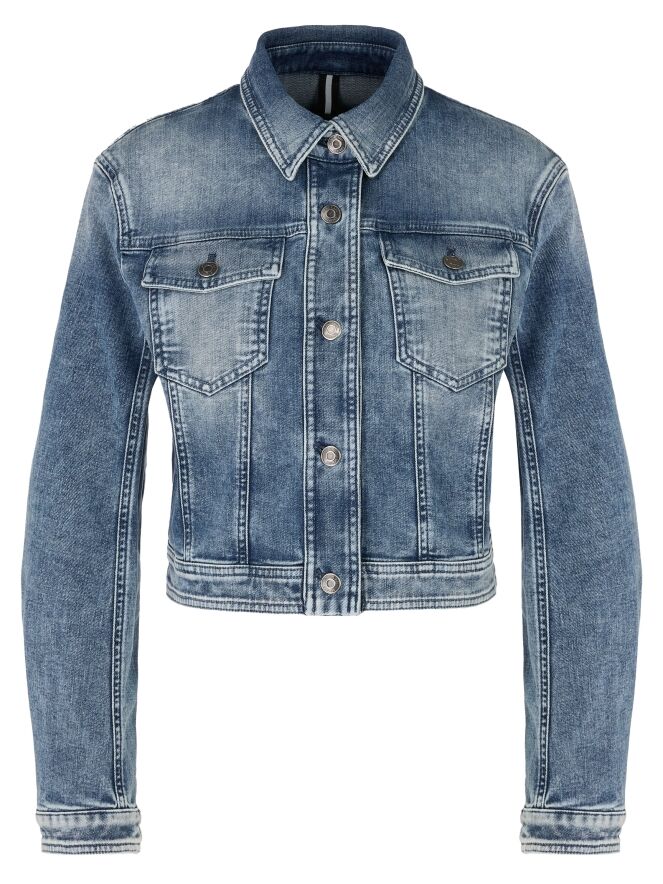 Een korte jeansblazer van Marc Cain in een used-jeanslook. De blazer heeft een sluiting met vijf knopen en mag op 30 graden worden gewassen.