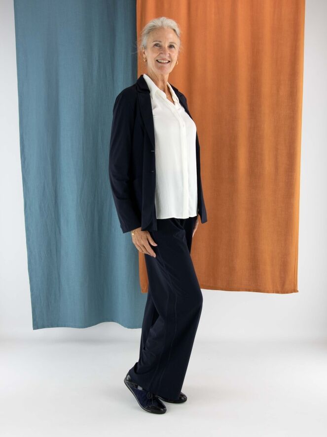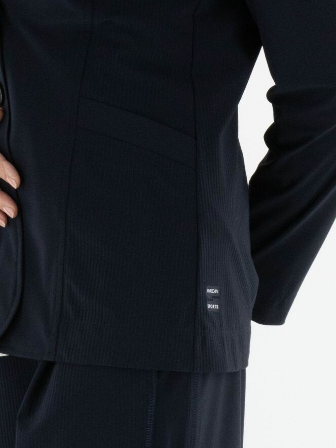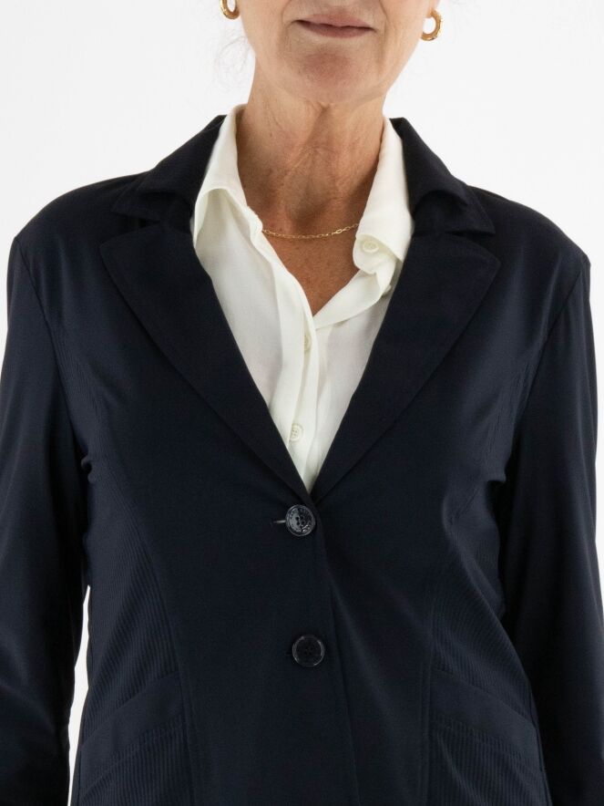 Een blazer van Marc Cain in de kleur marineblauw. De zijkanten van de voor- en achterkant hebben een krijtstreepstructuur. De bovenste laag van de dubbele kraag is eveneens uitgevoerd in deze geribbelde stof. De blazer heeft een sluiting met twee knopen en is ongevoerd. Deze blazer mag op 30 graden worden gewassen.