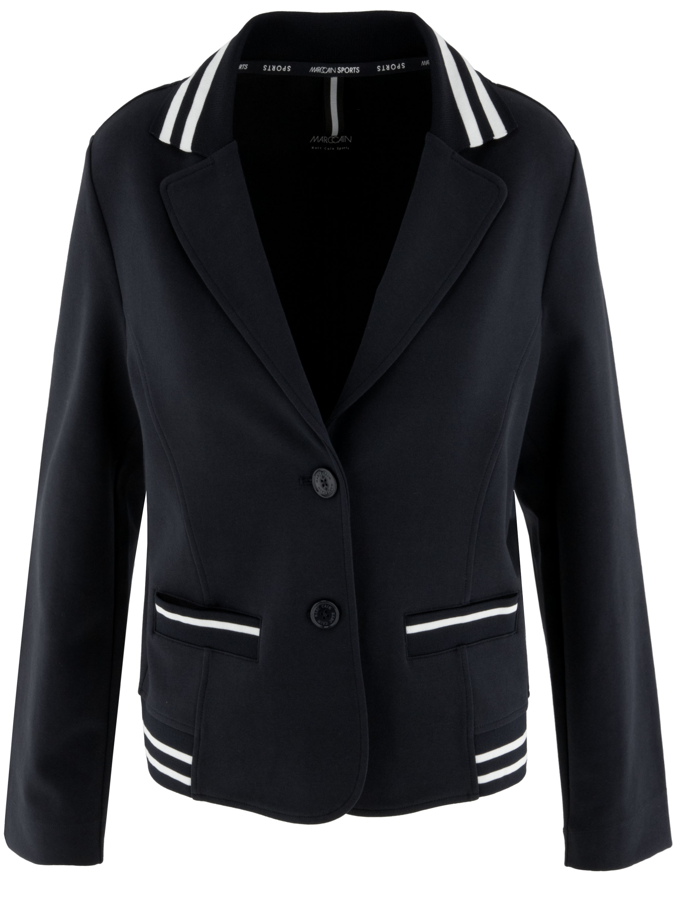 Een blazer van Marc Cain in de kleur marineblauw. De gestreepte kraag en de zoom zijn uitgevoerd in een fijn geribbelde tricotstof. Langs de rand van de zakken loopt een bies van dezelfde tricotstof. De blazer is ongevoerd en sluit met twee knopen. Deze blazer mag op 30 graden worden gewassen.