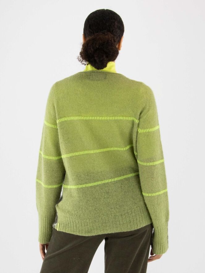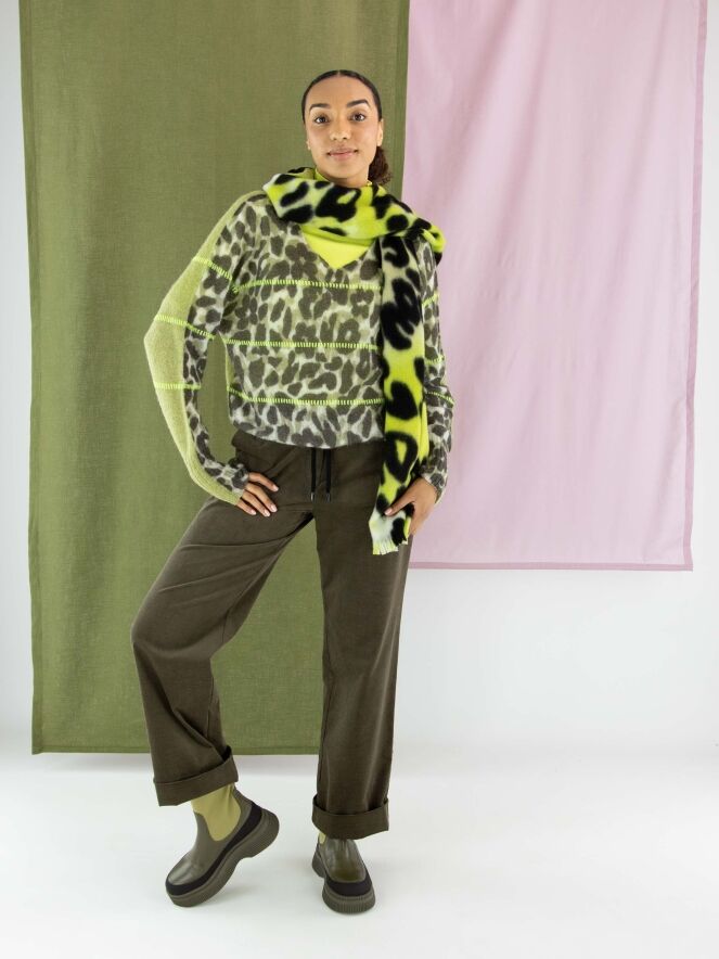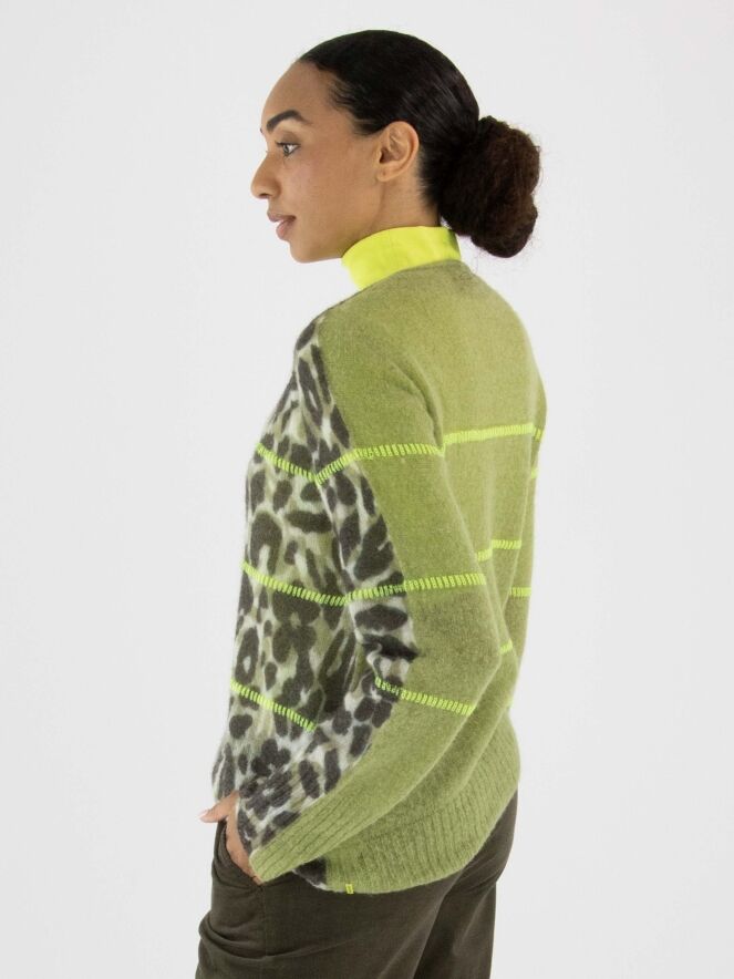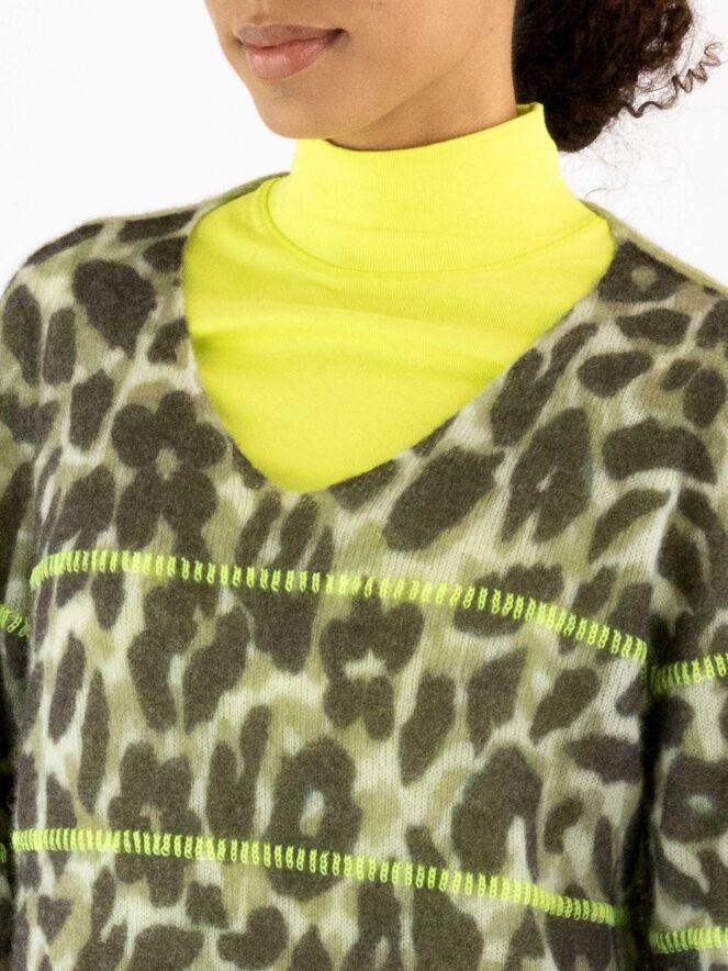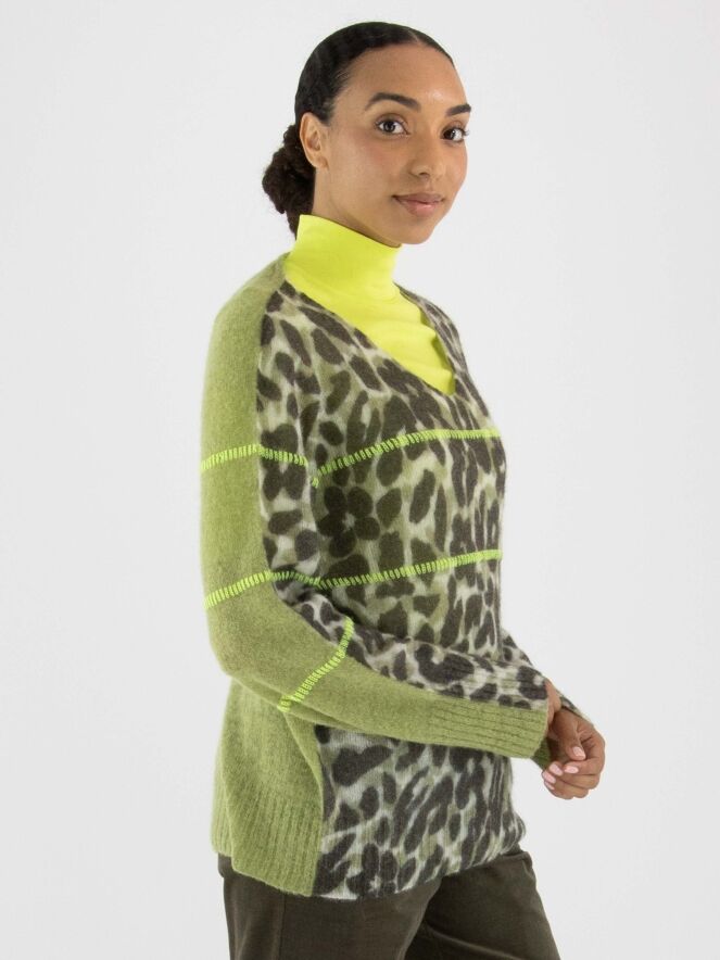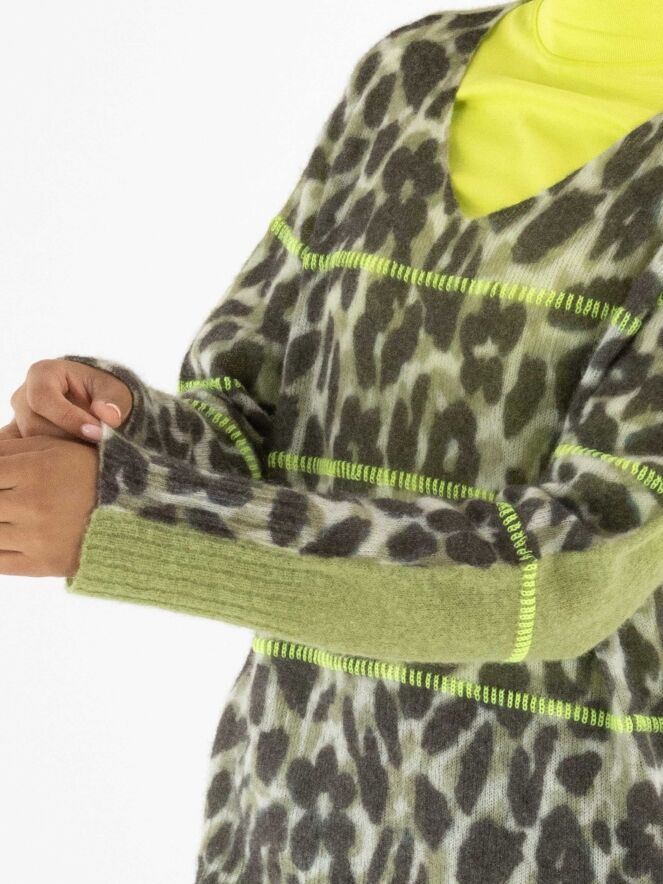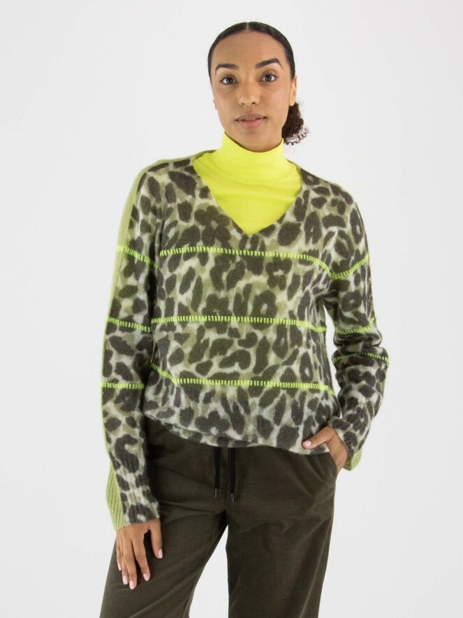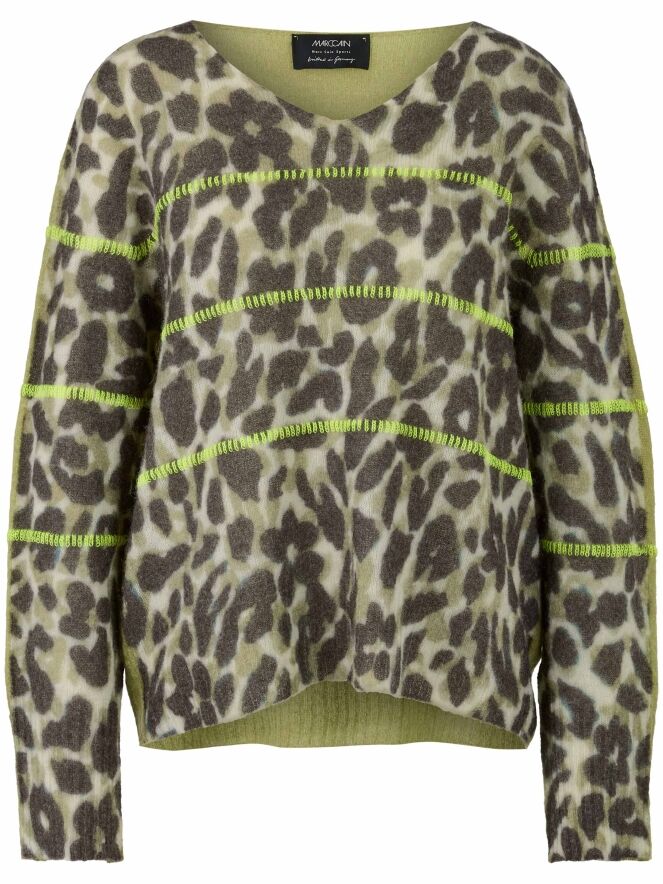 Een pullover van Marc Cain in een panterprint met meerdere tinten olijfgroen en roomwit. De achterkant is uitgevoerd in een uni pistachegroene kleur. In de pullover zijn drie limegroene lijnen gebreid. De pullover heeft een V-hals en mag met de hand worden gewassen.