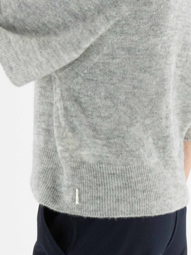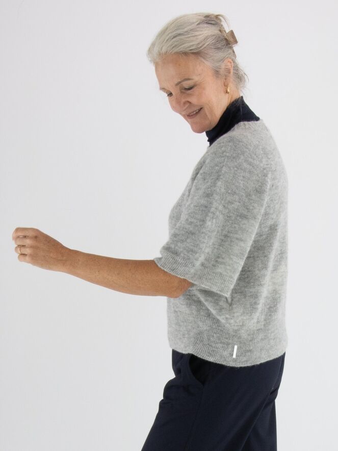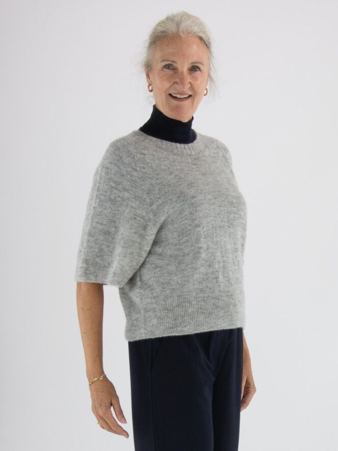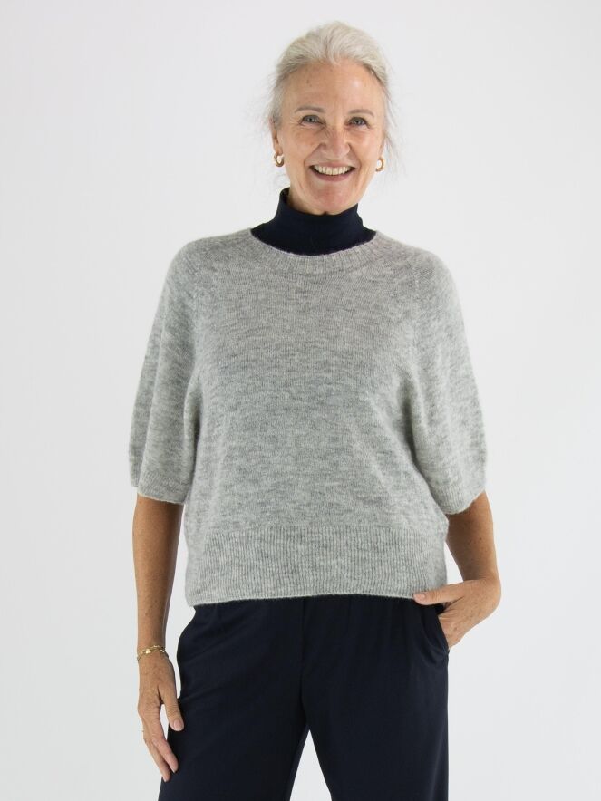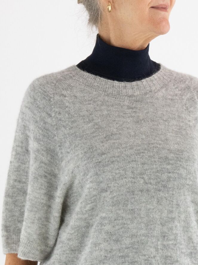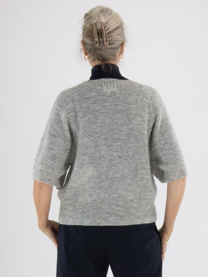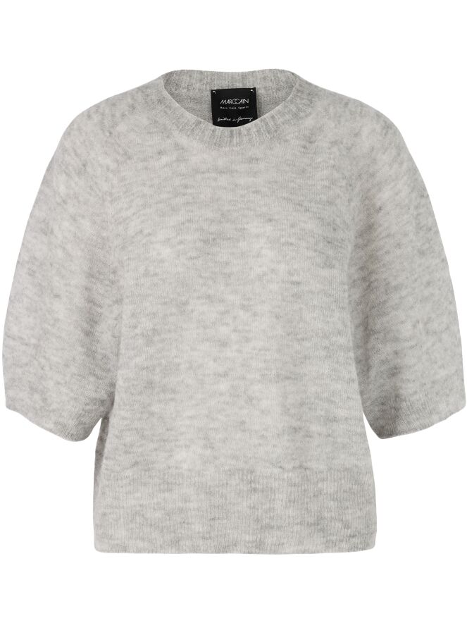 Een gemêleerde pullover van Marc Cain in meerdere tinten grijs. De pullover heeft een ronde hals en korte mouwen. Deze pullover mag met de hand worden gewassen.