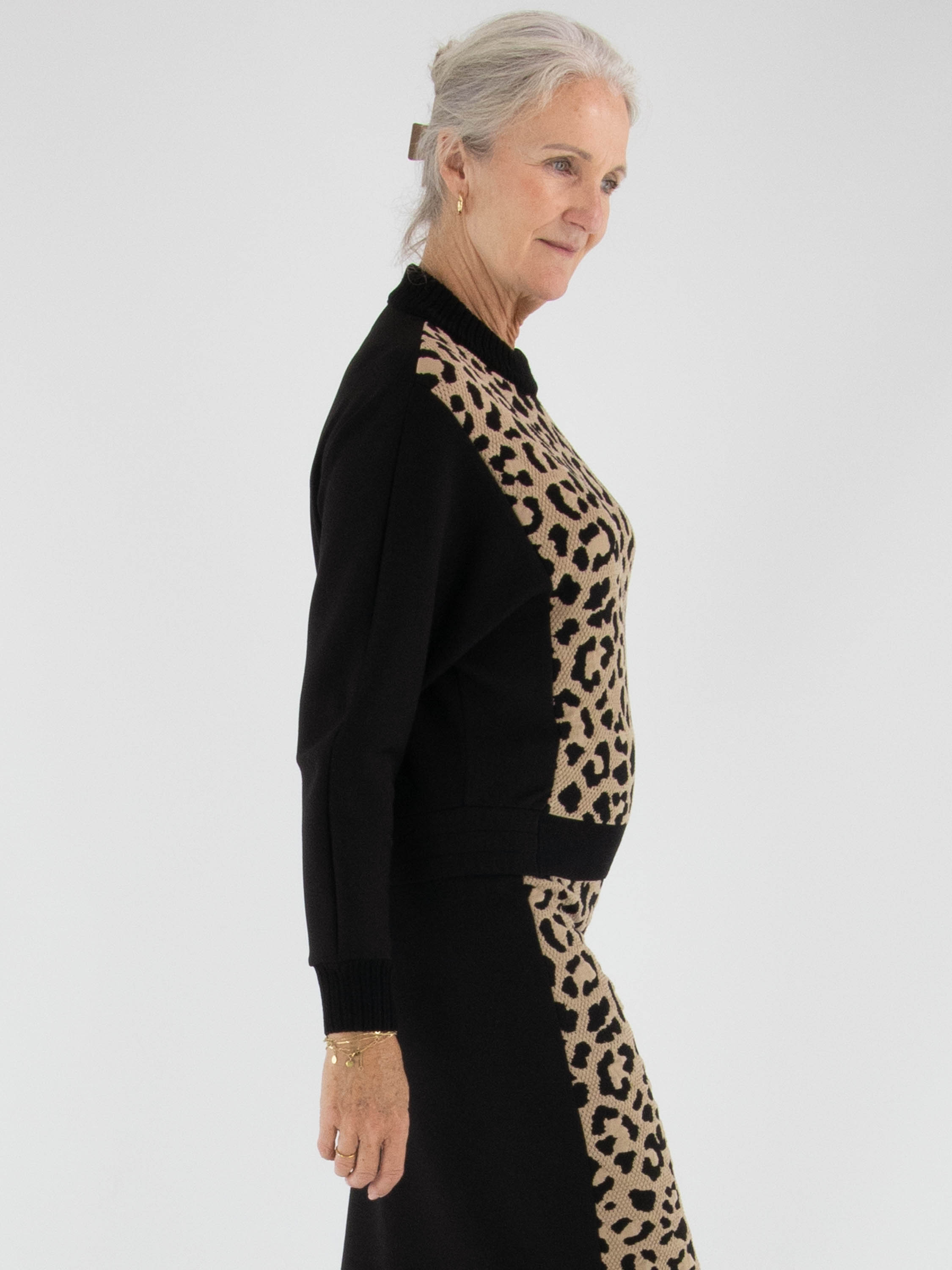 Een pullover van Marc Cain met aan de voorkant een panterprint in camel en zwart op een fijn geperforeerde stof, en aan de achterkant een uni scuba kwaliteit. Langs de rand van de ronde hals en de uiteinden van de lange mouwen zit een geribbelde tricot boord. Aan de onderkant is de achterkant afgewerkt met een geplooide elastische band en de voorkant met een fijn tricot boord. Deze pullover kan op 30 graden worden gewassen.