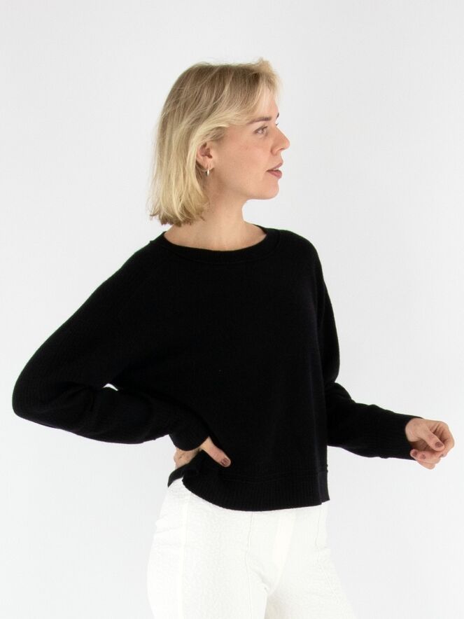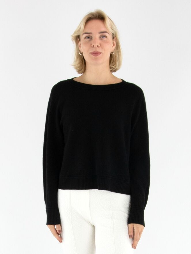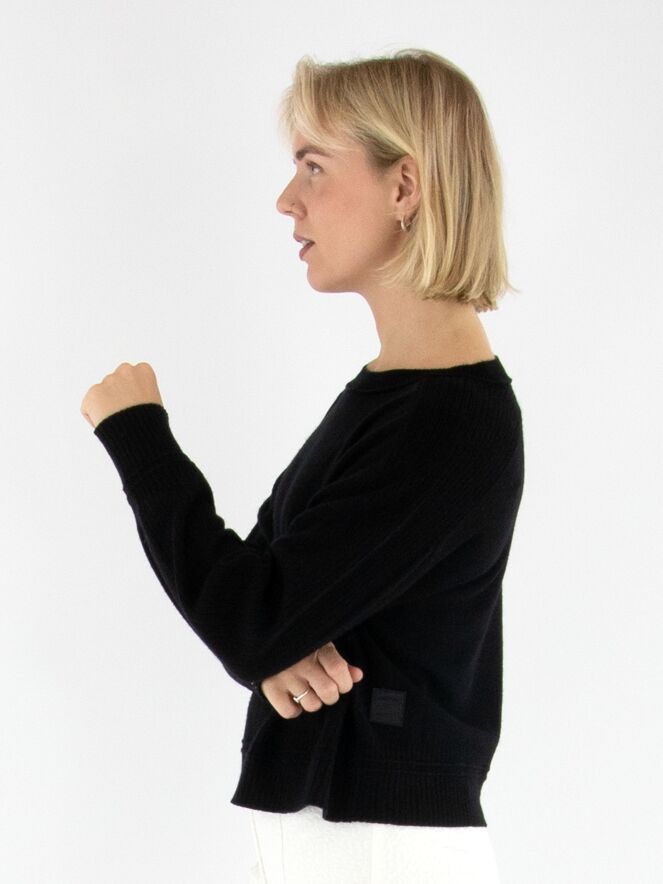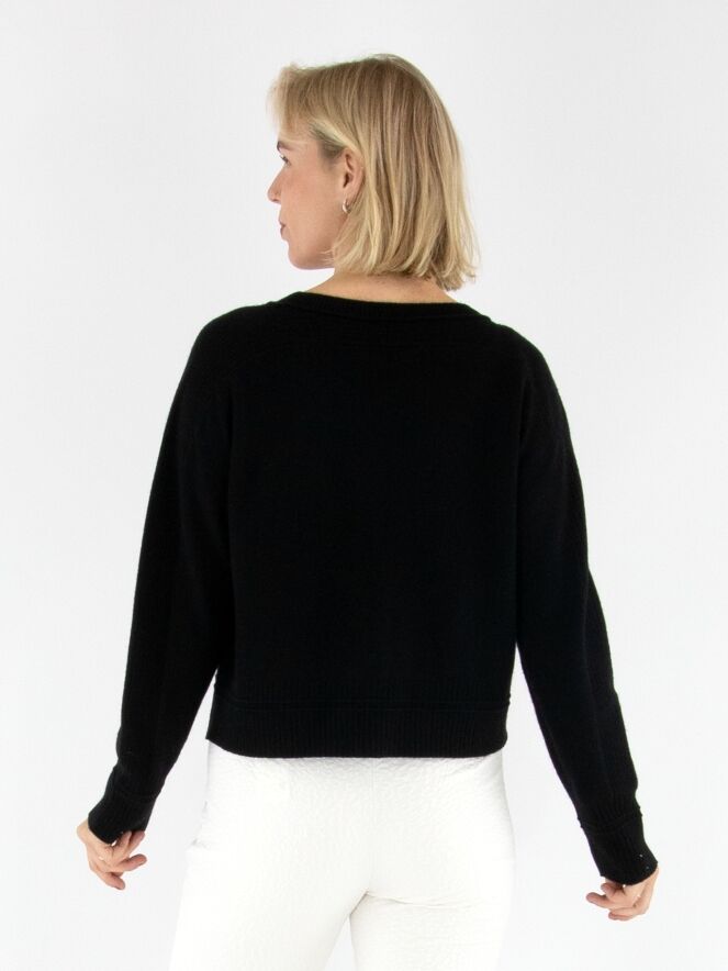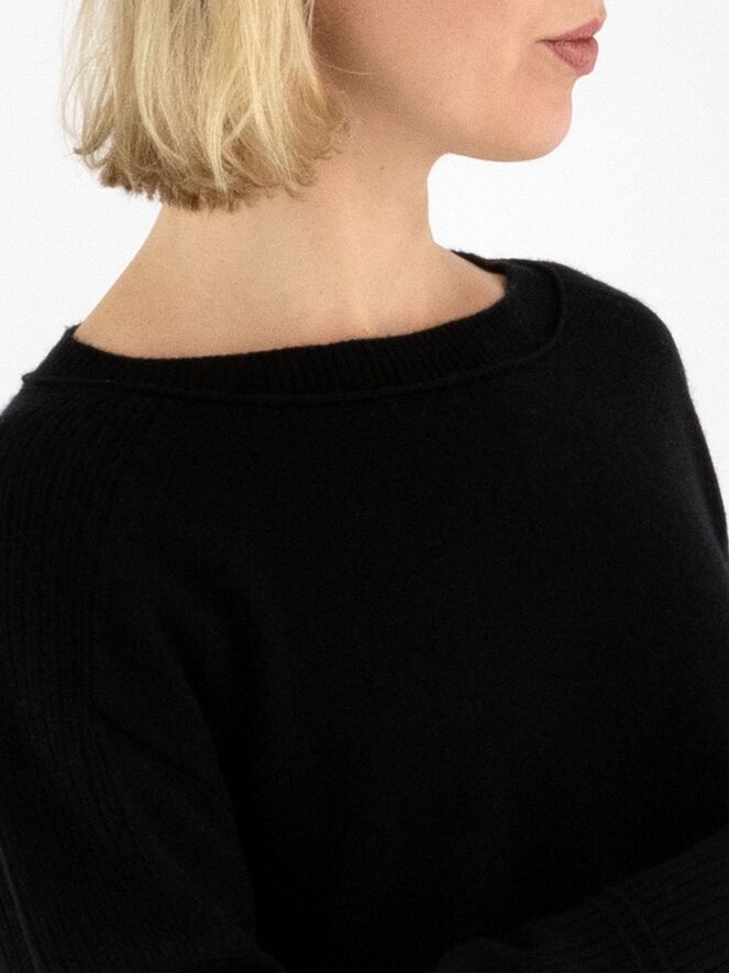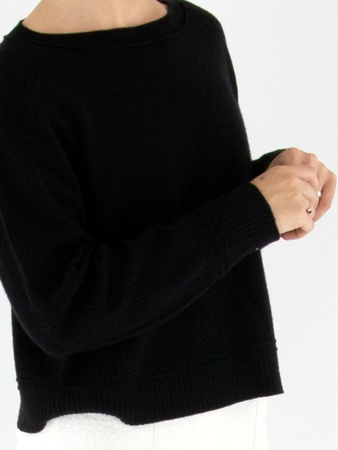 Een pullover van Marc Cain in de kleur zwart. Langs de rand van de ronde hals, de bovenzijde en de uiteinden van de mouwen en de zoom is de stof fijn geribbeld, wat de trui een subtiel structuuraccent geeft. Deze pullover kan met de hand worden gewassen.