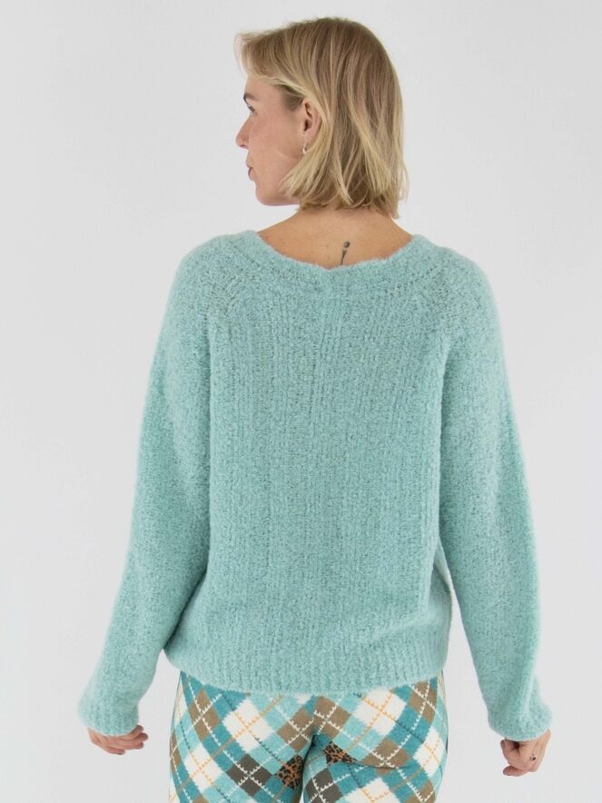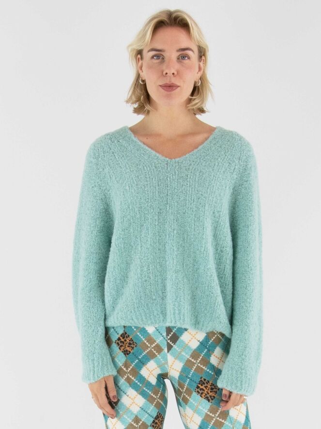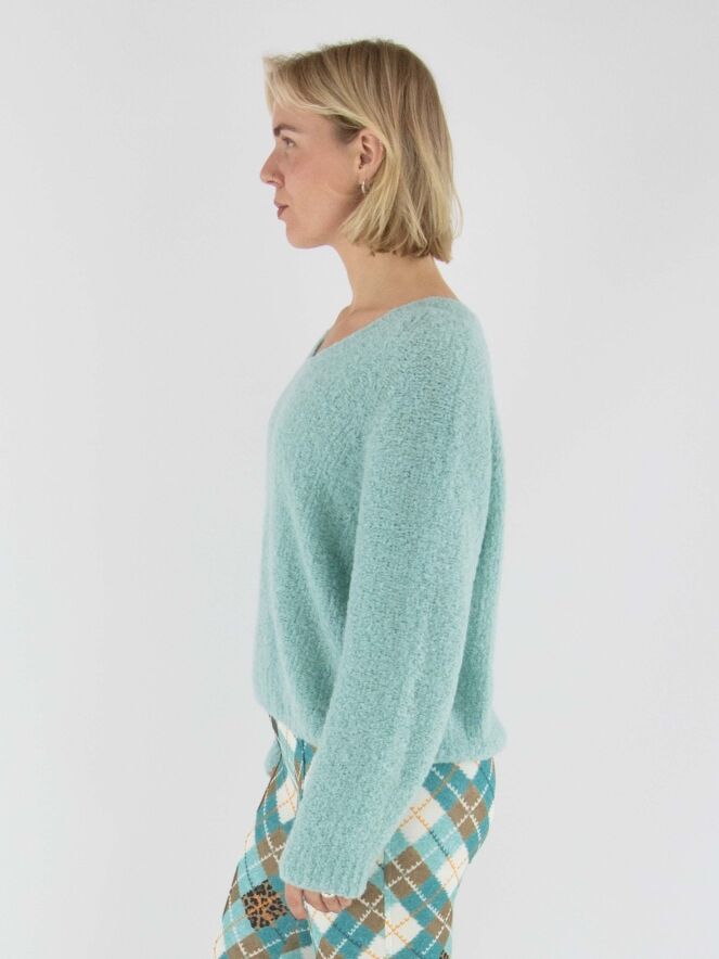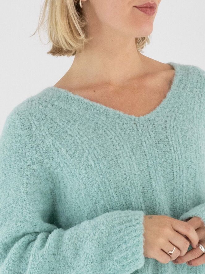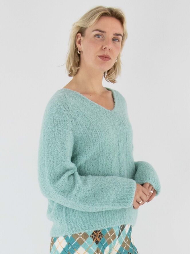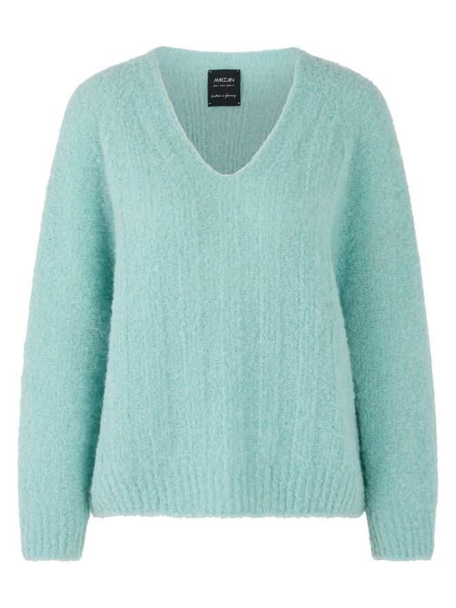 Een elegante pullover van Marc Cain in een frisse turquoise tint. De stof is verfijnd uitgevoerd met een subtiel verticaal streeppatroon. De pullover heeft een vrouwelijke V-hals en lange mouwen. Dit model kan met de hand worden gewassen.