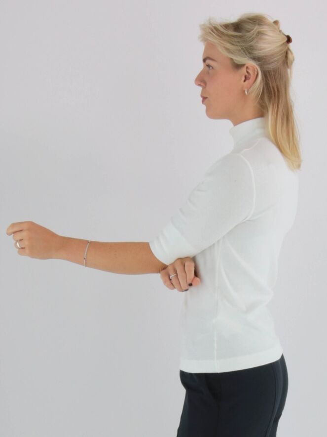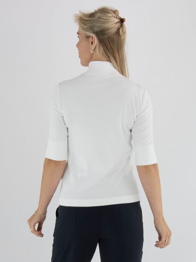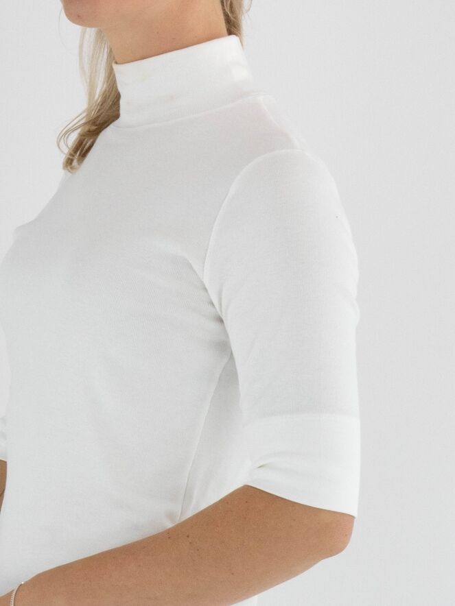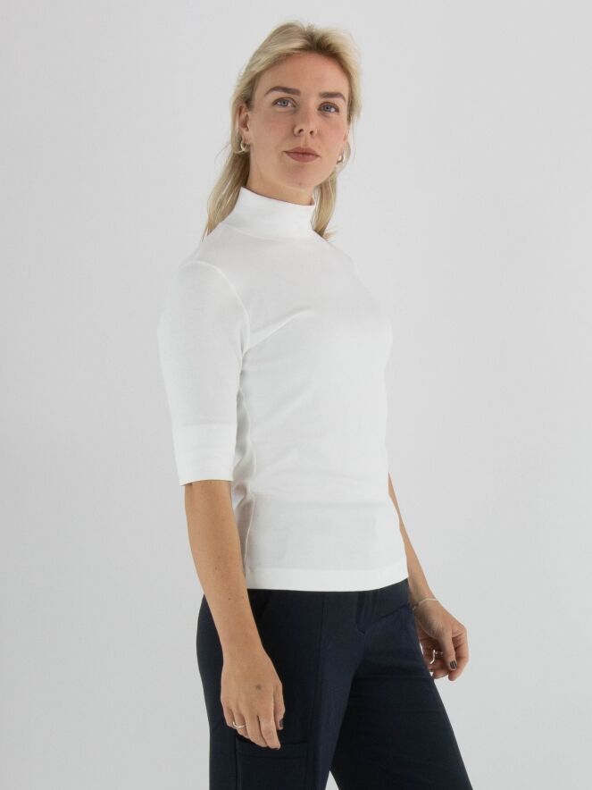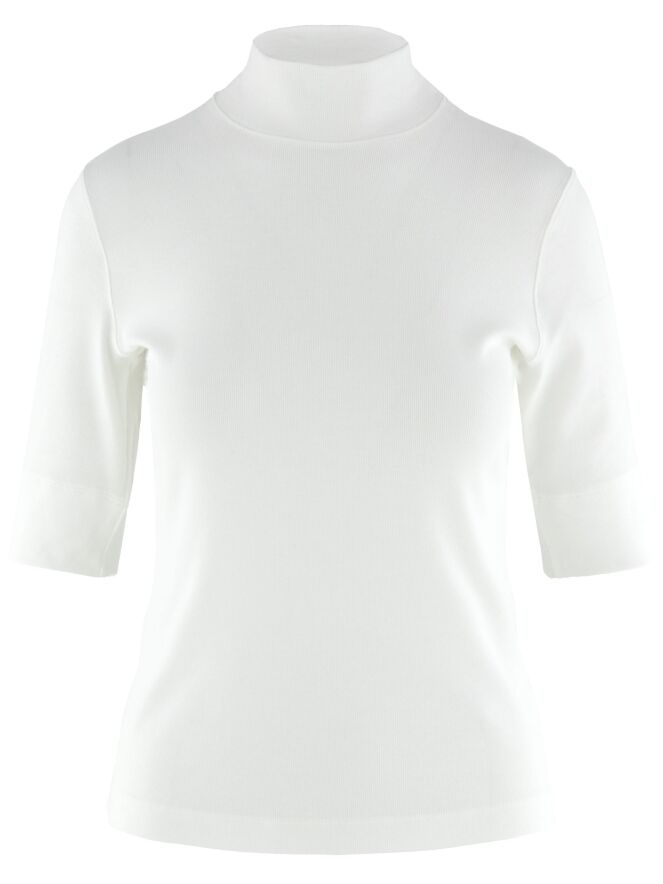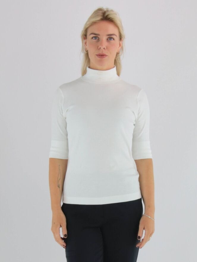 Een shirt van Marc Cain in een roomwitte kleur. De stof is fijn geribbeld. Het shirt heeft een turtle hals, korte mouwen en mag op 30 graden worden gewassen.