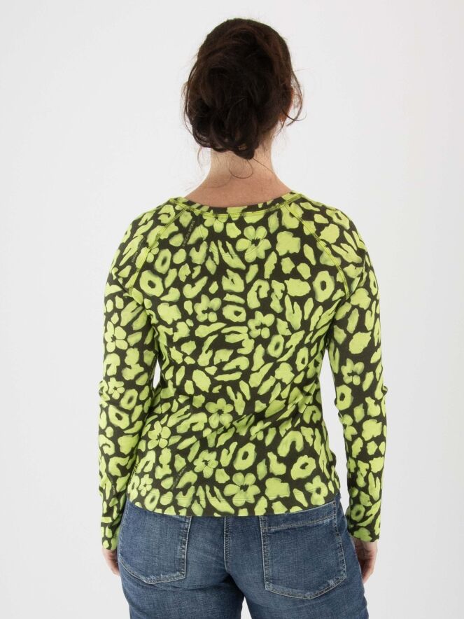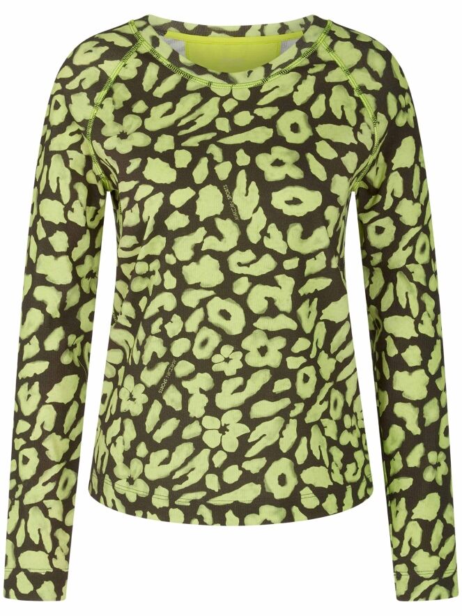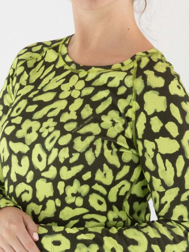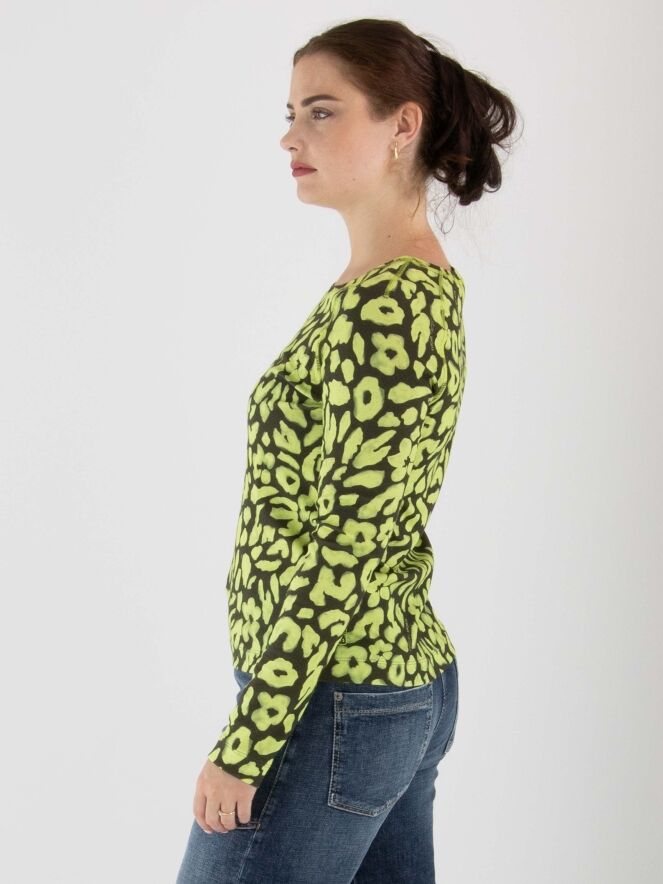 Een shirt van Marc Cain in een panterprint met de kleuren limoengroen en olijfgroen. Het shirt heeft een ronde hals en lange mouwen. Dit shirt mag op 30 graden worden gewassen.