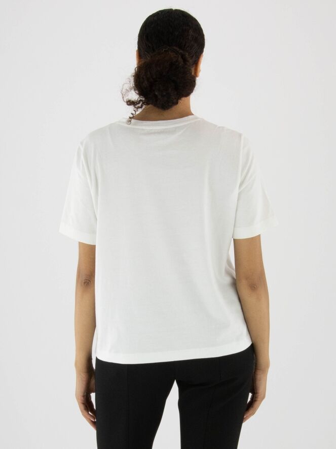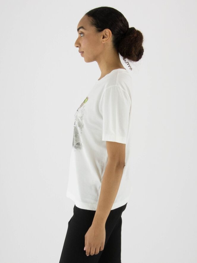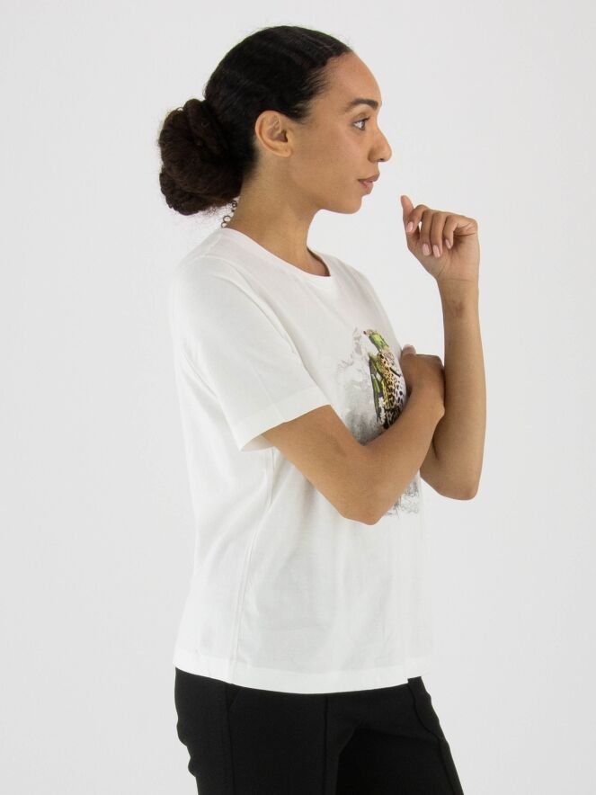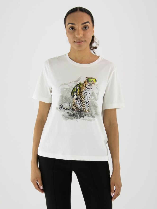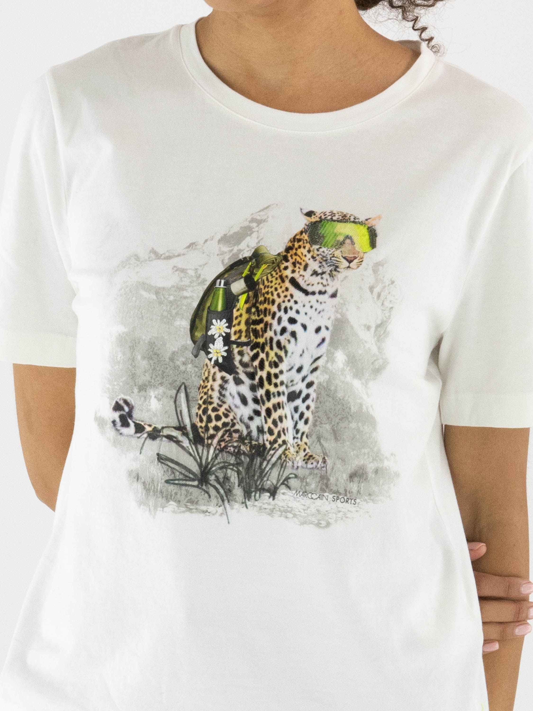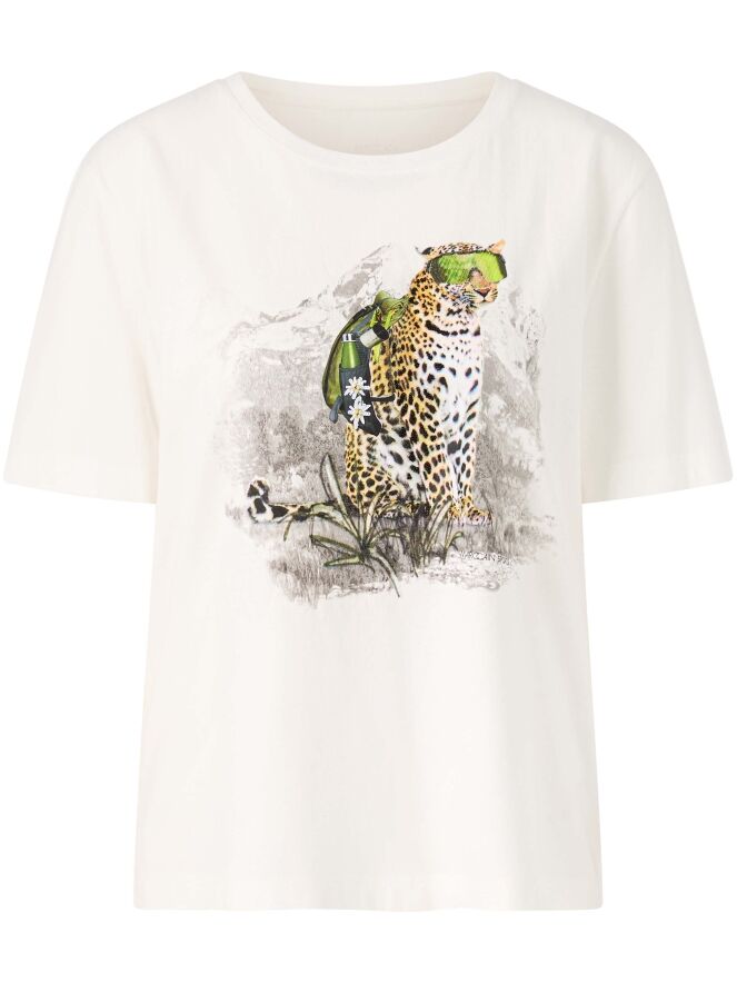 Een shirt van Marc Cain in de kleur roomwit met op de voorkant een print van een luipaard met een zonnebril. Het shirt heeft korte mouwen en een ronde hals. Dit shirt mag op 30 graden worden gewassen.