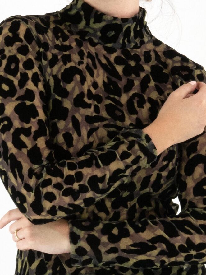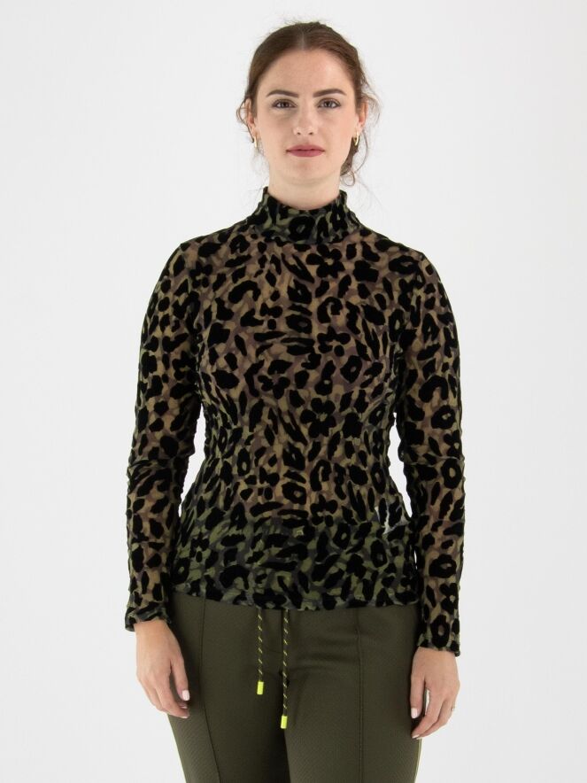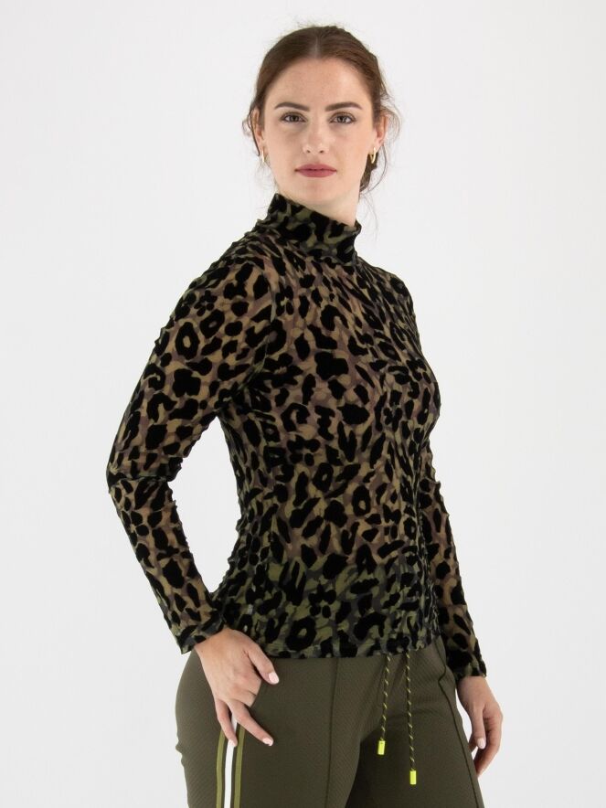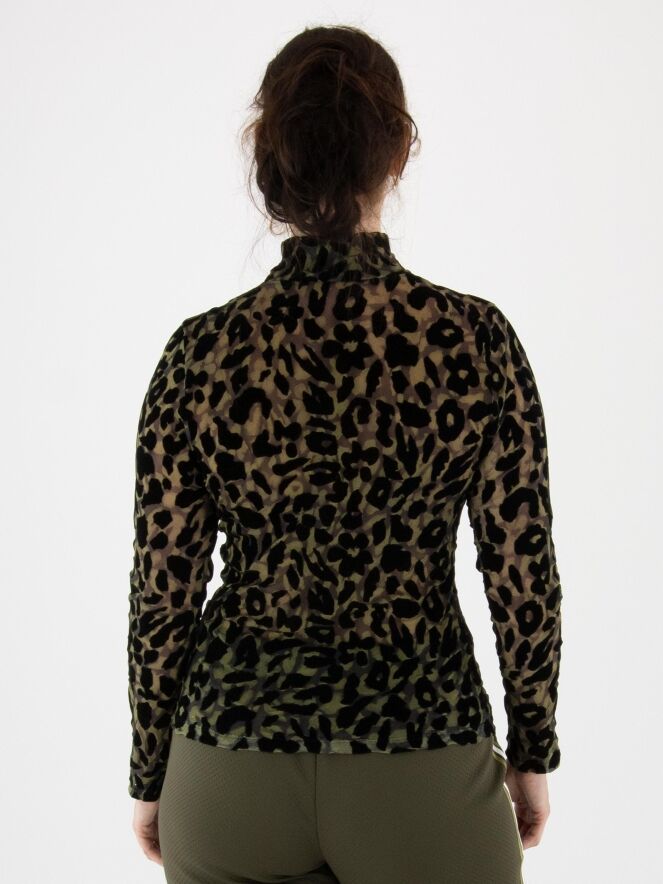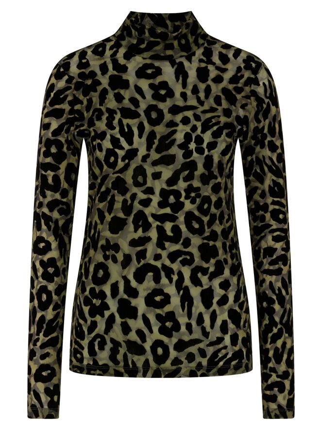 Een licht transparant shirt van Marc Cain in een luipaardprint met meerdere tinten olijfgroen en zwart. Het shirt heeft een turtle hals en lange mouwen. Dit shirt mag op 30 graden worden gewassen.