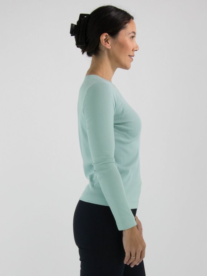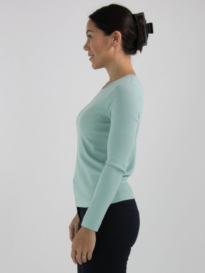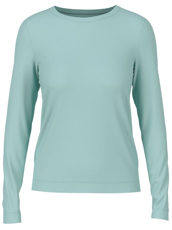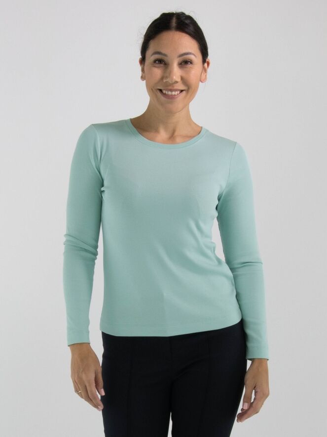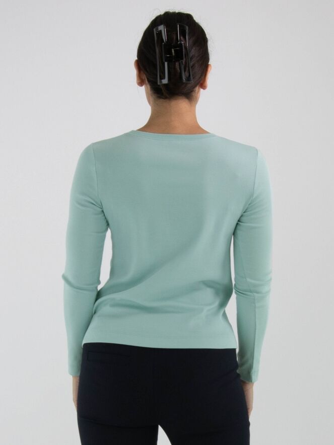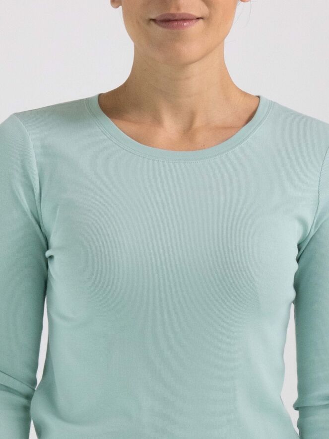 Een fijn geribbeld shirt van Marc Cain in de kleur turquoise. Het shirt heeft een ronde hals en lange mouwen. Dit shirt kan op 30 graden worden gewassen.